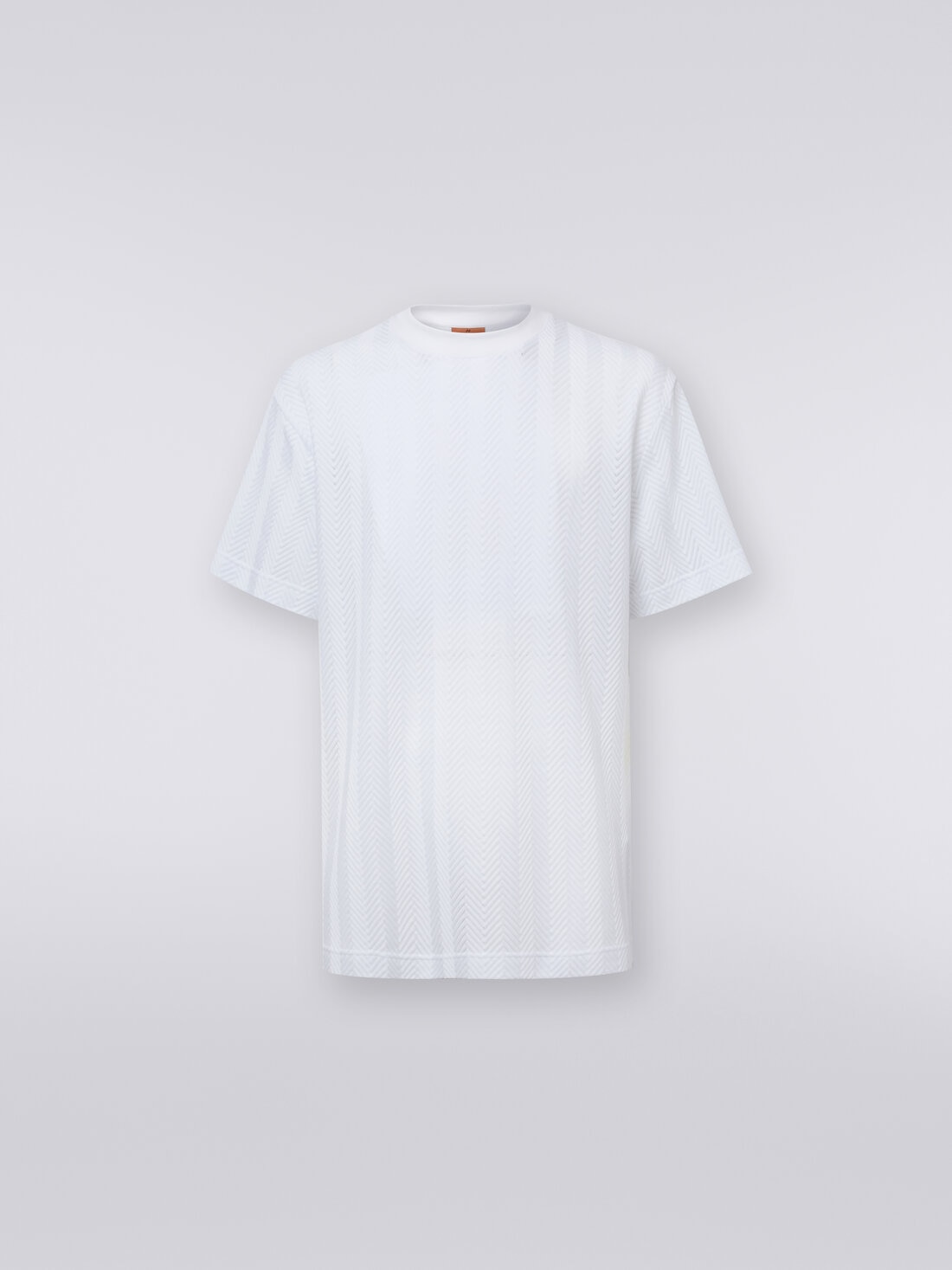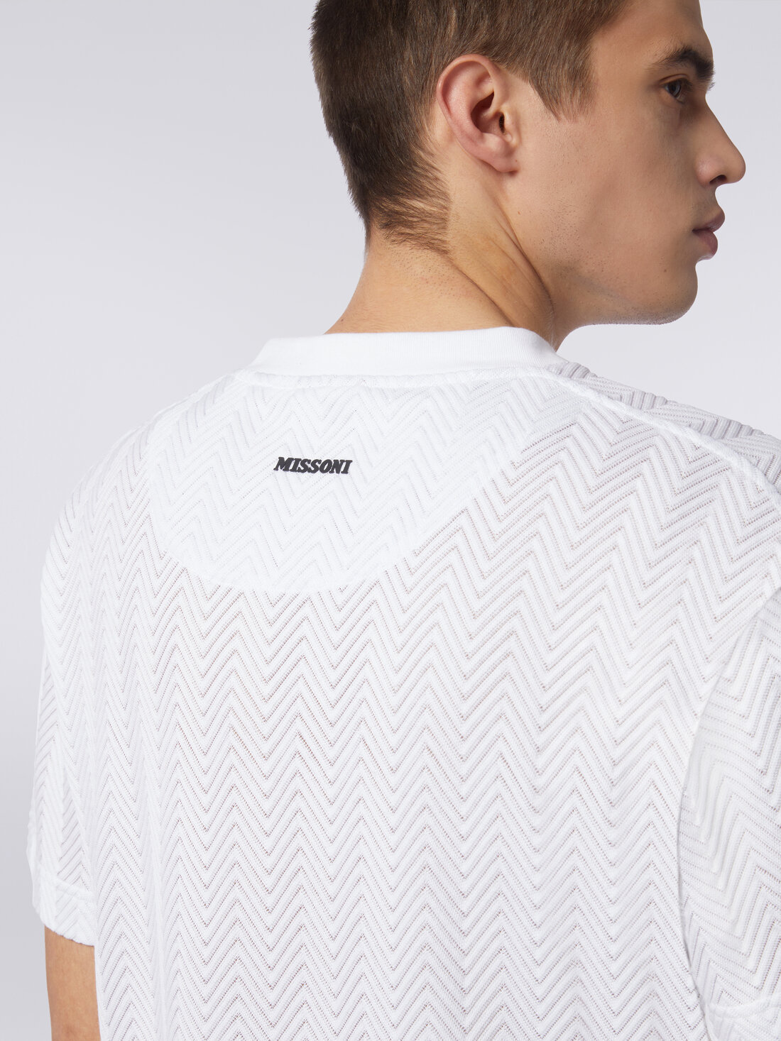 La camiseta masculina de manga corta y cuello redondo, prenda básica por excelencia, se transforma gracias al toque Missoni en una prenda con un encanto garantizado, gracias al motivo en zigzag tono sobre tono que la recorre.