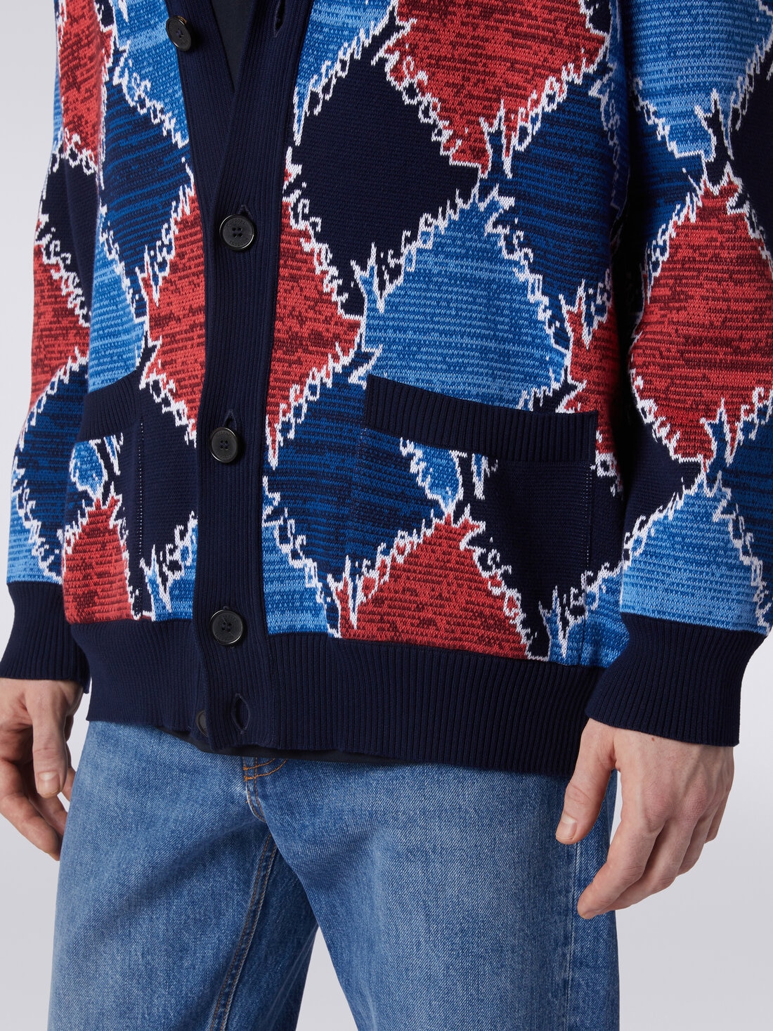 Cárdigan para hombre de algodón puro con un toque contemporáneo inspirado claramente en los noventa. El modelo, en punto confeccionado con la técnica jacquard, se caracteriza por un estampado de rombos y ribetes en color liso. Personalizada aún más por la inscripción repetida del logotipo, esta prenda expresa a la perfección la herencia de la marca.