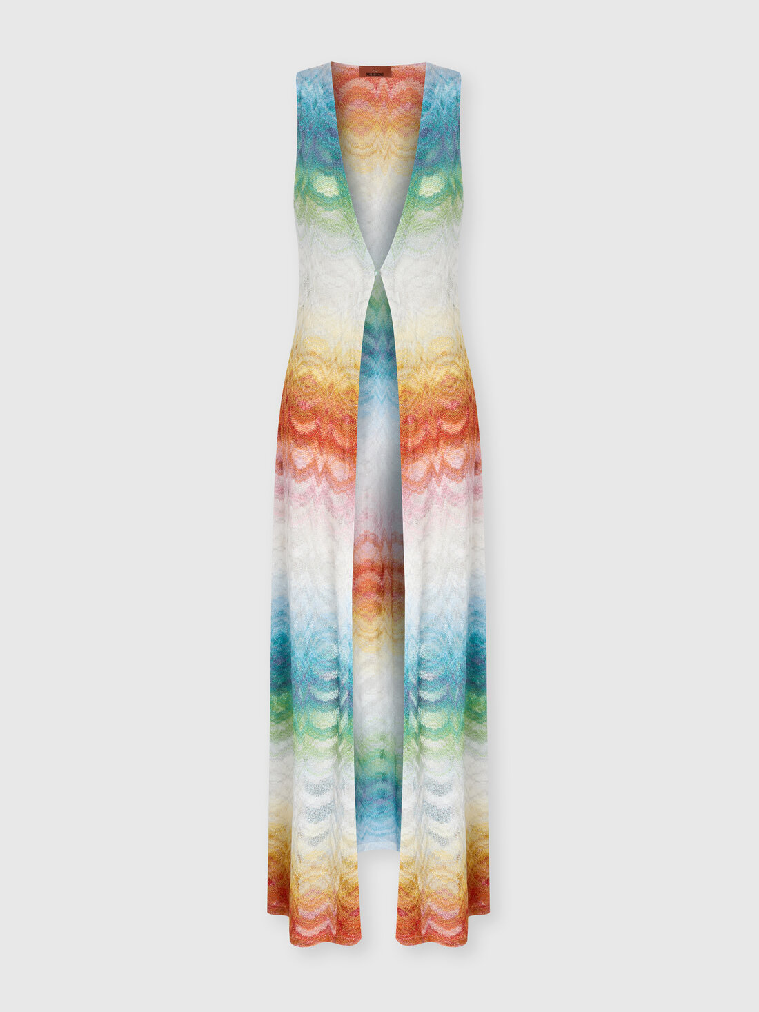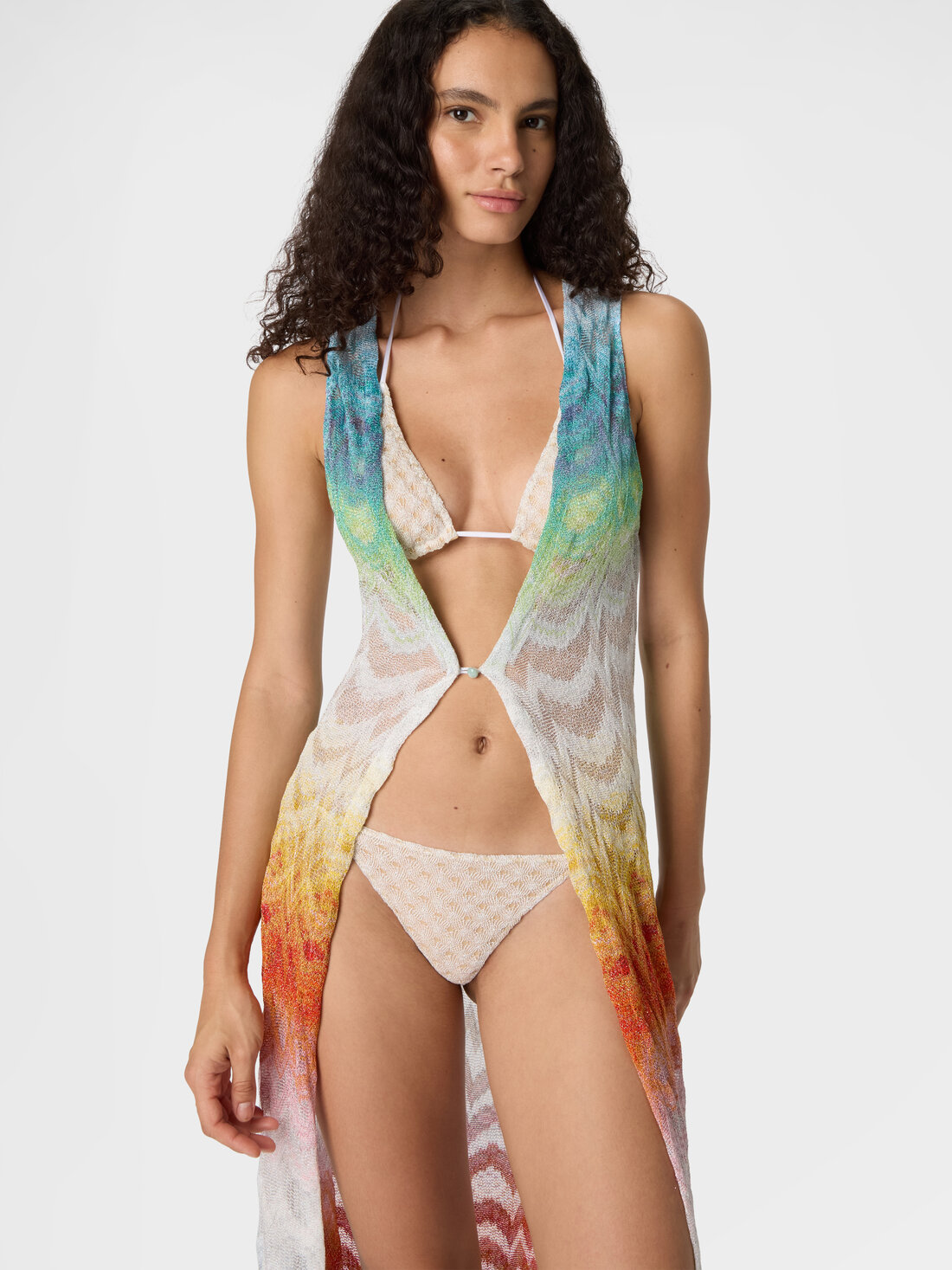 Un juego de líneas y transparencias da vida a este chaleco largo de playa para mujer en viscosa lamé degradada, realizado con trabajo raschel de motivo ondulado. Una prenda que capta la luz y expresa la elegancia refinada de la maison.