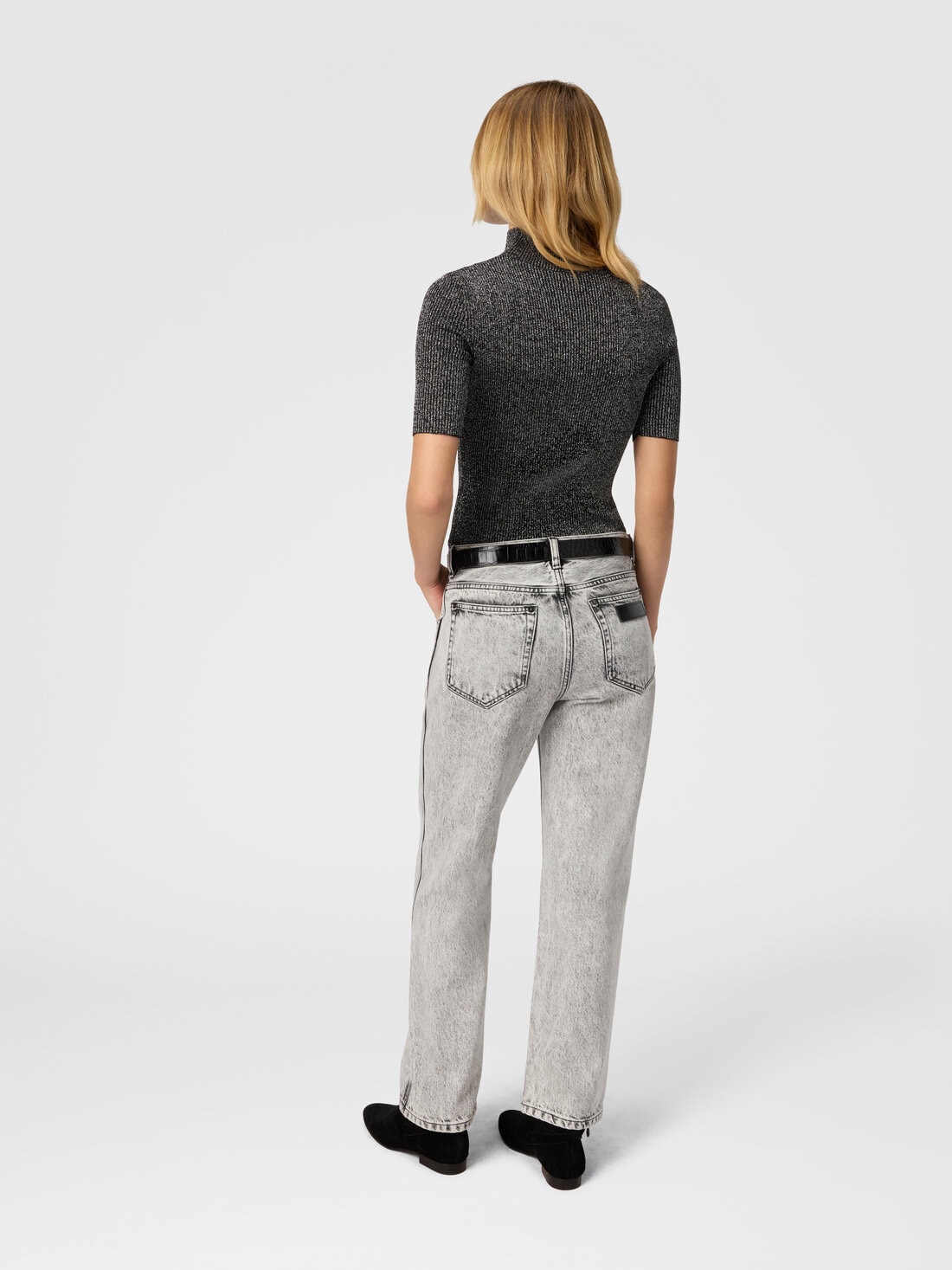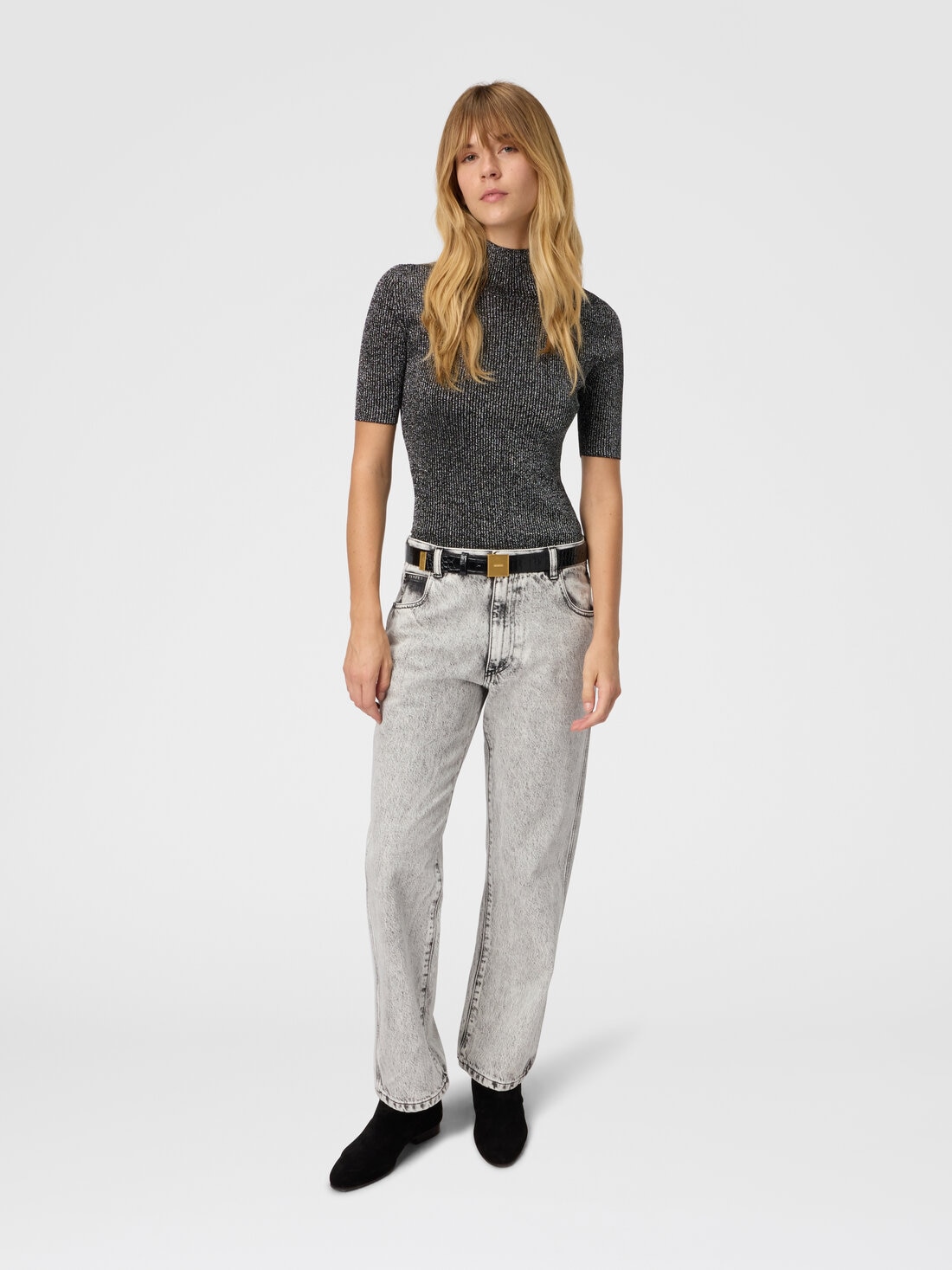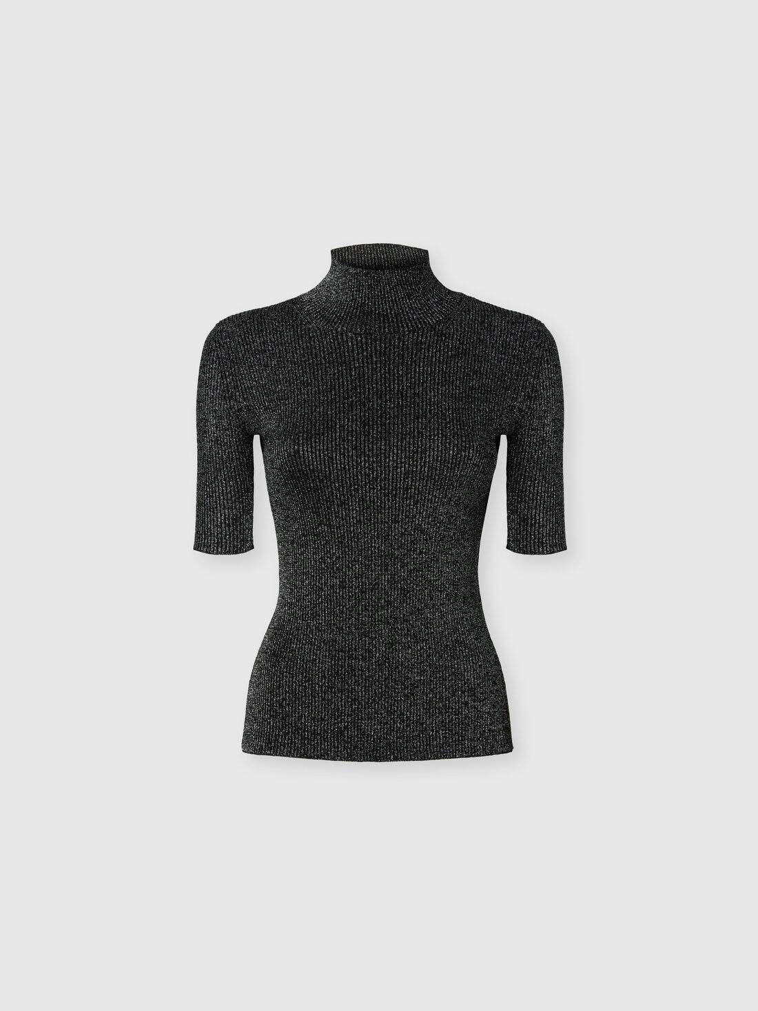 Perfecto como base para los looks de temporada, este jersey de cuello alto y manga corta para mujer en mezcla de viscosa y lana presenta una refinada confección vanisé enriquecida con sutiles hilos lamé. El resultado es una prenda versátil y luminosa, ideal para añadir un toque de discreta elegancia a cualquier conjunto.