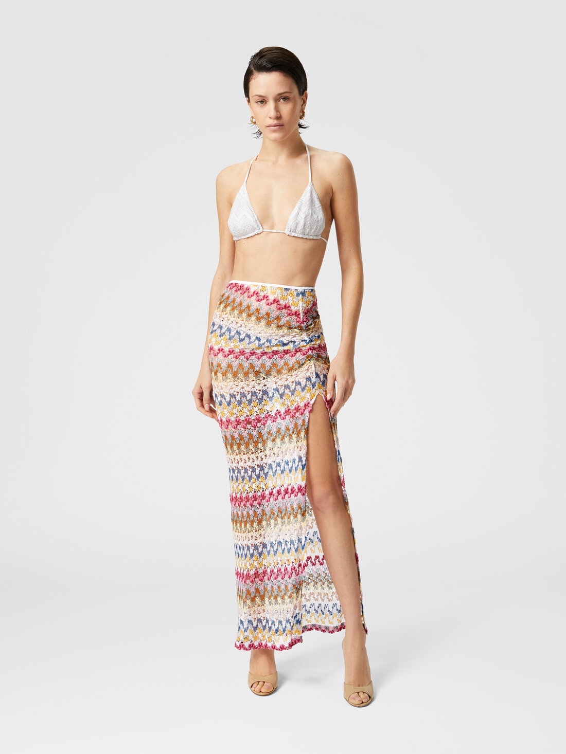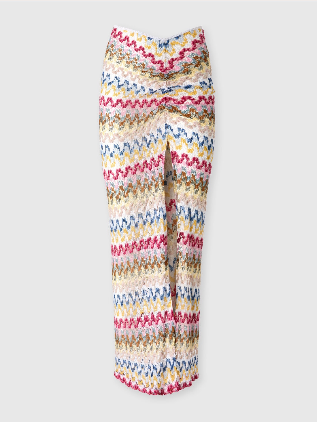 La falda larga de encaje de viscosa lamé se posa sobre la figura con la fluidez de un velo de seda al viento. El modelo, enriquecido con un delicado fruncido, está adornado con un patrón en zigzag. El diseño elegante y liviano crea un efecto de sofisticación refinada, realzando cada movimiento con un toque de color.
