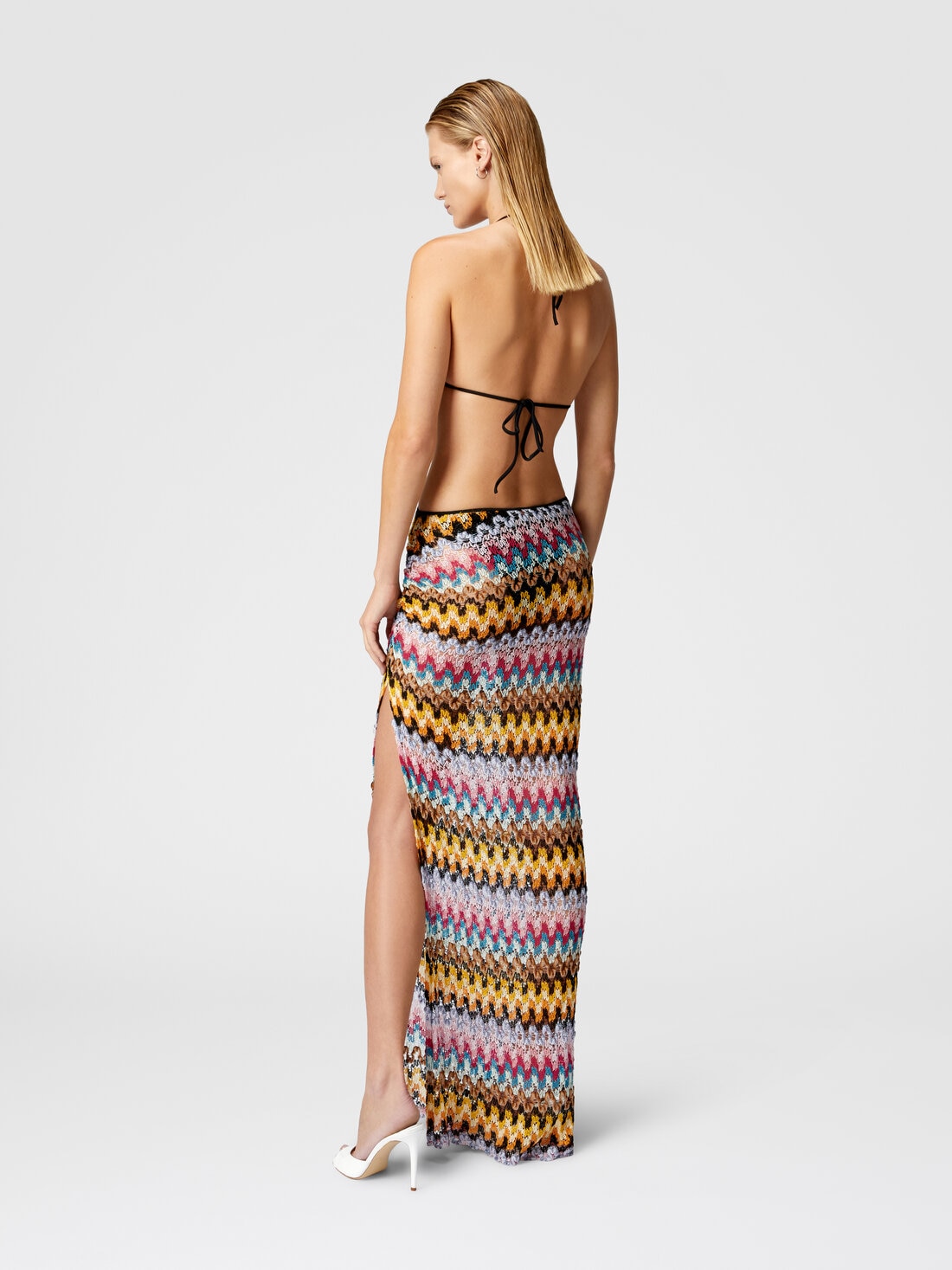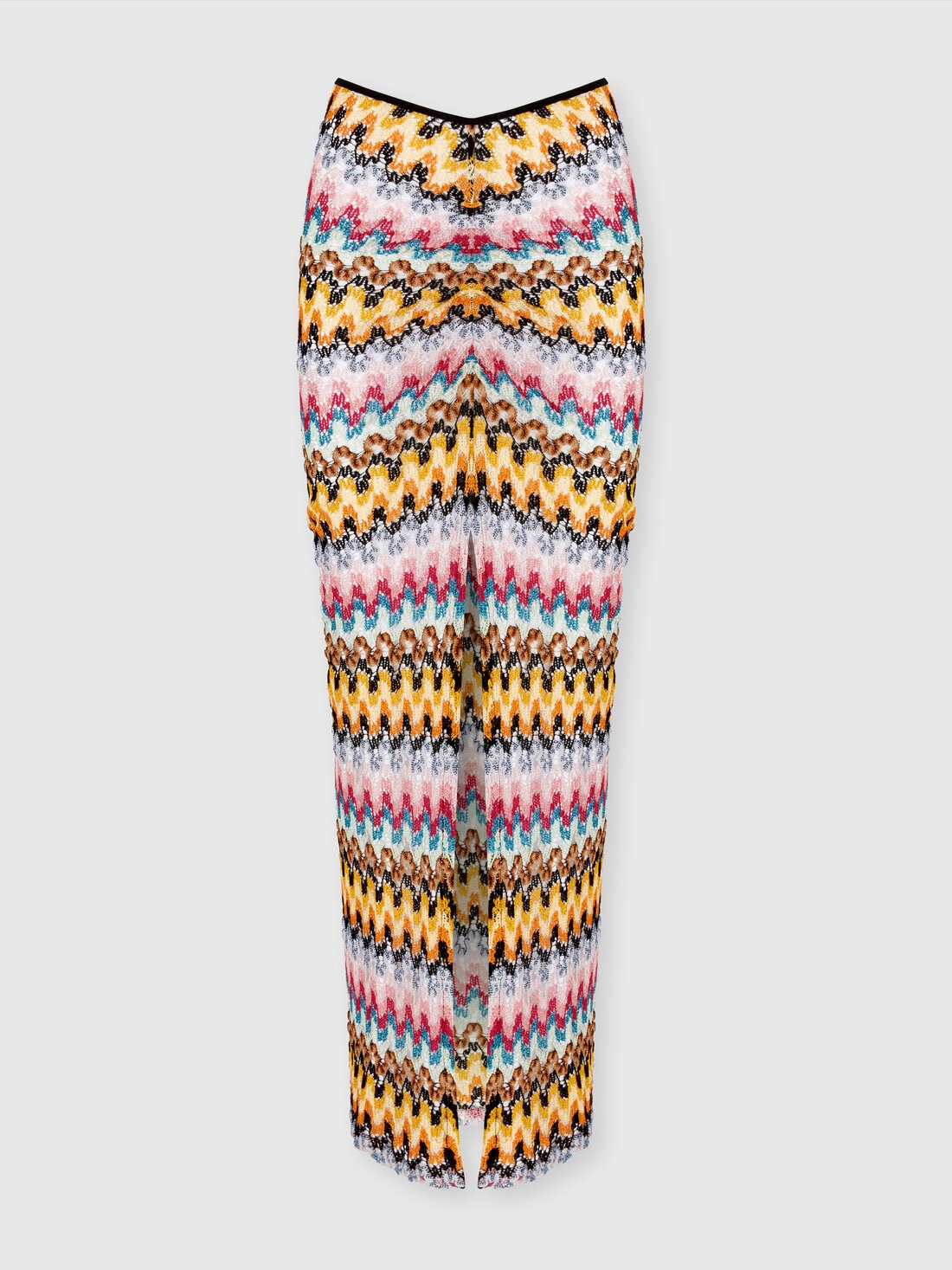 La falda larga de encaje de viscosa lamé se posa sobre la figura con la fluidez de un velo de seda al viento. El modelo, enriquecido con un delicado fruncido, está adornado con un patrón en zigzag. El diseño elegante y liviano crea un efecto de sofisticación refinada, realzando cada movimiento con un toque de color.