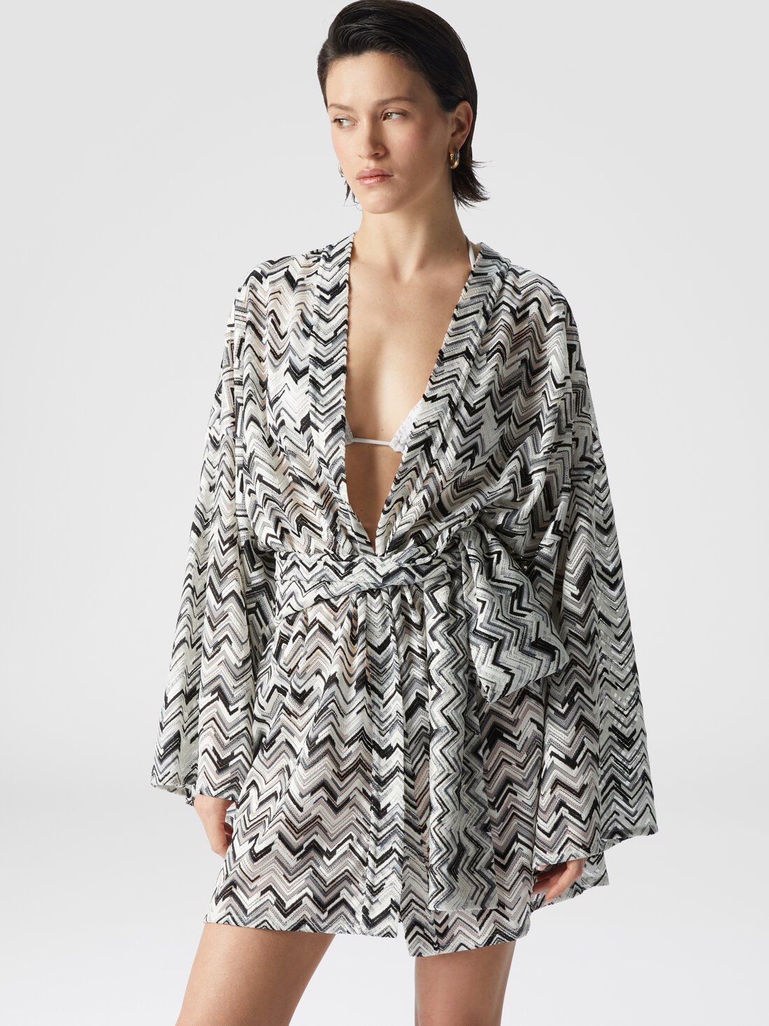 Un refinado entrelazado de hilos preciosos da vida a este kimono encubridor de mezcla de viscosa, donde el motivo en zigzag flameado toma forma en un juego de luz y color. La suavidad del tejido se une a la ligereza, mientras que el cinturón define una silueta natural.