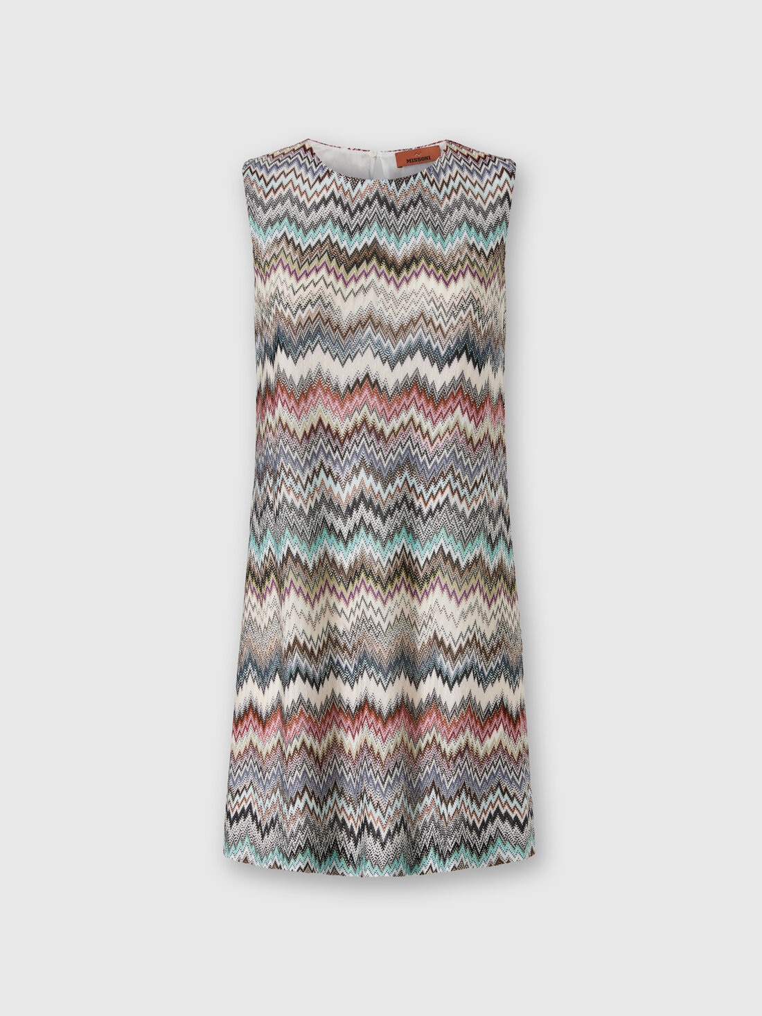 Con alma gráfica y femenina, este vestido corto sin mangas con cuello redondo para mujer está confeccionado en pura viscosa con una refinada elaboración raschel. El motivo snake, que evoca el icónico zig zag de Missoni, aporta un toque distintivo y moderno, perfecto para un estilo decidido pero sofisticado.