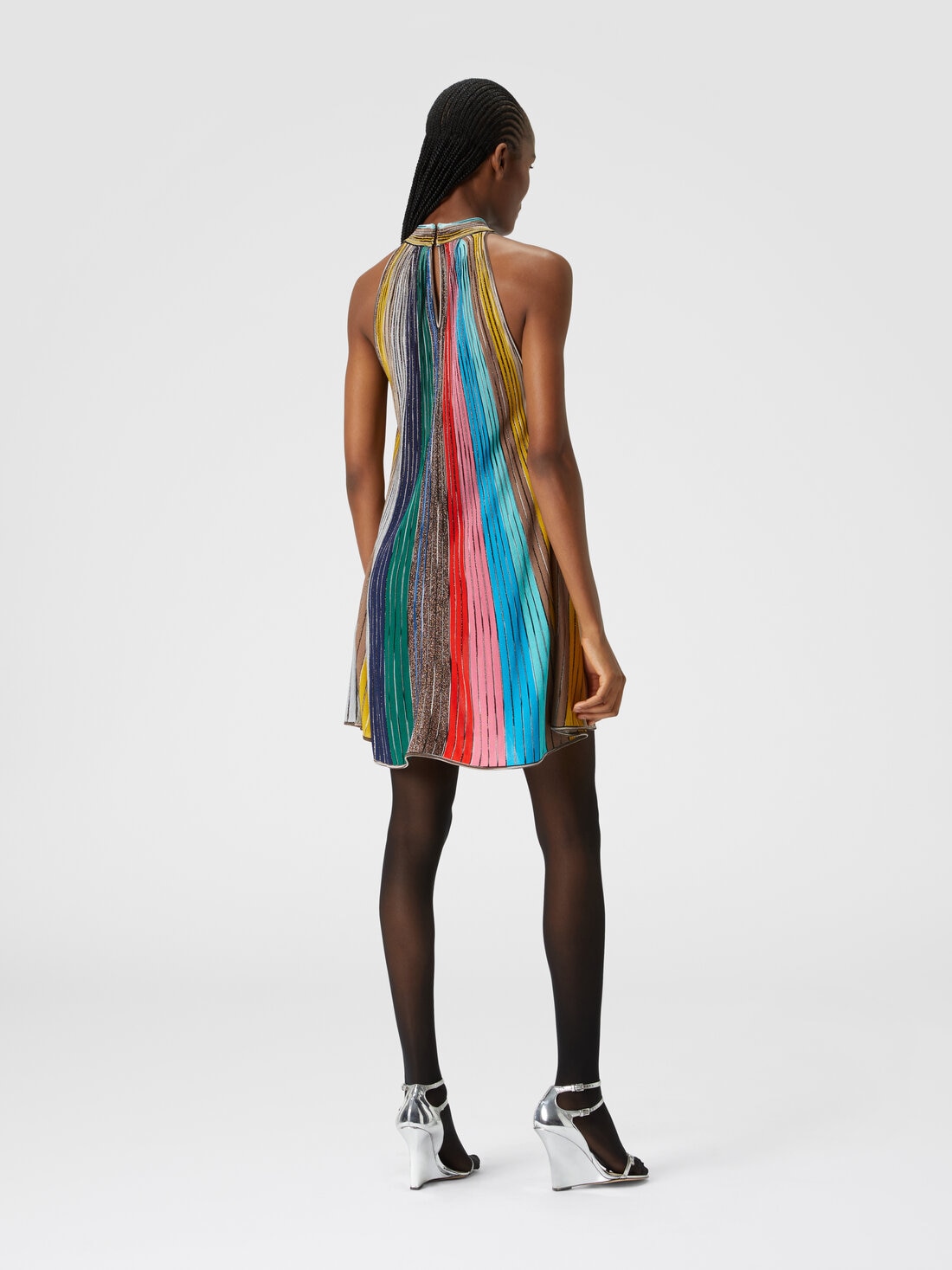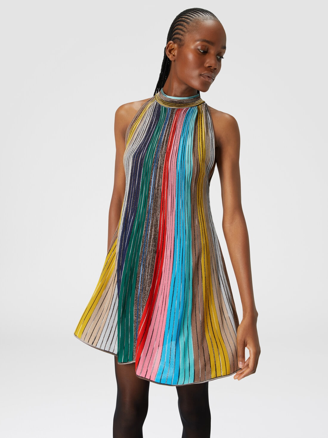 El minivestido sin mangas con escote halter adquiere una alegría contagiosa gracias al estampado de rayas en punto de viscosa flameada. Los destellos brillantes del hilo lamé le dan un toque brillante a esta prenda perfecta para noches especiales.