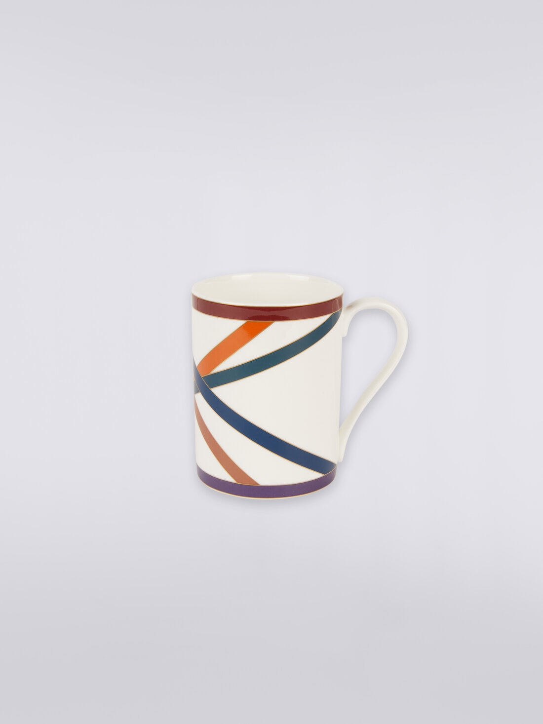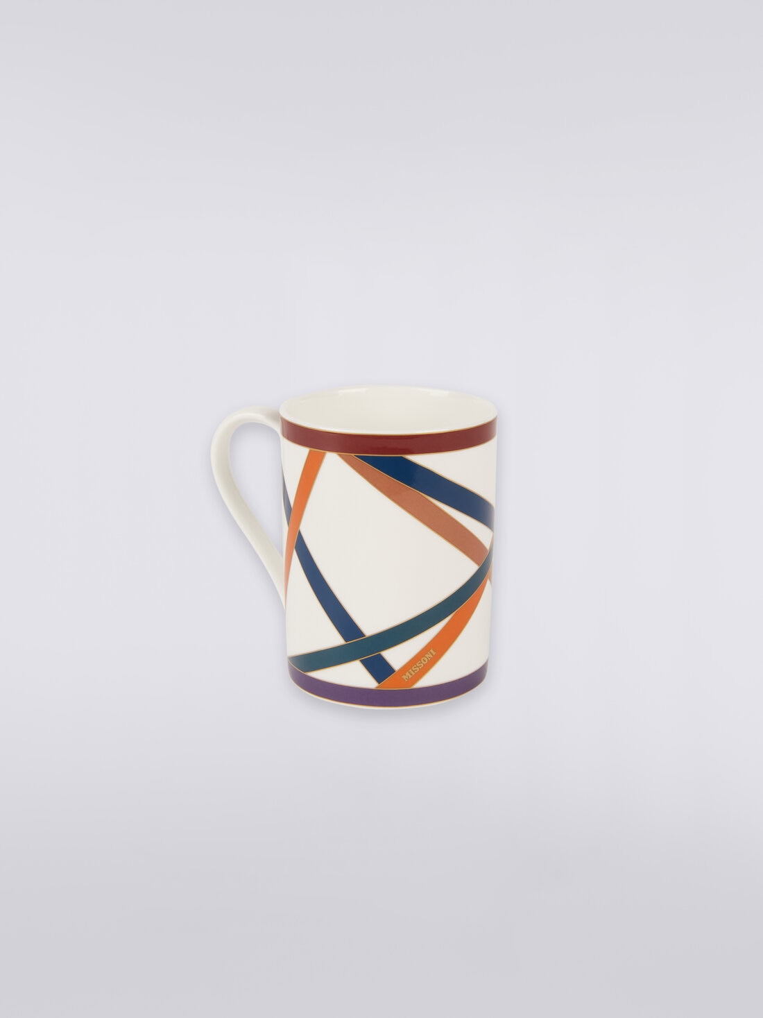 MissoniHome transforma un momento cotidiano, como el de disfrutar de un momento de relajación mientras saborea su bebida favorita, en un gesto refinado. Prueba de ello es la taza con el motivo Nastri, con inscripción del logotipo y filigrana dorada.