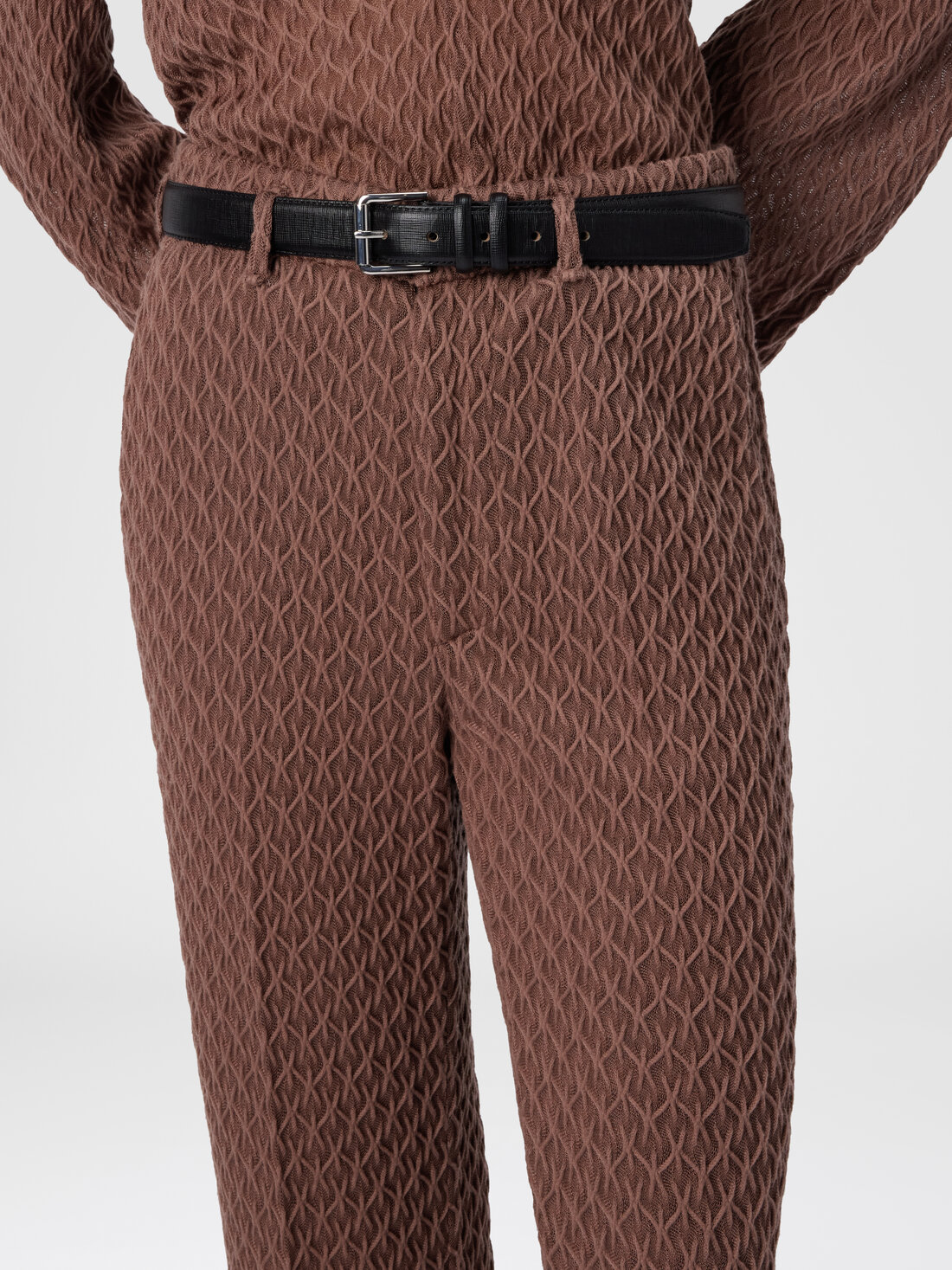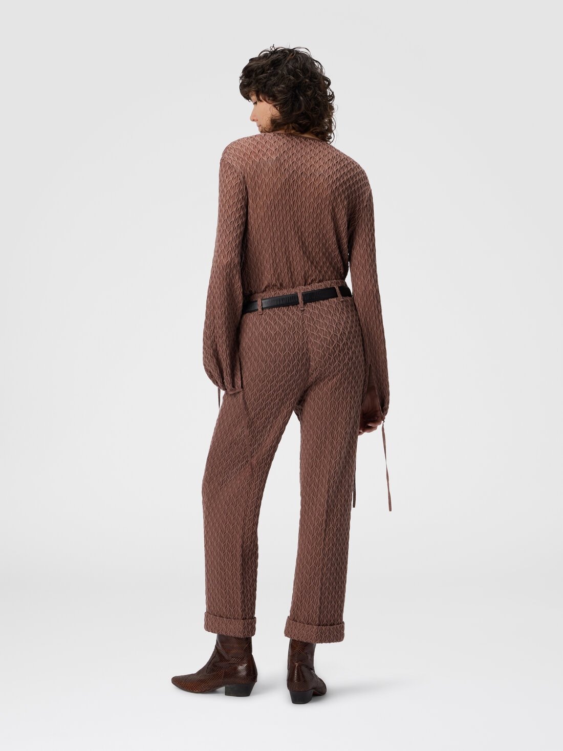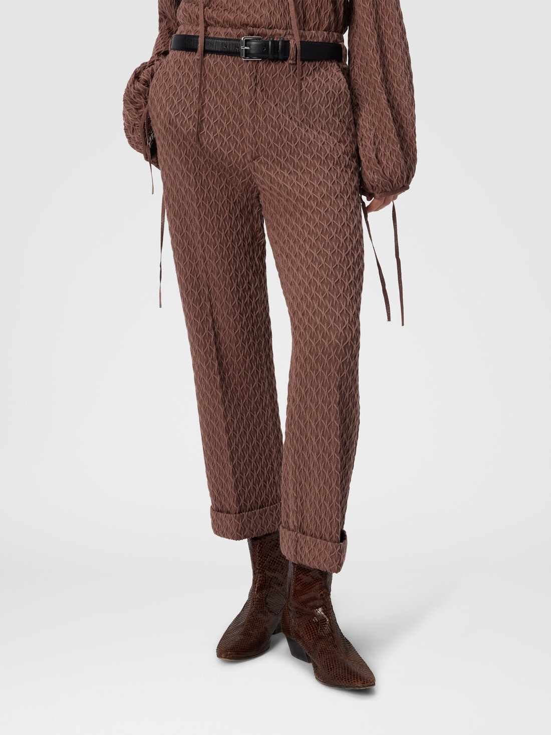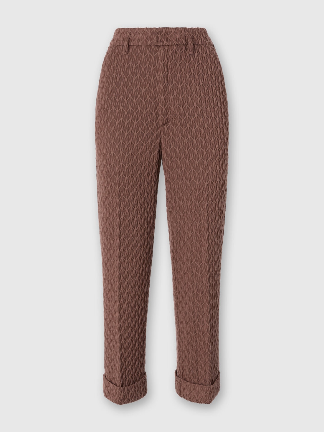 Pantalón entallado con vuelta para mujer que une elegancia y estructura, confeccionado con una técnica raschel en encaje acanalado. La mezcla de lana y viscosa aporta a la prenda una textura rica y refinada, para un look sofisticado con un toque de originalidad.