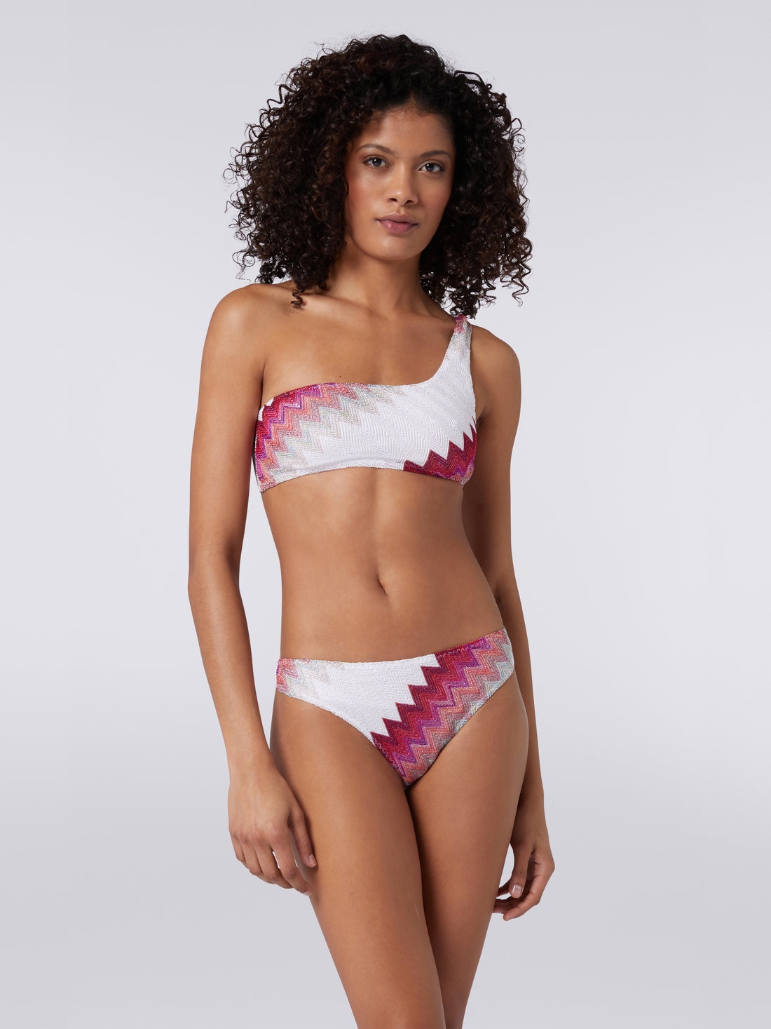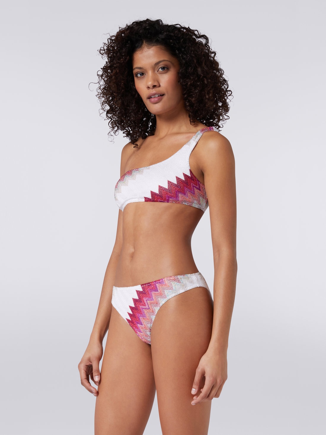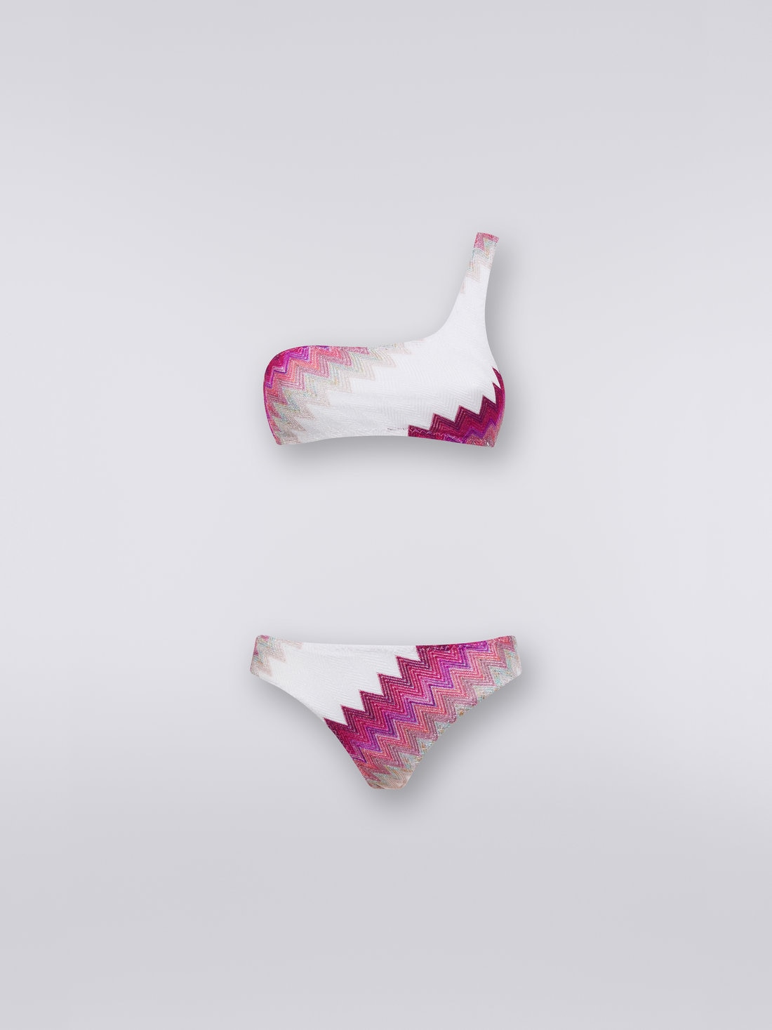 Decorado con un zigzag degradado iluminado por los reflejos metálicos del lamé, este bikini para mujer está confeccionado en punto de mezcla de viscosa elástica y se caracteriza por el corte de un solo hombro de la parte superior, que se superpone a una braguita clásica alta.