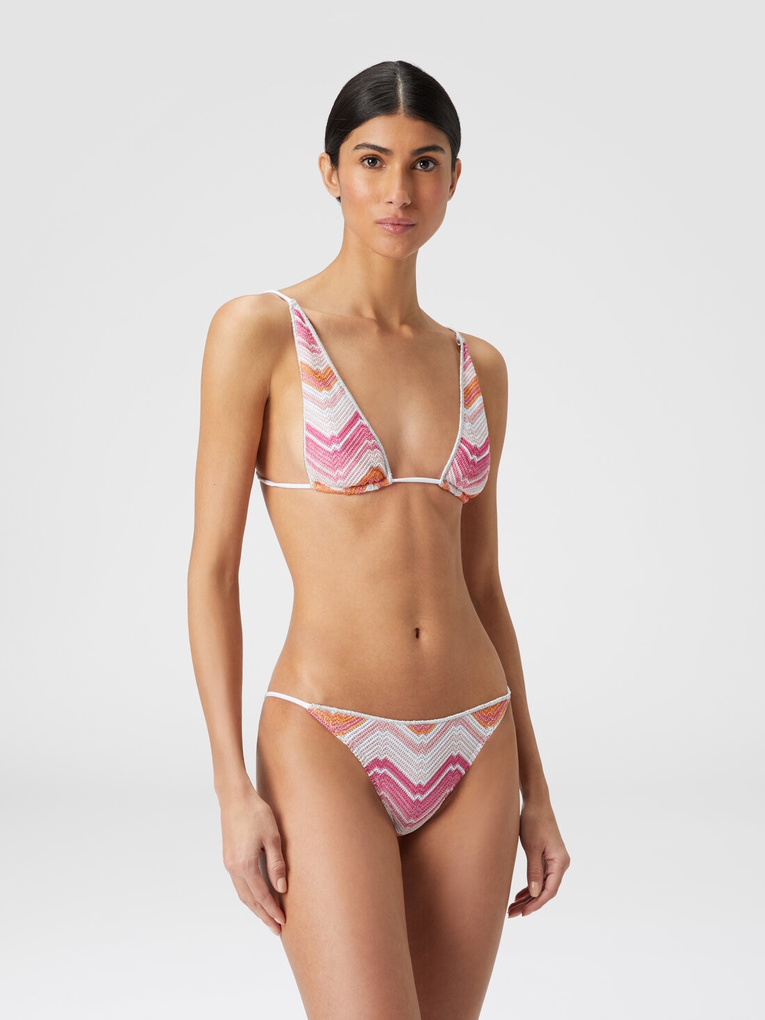 El bikini de mujer Missoni se compone de un sujetador triangular y una braguita de cintura baja, donde la confección raschel matizada con hilos de lúrex les confiere un brillo inconfundible. Versatilidad y feminidad audaz se unen armoniosamente en este imprescindible del verano.