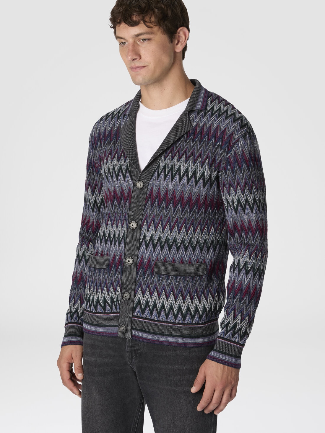 Envolvente y con mucho carácter, este cárdigan en lana 100% para hombre está realizado con un sofisticado trabajo raschel que da vida a un icónico motivo zig zag en relieve, para un efecto 3D matérico y dinámico. Los bordes rayados en contraste completan el diseño con un toque gráfico decidido, fusionando tradición artesanal y estilo contemporáneo.