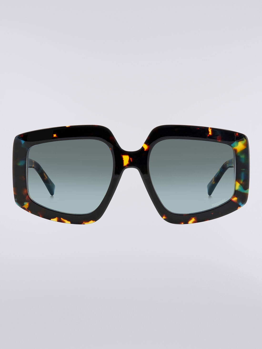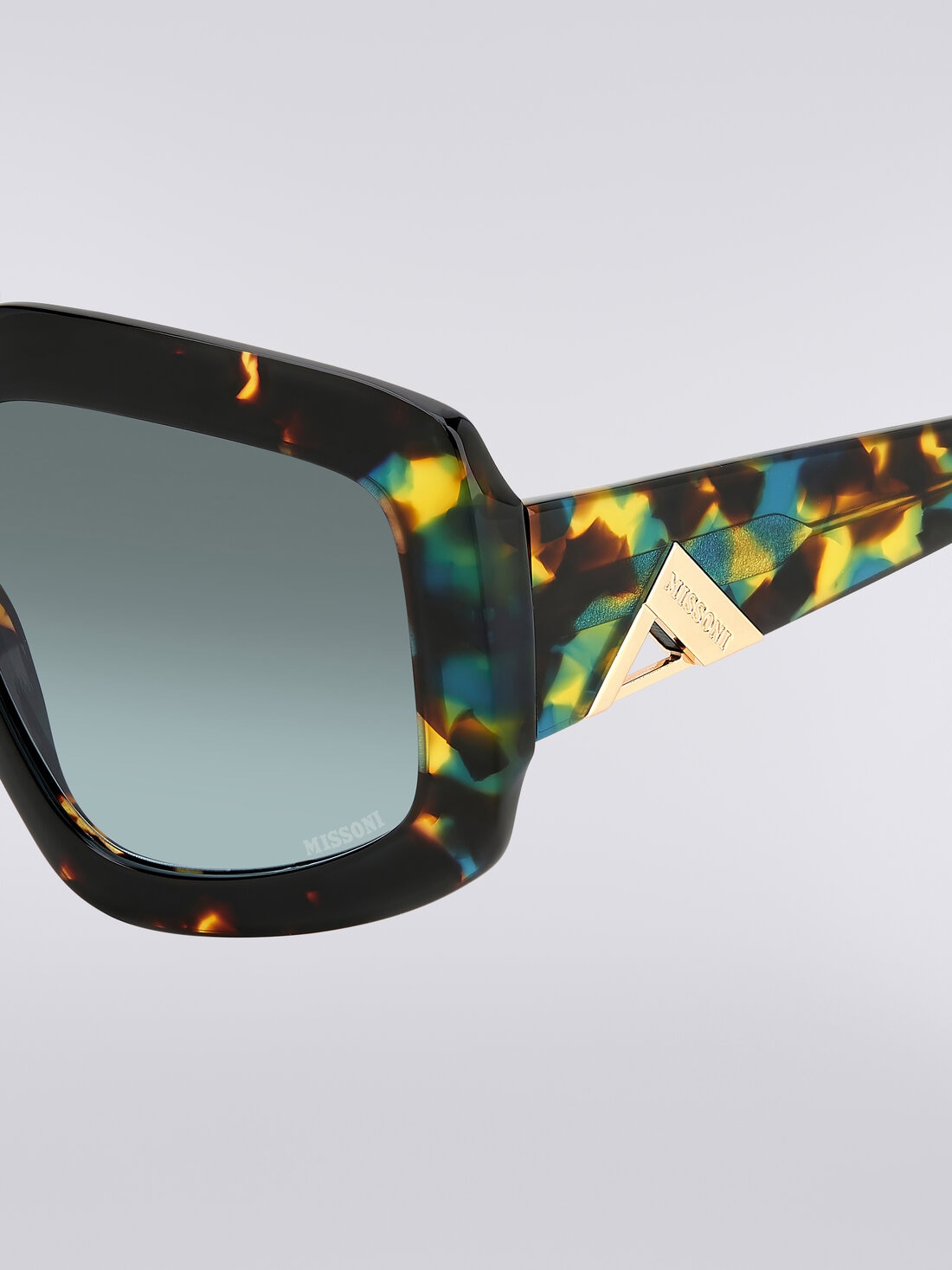 Las varillas están personalizadas con el nuevo e icónico acabado metálico triangular con el logotipo de MISSONI grabado a láser, así como con los extremos en punta de acetato con la inconfundible forma de medio zigzag.