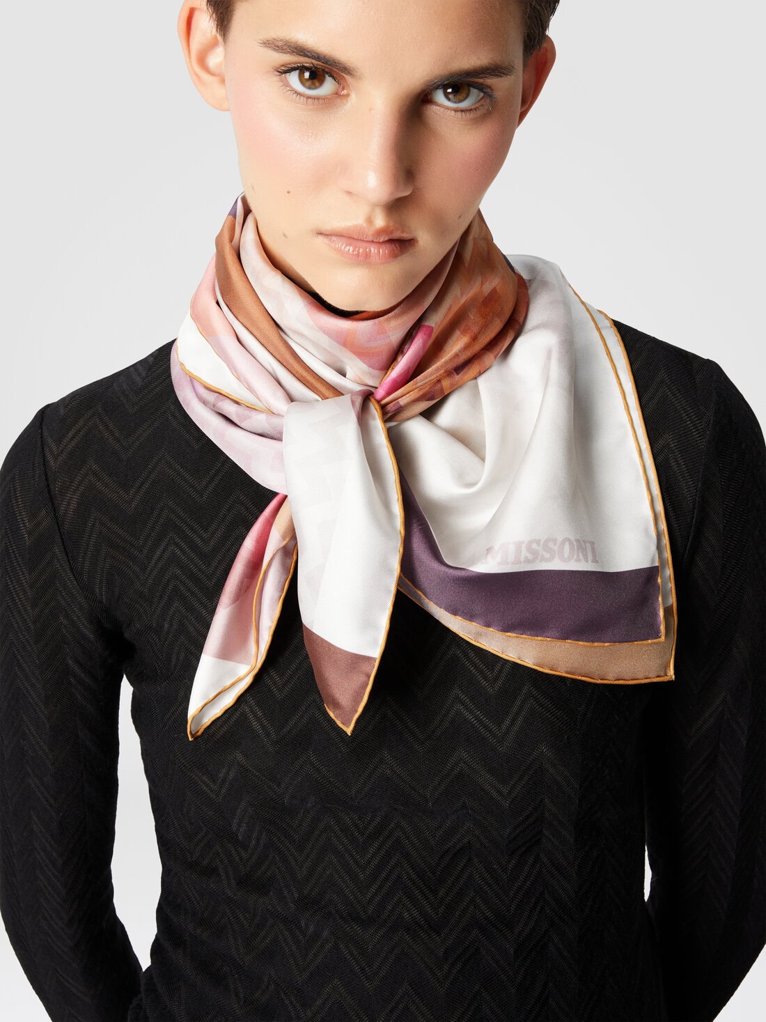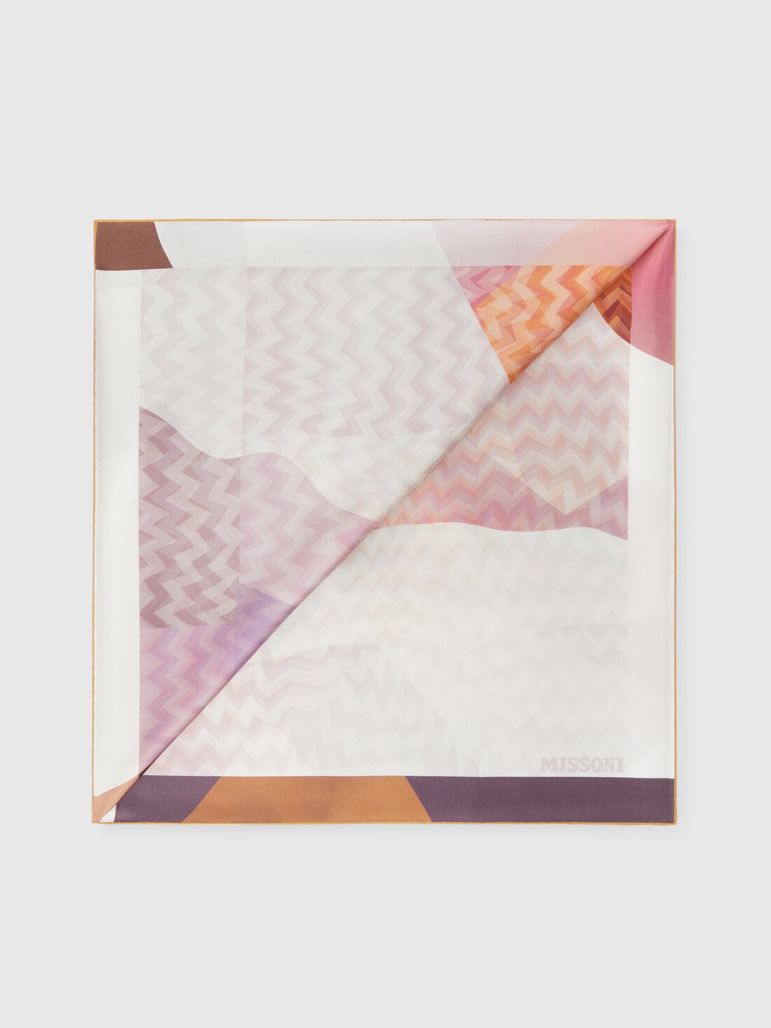 Un suave color de acuarela para el pañuelo de seda cuadrado. El estampado en zig zag, enmarcado por el borde en contraste, se personaliza con la palabra logotipo. El accesorio se completa con ribetes de color liso.