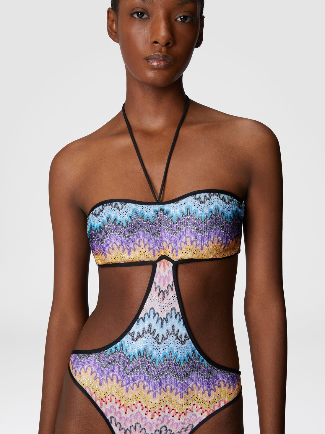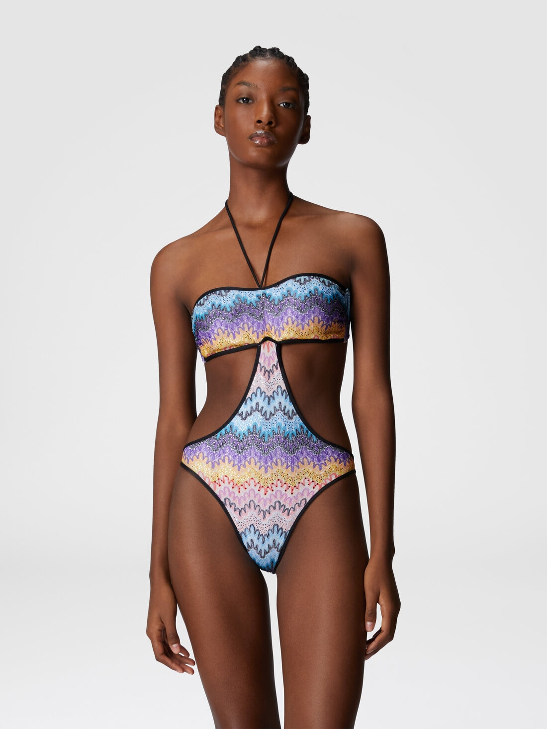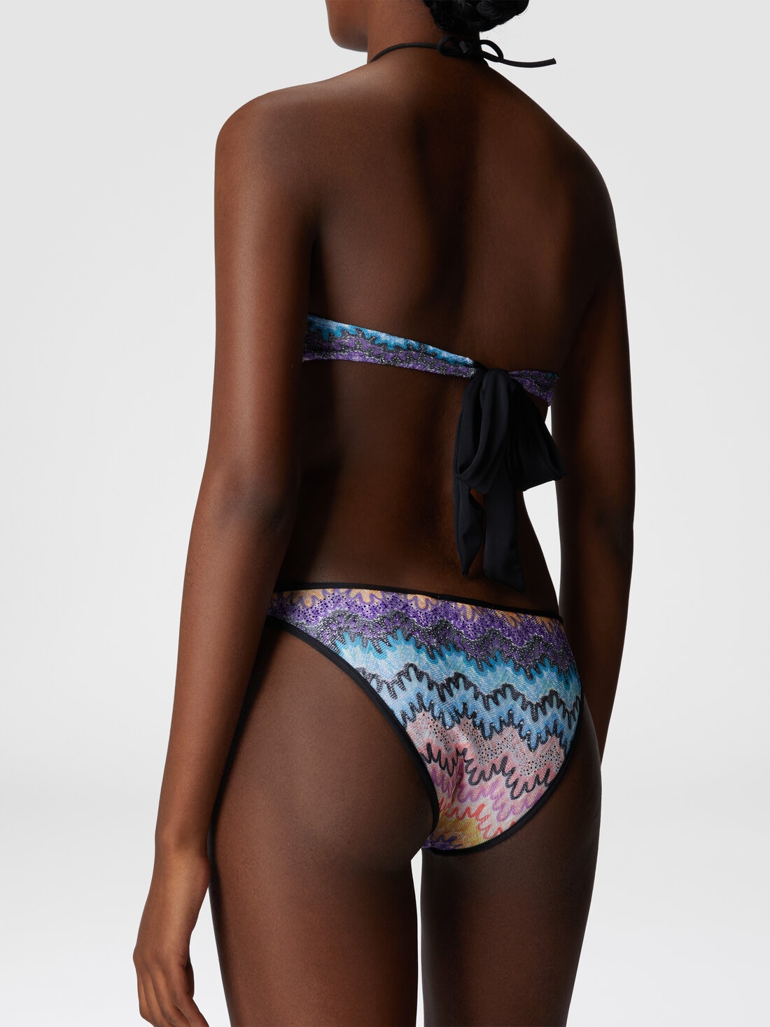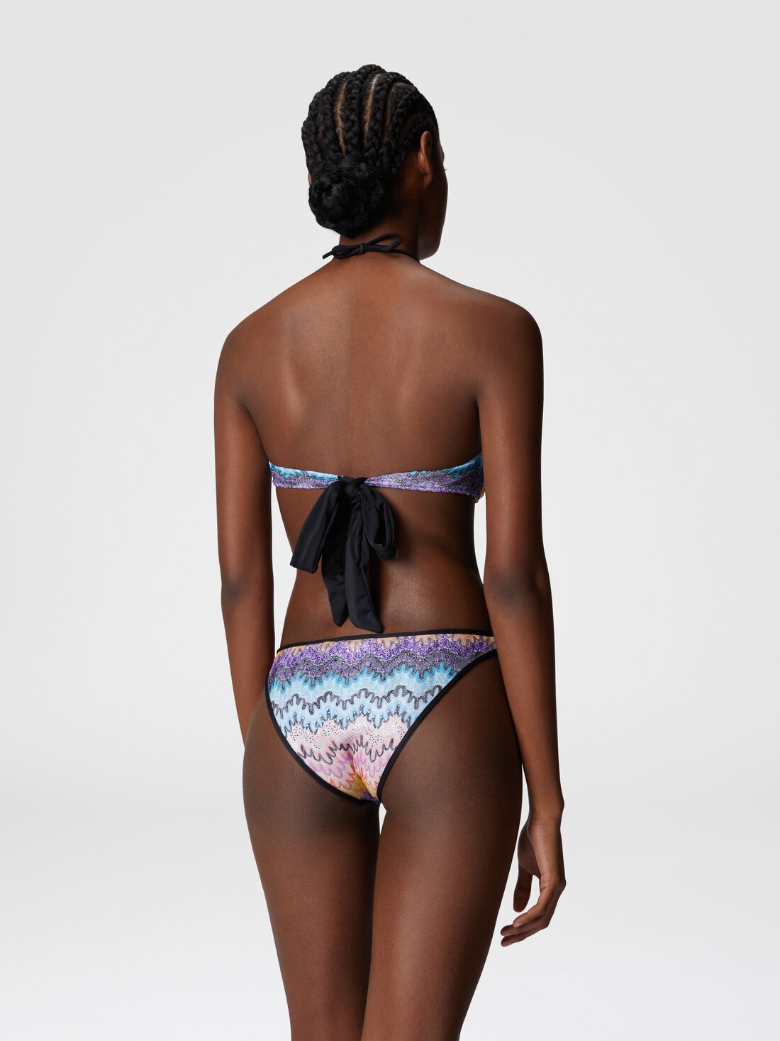 Una elegancia desenfadada define el trikini con sujetador tipo banda, caracterizado por una doble atadura detrás del cuello y en la espalda. El trabajo raschel en encaje estampado aporta un toque de sofisticación contemporánea.