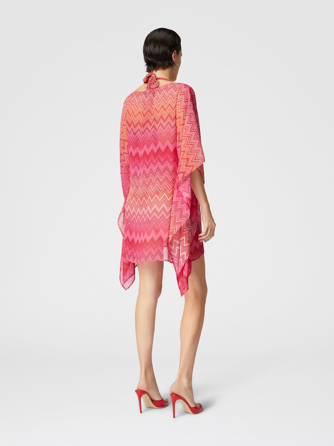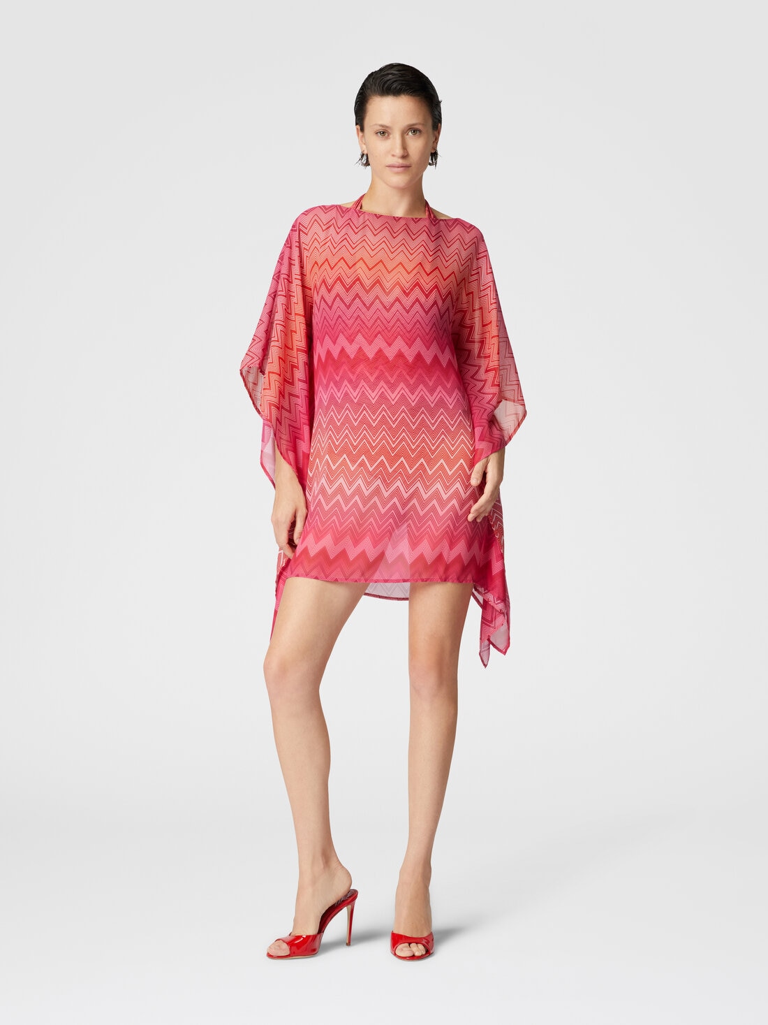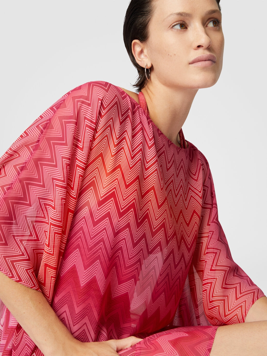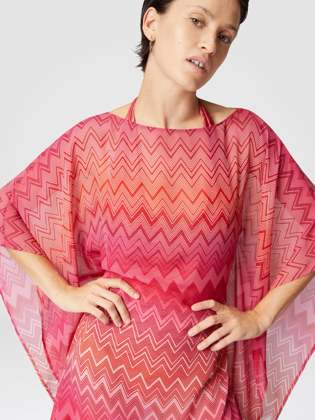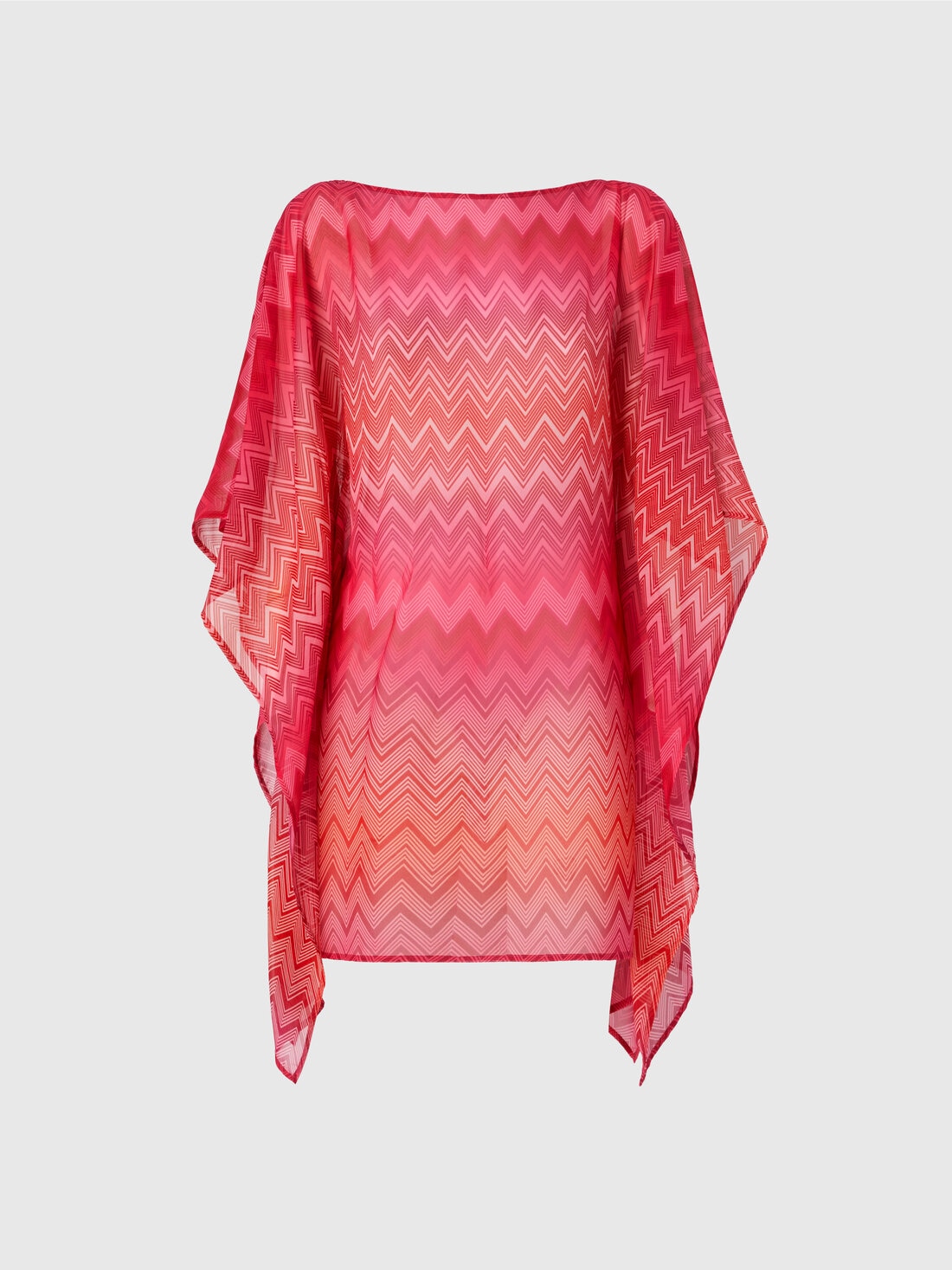 Este caftán corto, confeccionado en preciosa seda estampada, destaca por su estampado en zigzag, firma inconfundible de Missoni. Las mangas anchas y el escote en V añaden una sensación de ligereza y sofisticación, lo que lo hace perfecto para un look elegante de verano. El tejido ligero y el estampado vibrante la convierten en una prenda versátil, ideal tanto para la playa como para un look refinado de verano.