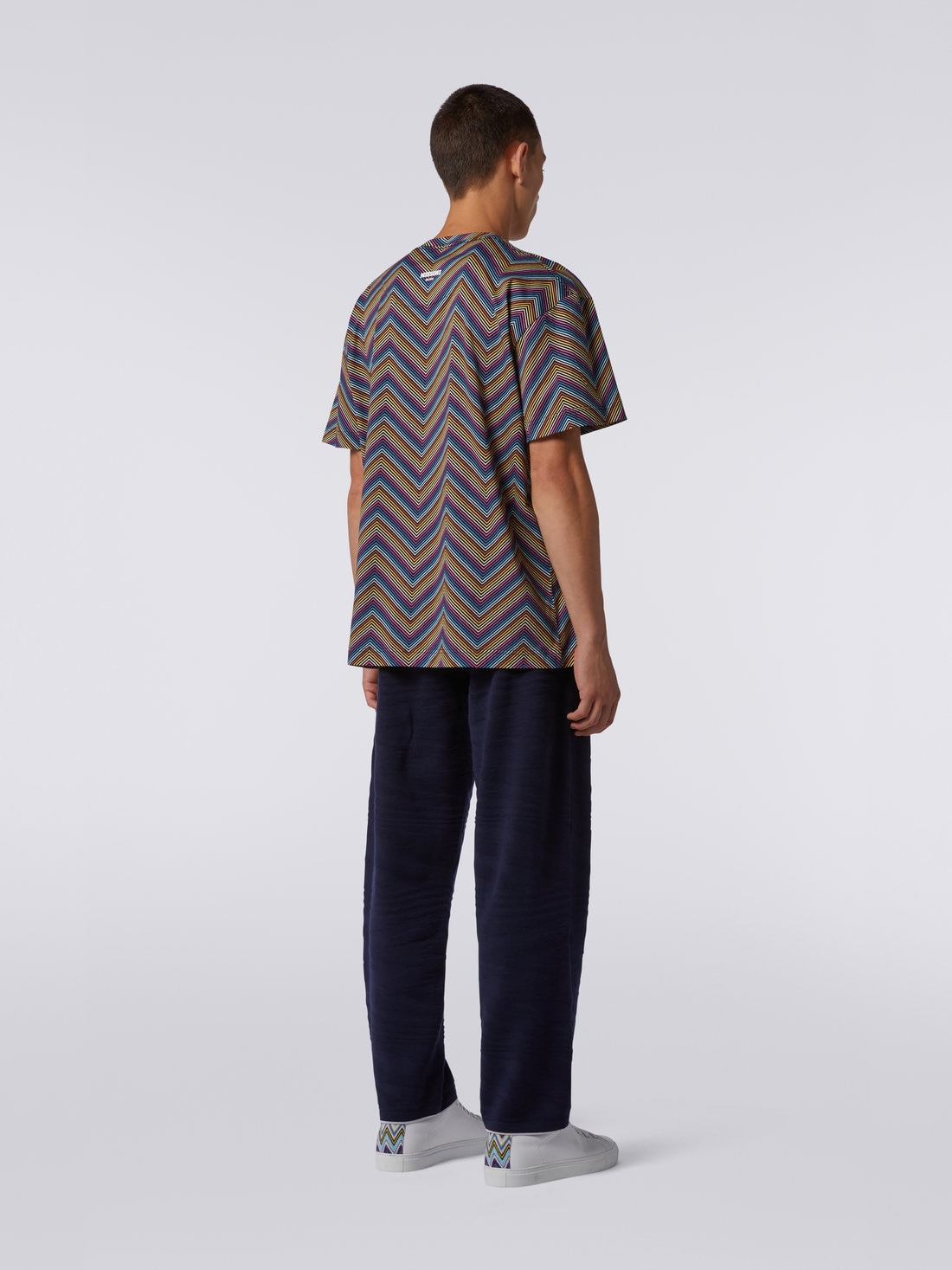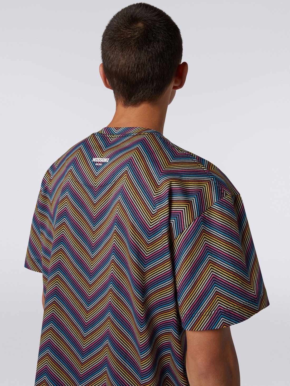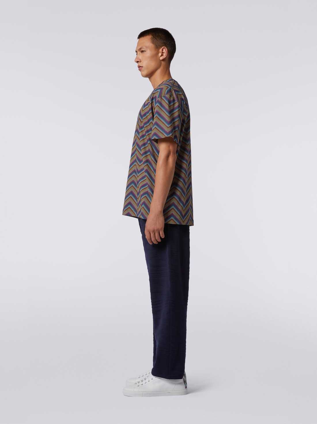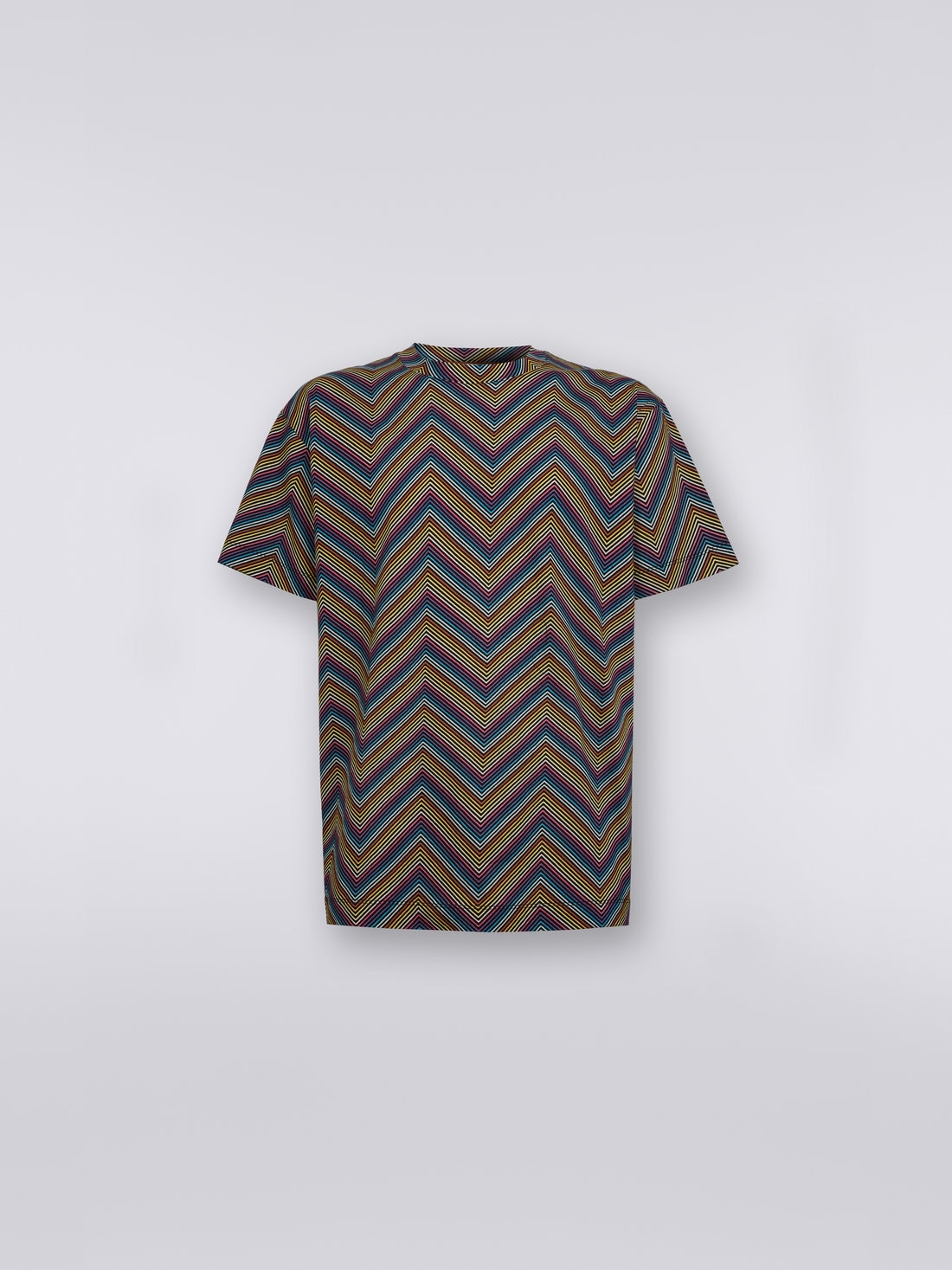 La versatilidad de esta camiseta para hombre de cuello redondo de tejido jersey de algodón, protagonista indiscutible del vestuario informal, gana personalidad gracias al tratamiento Missoni, que la cubre por completo con un estampado multicolor integral en zigzag.
