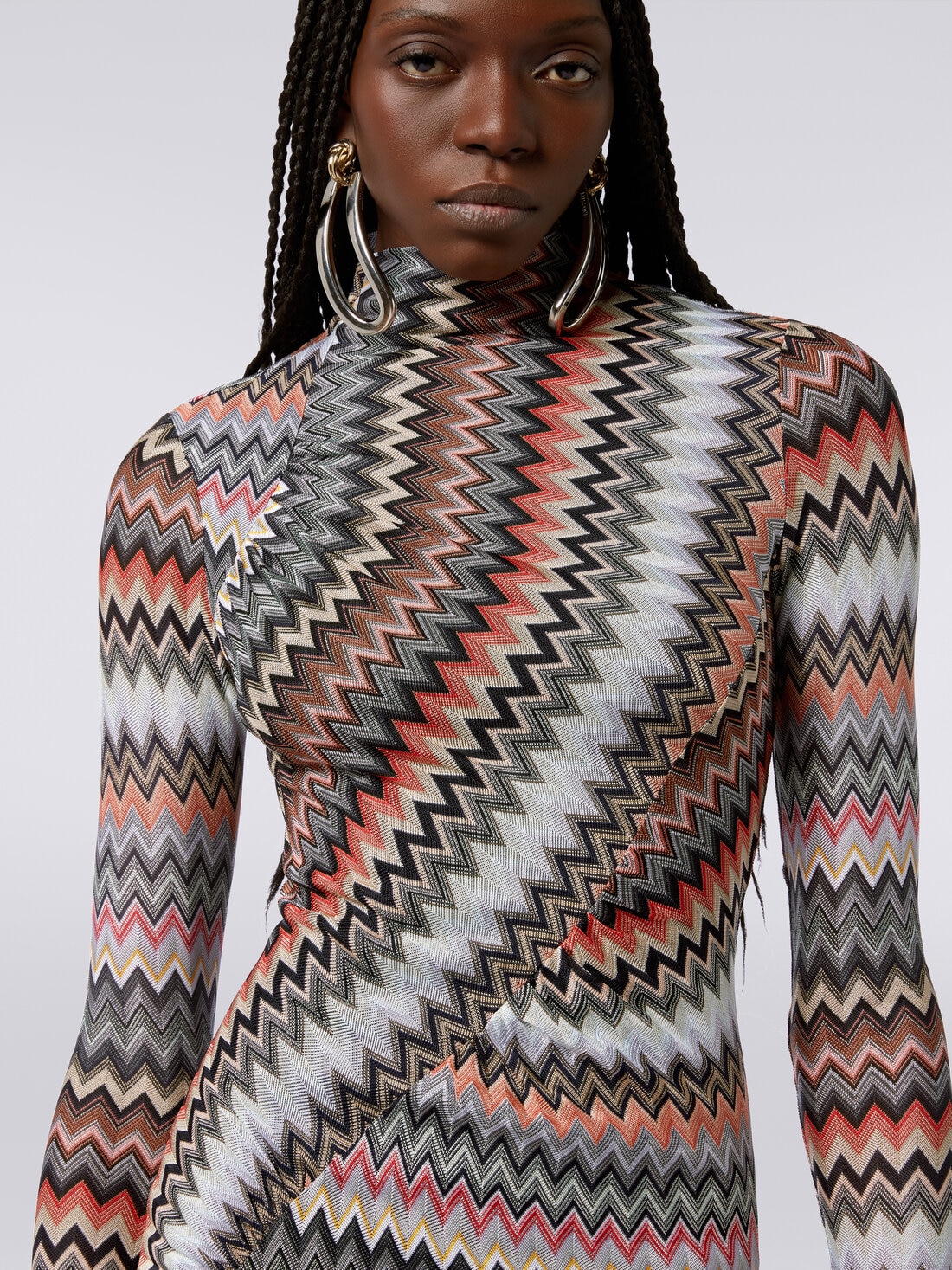 Este vestido largo para mujer resalta las curvas de la silueta mediante un sofisticado juego de fruncidos. El modelo de manga larga y cuello alto, confeccionado en punto de algodón y viscosa, está decorado con el inconfundible motivo zigzag de Missoni.