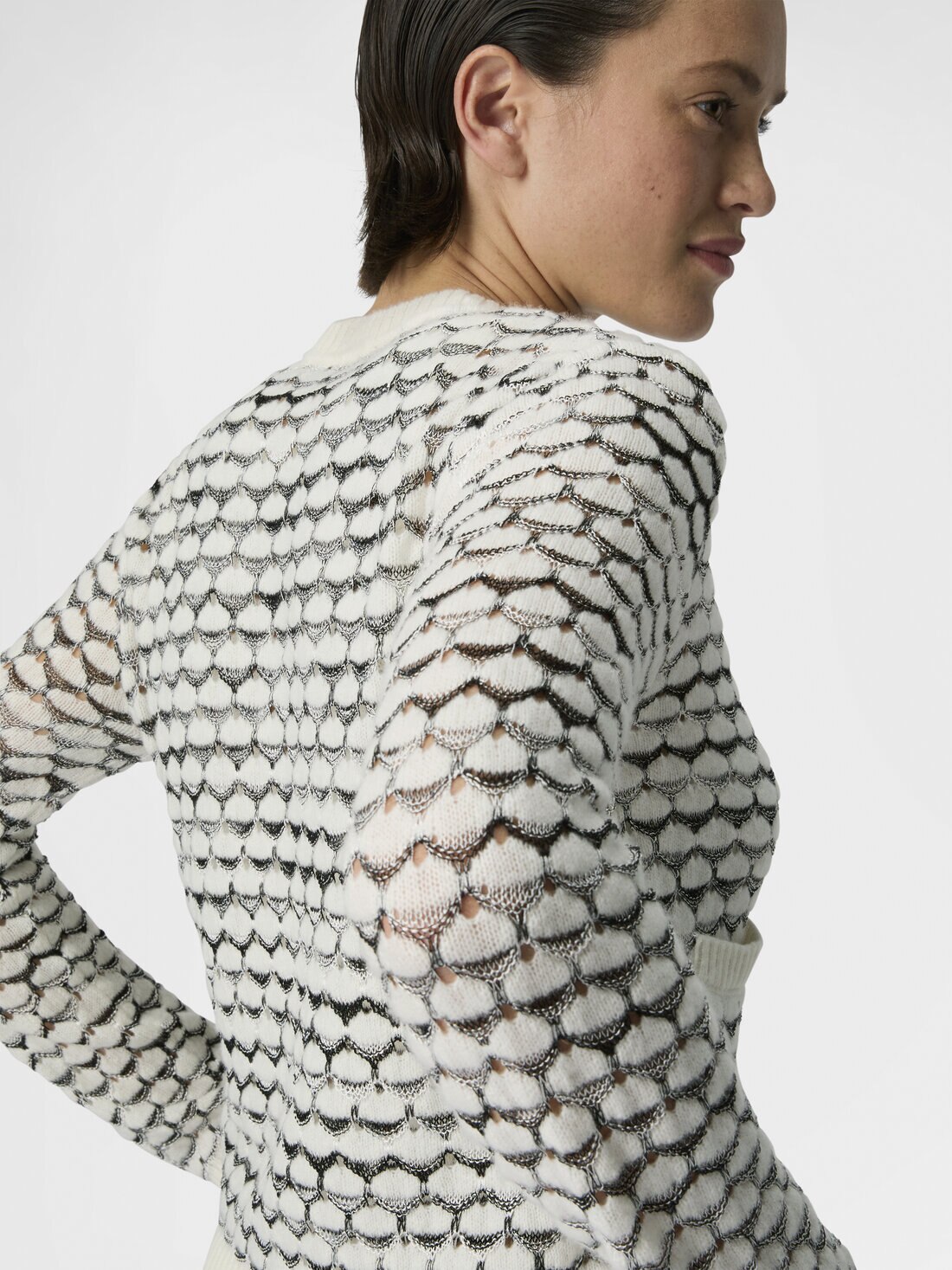 Le tricot en maille ajourée apporte texture et caractère à ce cardigan à col rond pour femme avec boutons, en cachemire et viscose, rehaussé de finitions contrastées qui en soulignent les lignes et le style contemporain.