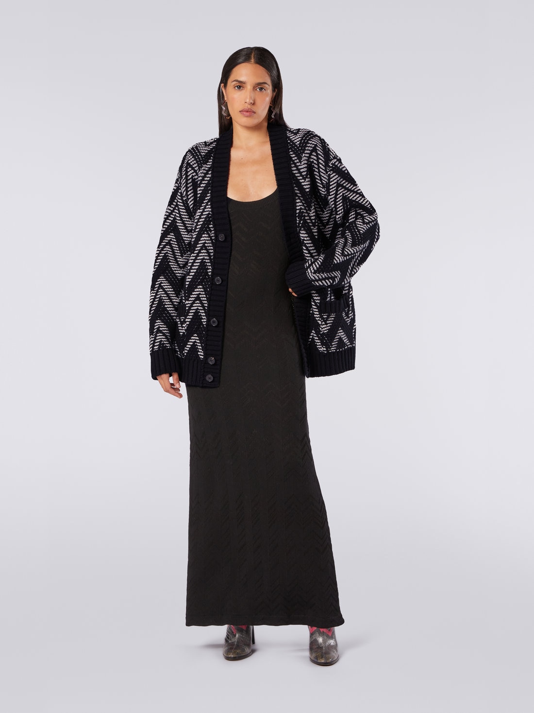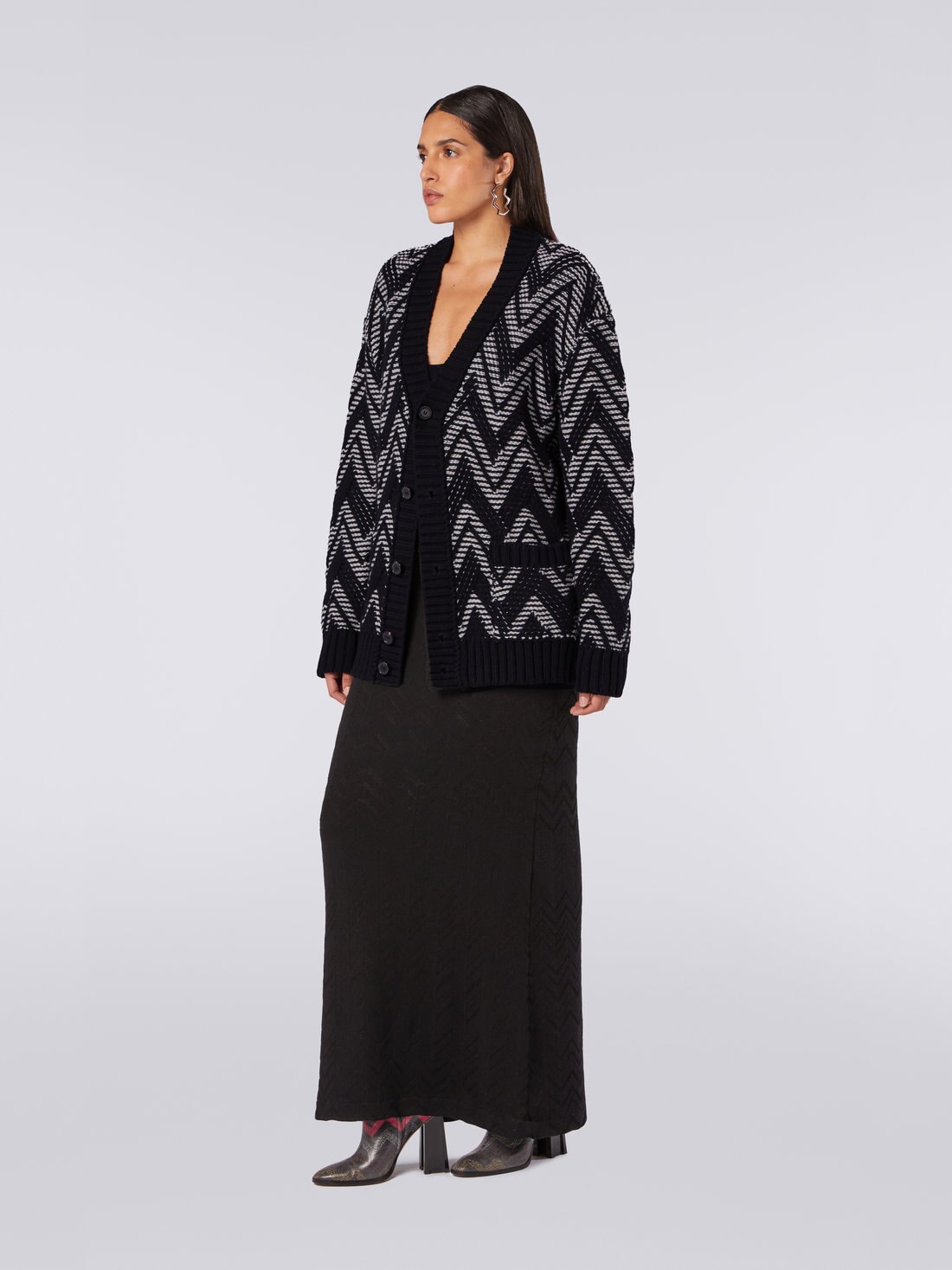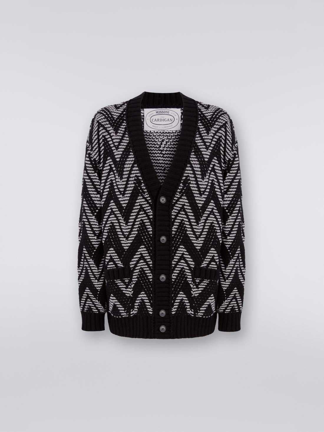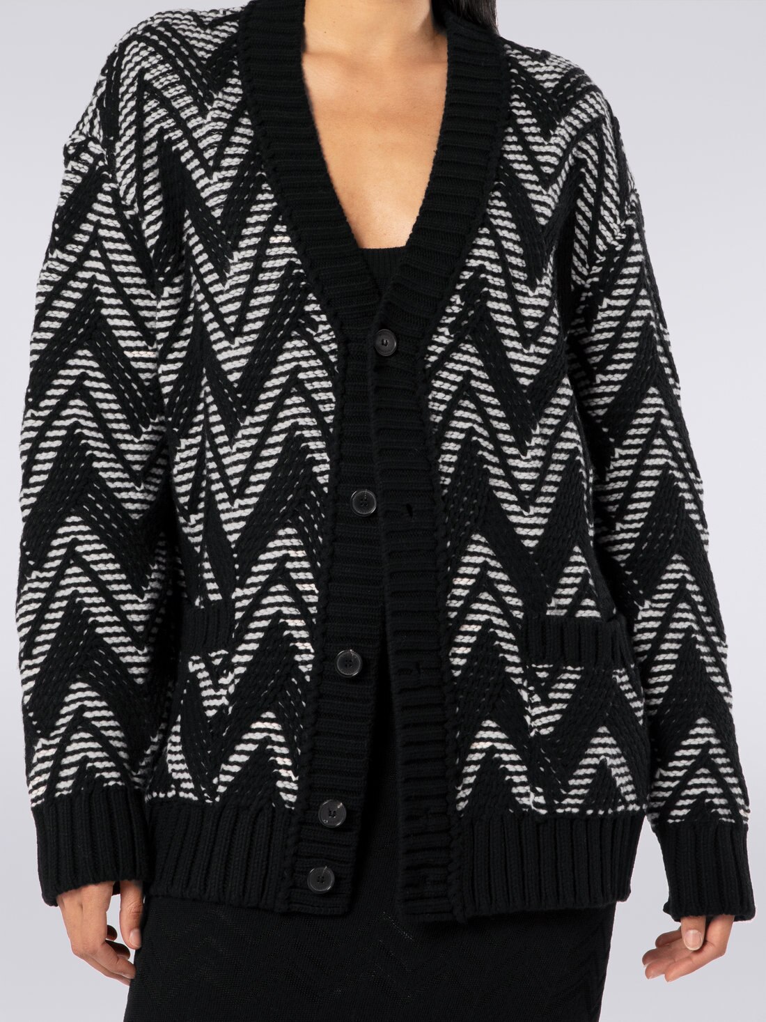 Un filet à chevrons bicolores rayonne sur ce cardigan pour femme à maille de laine de finesse trois. Ce vêtement présente des bordures de couleur unie et se ferme sur le devant à l’aide de boutons personnalisés.