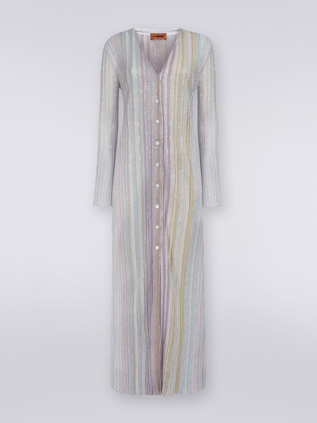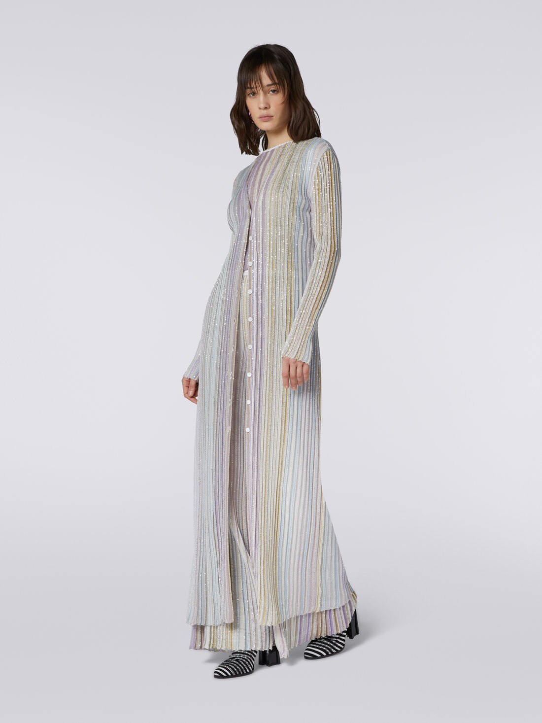 Longueur pied pour ce cardigan long pour femmes en viscose. Le modèle, qui descend droit sur la silhouette, est traversé par de longues bandes verticales décorées de paillettes. Des boutons personnalisés et une encolure en V complètent ce design raffiné.