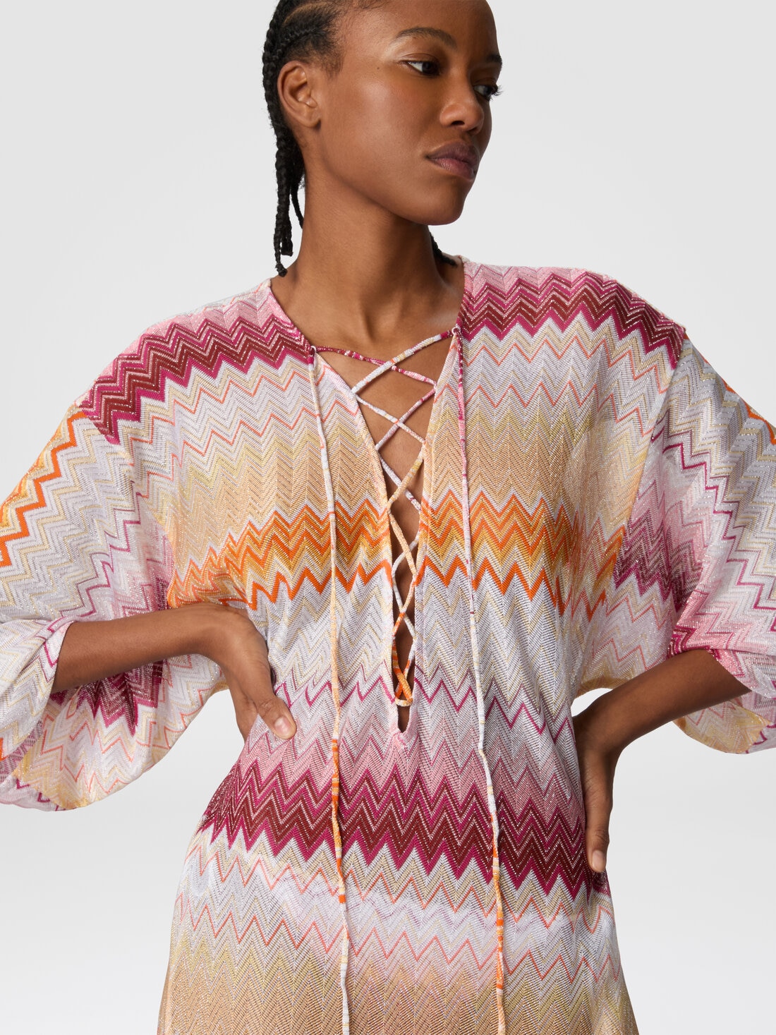 Issu de l'héritage exotique de Missoni, le caftan long couvrant en viscose mélangée incarne l'élégance intemporelle de la maison. Le motif en zigzag s'entremêle aux reflets métalliques du lamé, créant une harmonie de lumière et de couleur. L'encolure en V plongeante, agrémentée de lacets qui ajoutent du mouvement et du dynamisme, met en valeur la silhouette d'une touche de sensualité sophistiquée.
