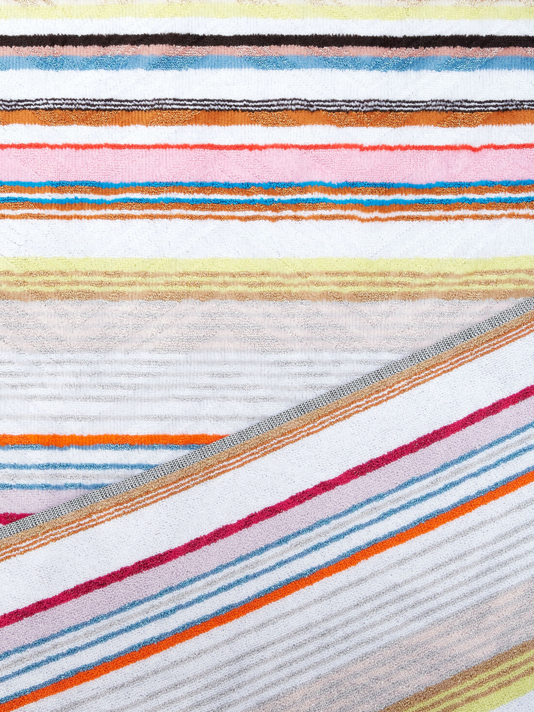 L’élégance s’invite dans le quotidien avec le set de serviettes Moonshadow. Composé de deux pièces, l’ensemble est fabriqué en velours de coton éponge de haute qualité, rehaussé de fins fils de lurex. Le motif rayé, agrémenté d’un fin liseré jacquard, confère une touche de luxe et de sophistication à la salle de bains, alliant fonctionnalité et style dans une création unique de MissoniHome.