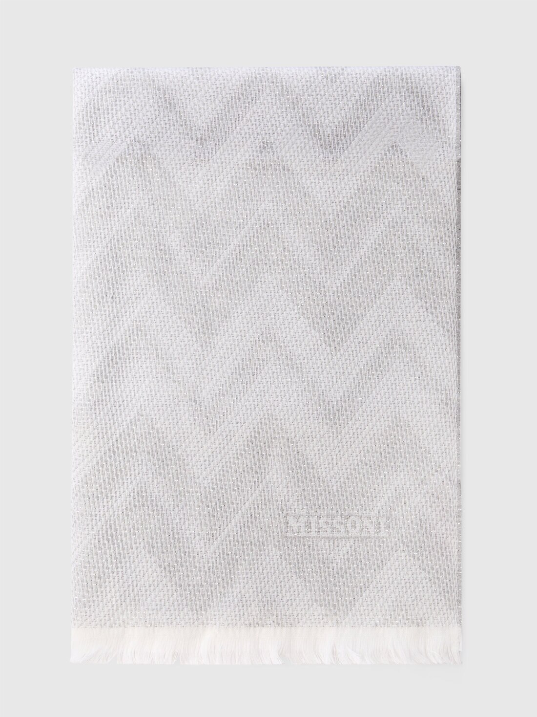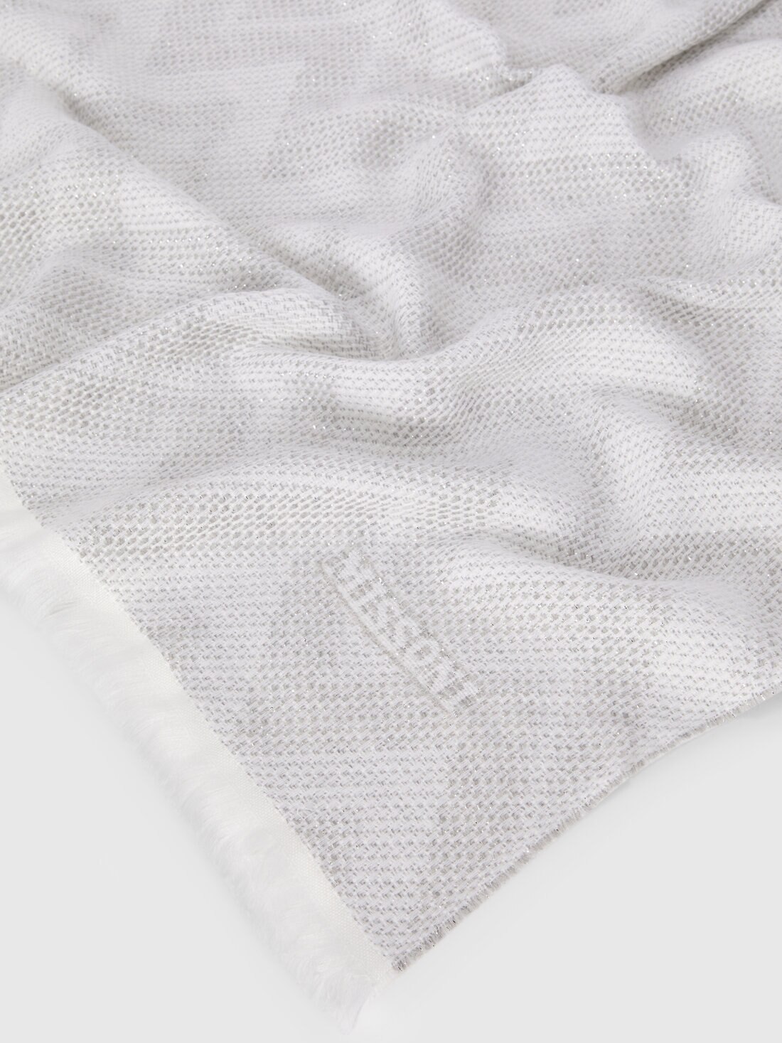Une chasse aux zigzag raffinée ton sur ton pour cette étole en laine pour femme. Un accessoire élégant, personnalisé avec le mot logo et fini avec un bord effiloché, parfait pour donner la touche finale au look, même le plus formel.