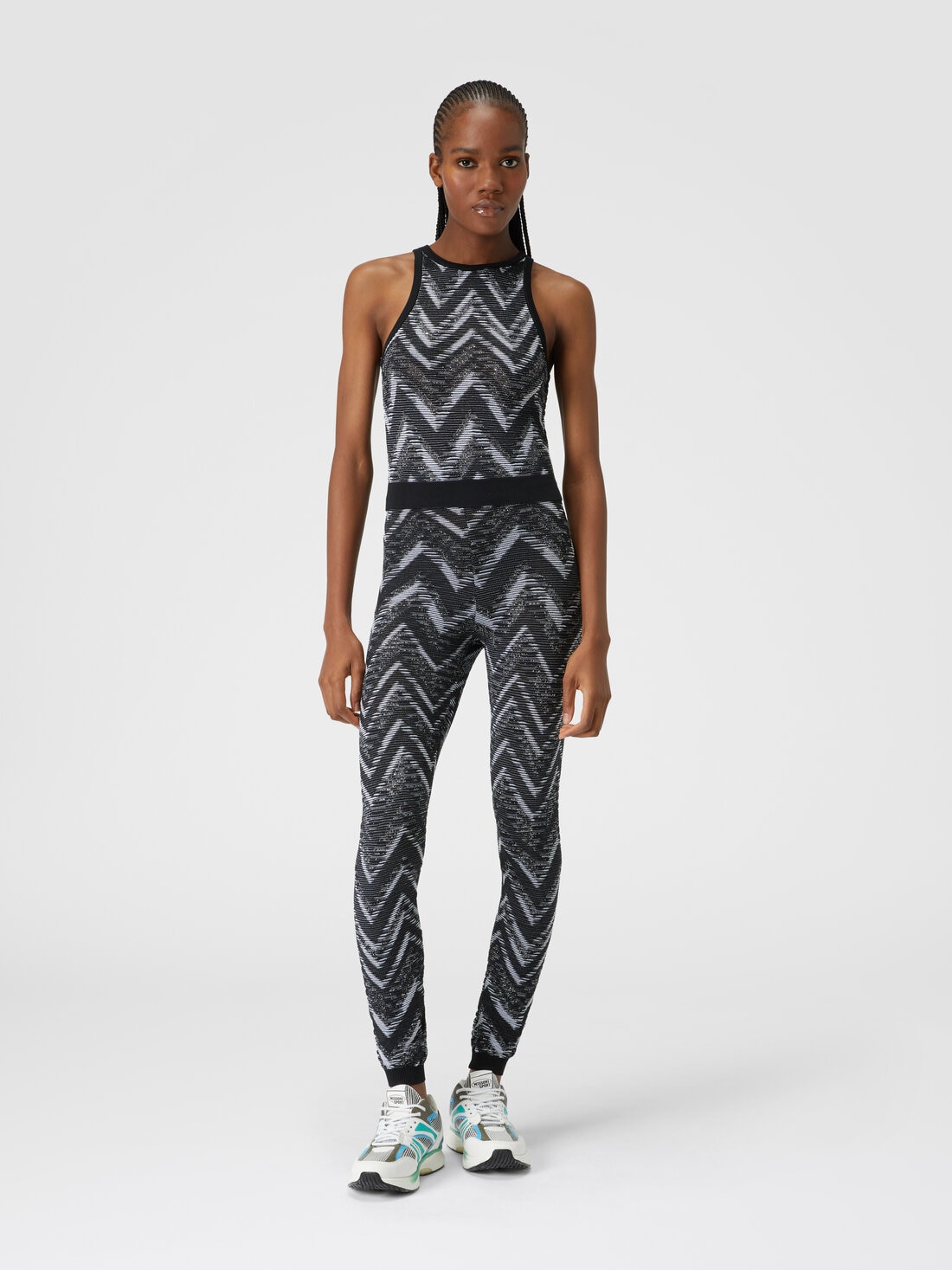 Le motif iconique des chevrons traversé par une côte à effet 3D caractérise ce haut pour femmes en maille technique extensible. Agrémenté d'un motif en zigzag, ce modèle est complété par un élastique contrasté et personnalisé sur le bas.