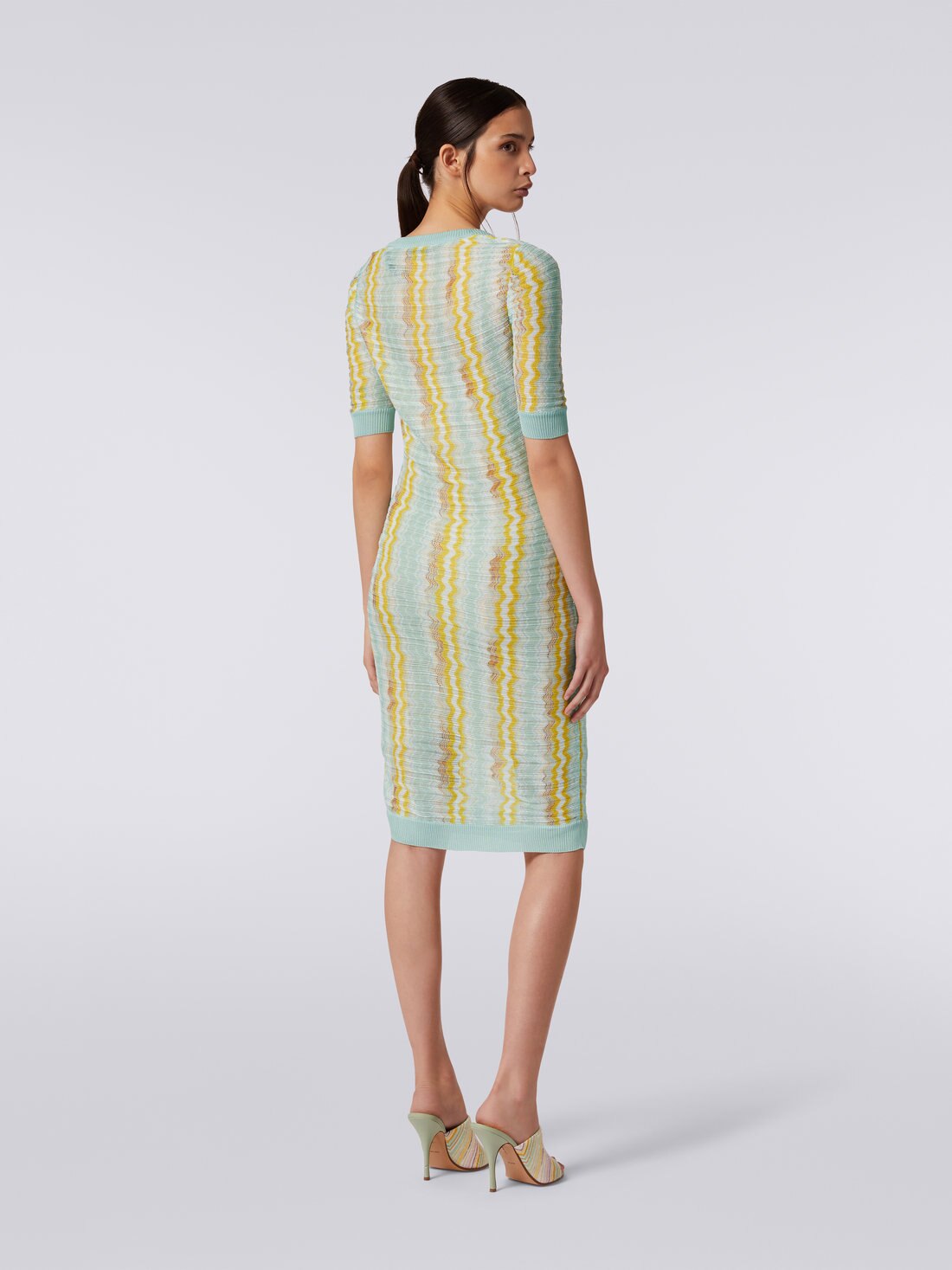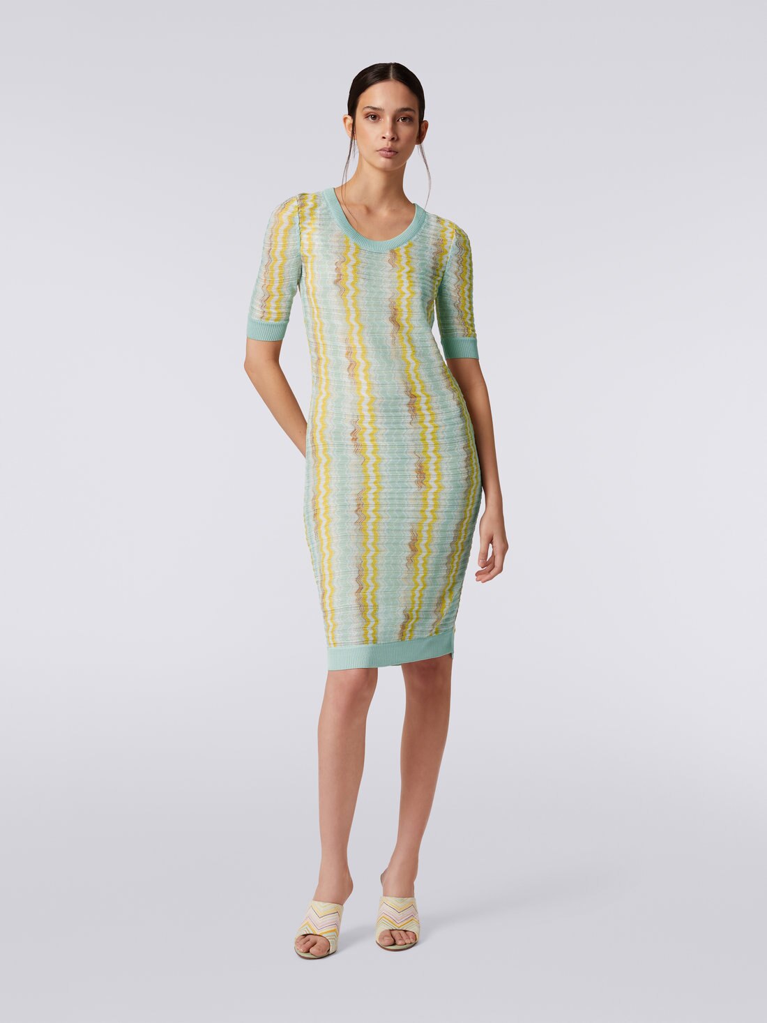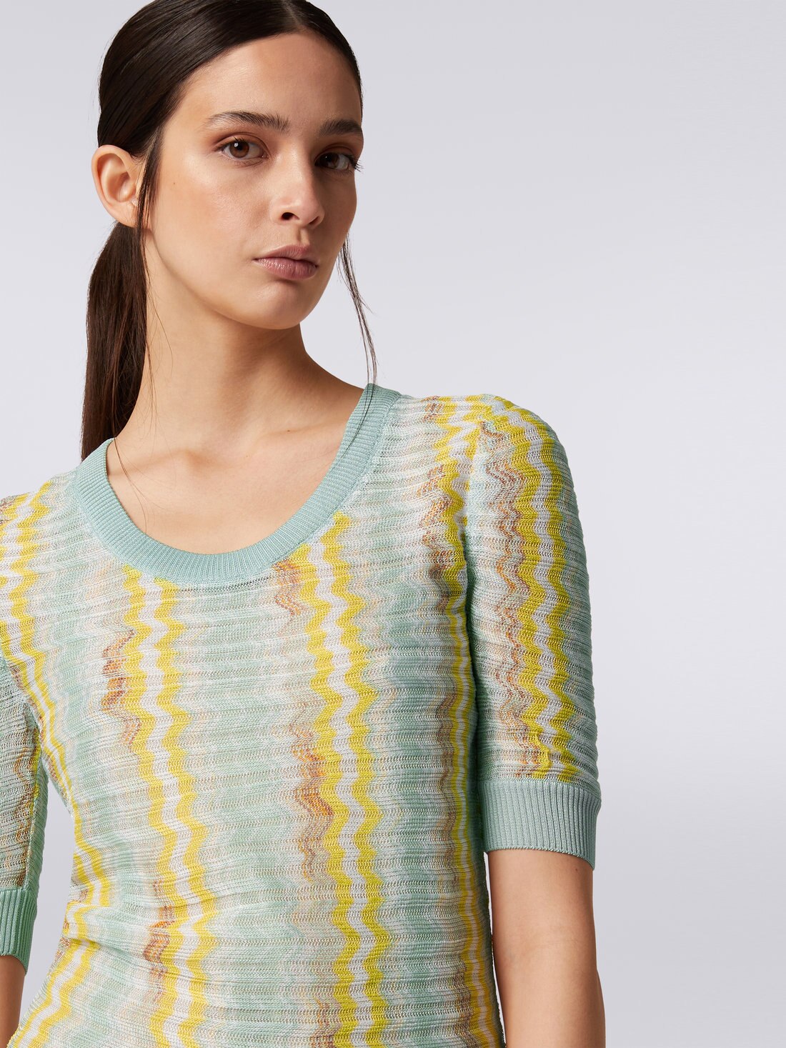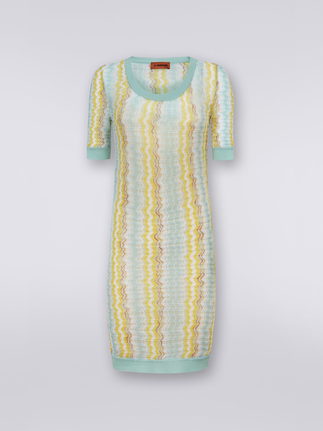 La mini-robe pour femme en pure maille de viscose accompagne discrètement la silhouette. Ce modèle présente des manches courtes, une encolure ronde généreuse et des bordures côtelées contrastantes. La finition motif jacquard, réalisée dans des tons pastel ajoute une touche de féminité sophistiquée à la robe.
