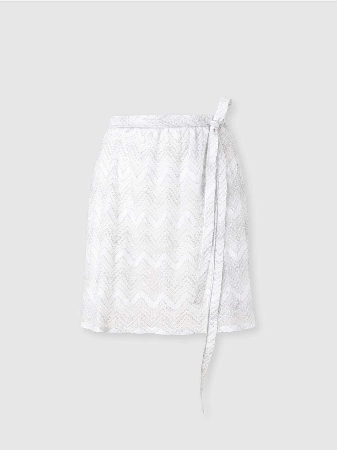 La minijupe cache-cœur en viscose avec le motif zigzag emblématique exprime toute l'essence vibrante de Missoni. Doté d'une fermeture légèrement nouée sur le côté, il met en valeur la silhouette d'un jeu de lignes sinueuses, tandis que les reflets métalliques du lamé ajoutent une touche de lumière sophistiquée. Un vêtement raffiné, idéal pour compléter le look de plage avec style.