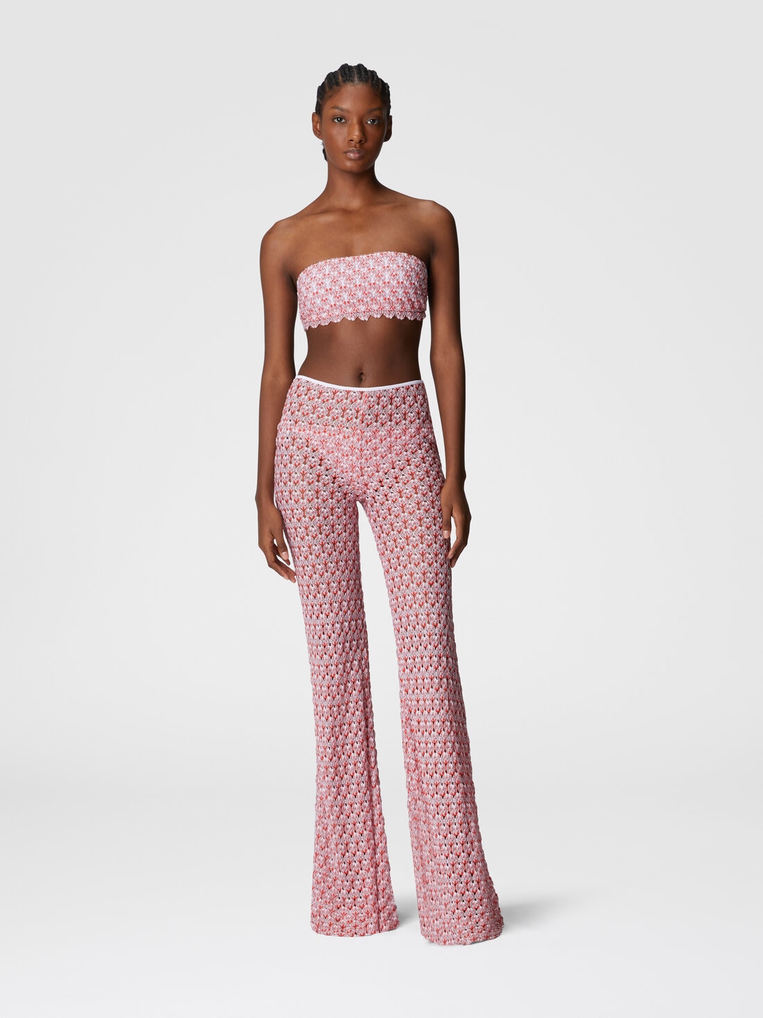 Pièce rétro-chic avec un design de jambe éléphant qui flatte la silhouette. Réalisée en dentelle de viscose et lamé, elle allie délicatesse et originalité pour un look sophistiqué et féminin.