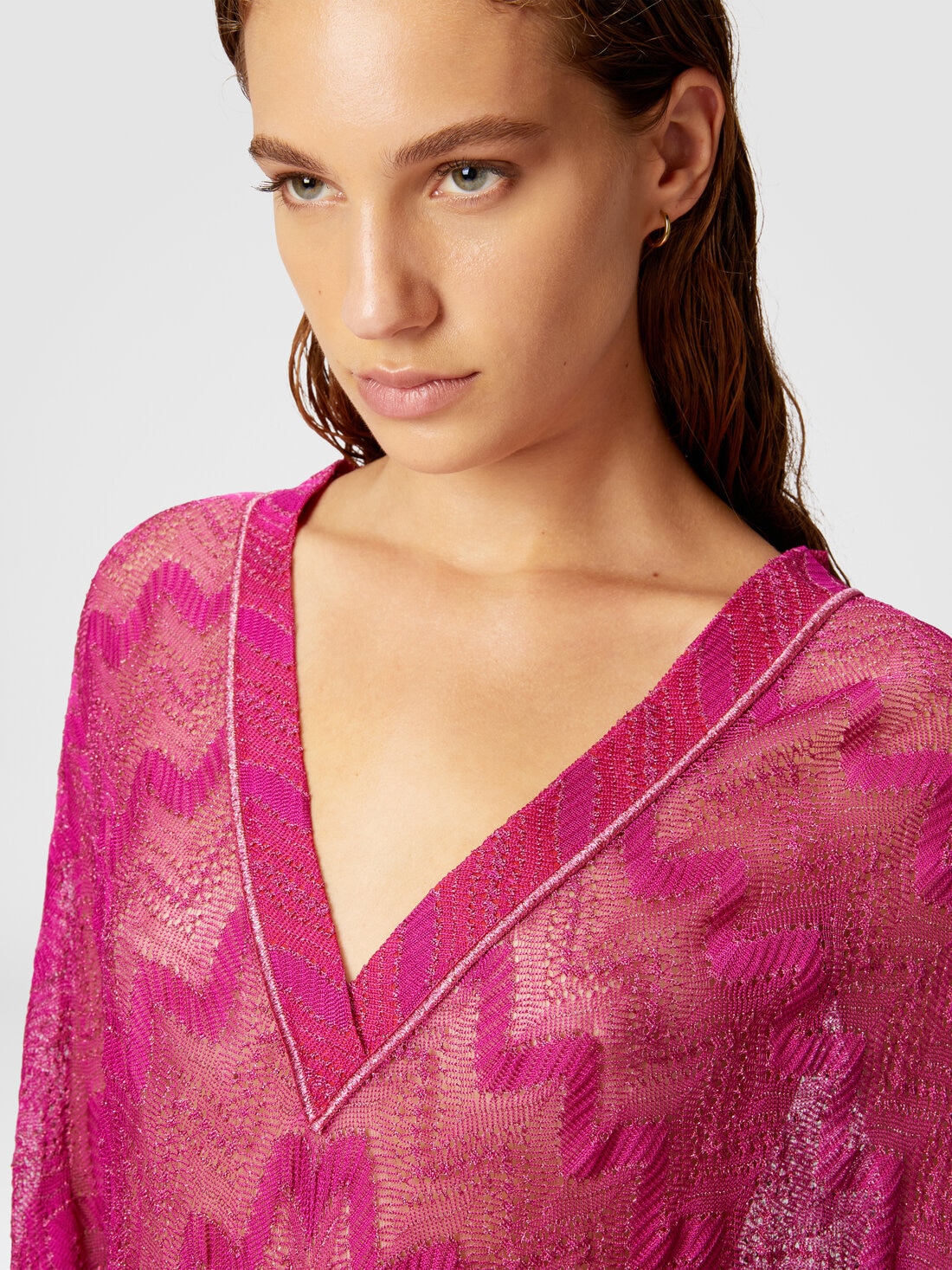 Le short cover-up en viscose lamée, signé Missoni, capture l'essence du boho chic avec une touche de glamour. Les manches larges et fluides se marient parfaitement avec le motif chevron classique, icône de la maison, évoquant une esthétique libre et vibrante.