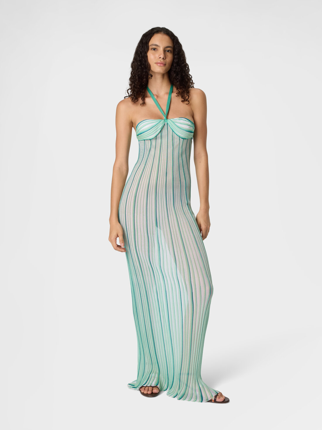 Un jeu de transparences et de légèreté définit cette robe de plage longue en viscose côtelée, sublimée par un lien ajustable au cou qui souligne la féminité avec une simplicité raffinée. Réalisée en 100 % viscose, elle incarne une élégance naturelle et lumineuse.
