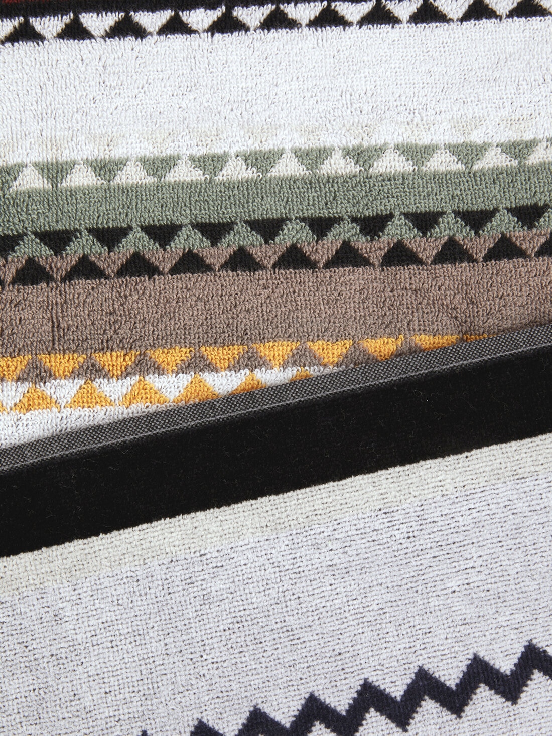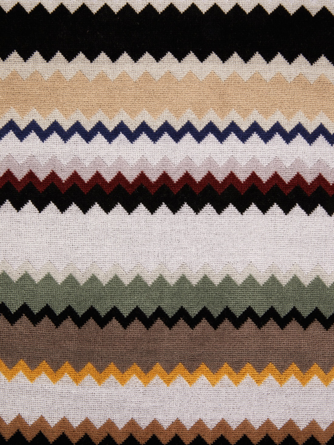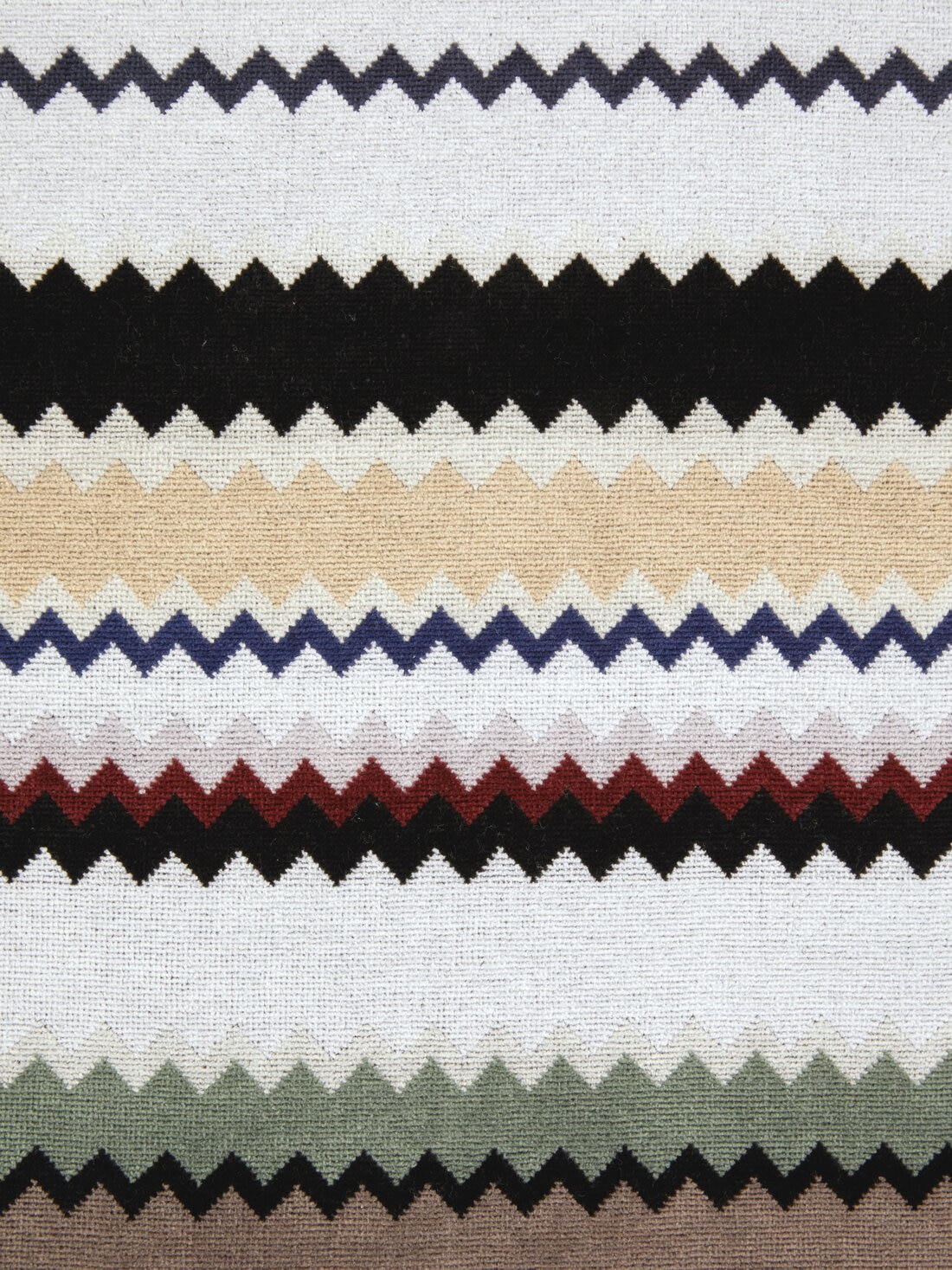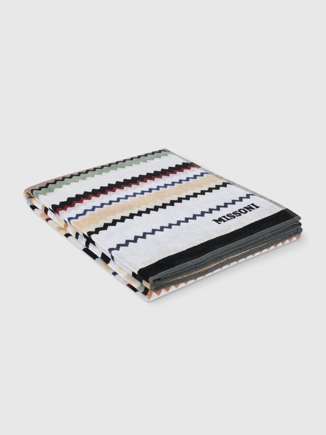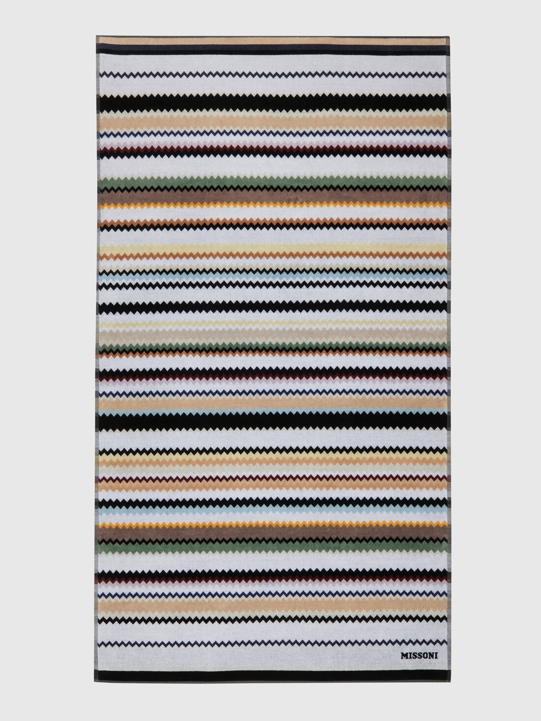 L’ADN de MissoniHome est parfaitement incarné par la serviette de plage Curt 100x180 cm. Le tissu éponge en velours de coton pur, avec son motif en zigzag et le lettrage du logo, recouvre cet accessoire d’été d’un style intemporel.