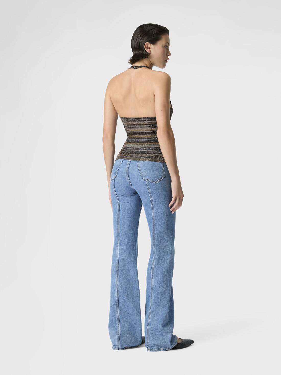 Un raffiné jeu de lumières et de contrastes définit ce top pour femme en viscose lamé rayée, rehaussé d’un motif rayé qui apporte profondeur et éclat au tissu. Le décolleté américain complète le modèle d’une touche moderne et féminine.