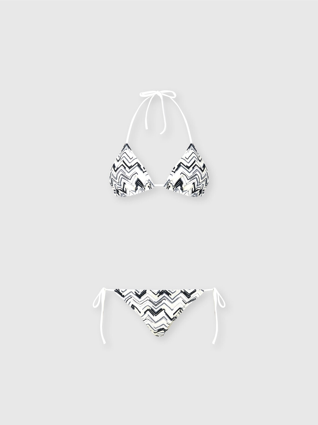Raffiné et raffiné, le bikini en viscose mélangée avec un motif en zigzag flammé capture l'essence des vêtements de plage de luxe de Missoni. Composé d'un haut triangle et d'un slip à lacets, le modèle se distingue par son jeu de couleurs et sa texture riche, qui met en valeur la silhouette avec une élégance naturelle.