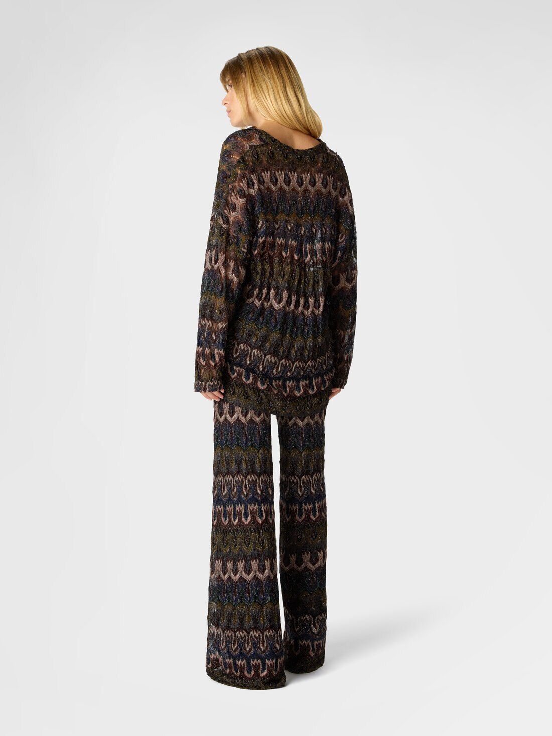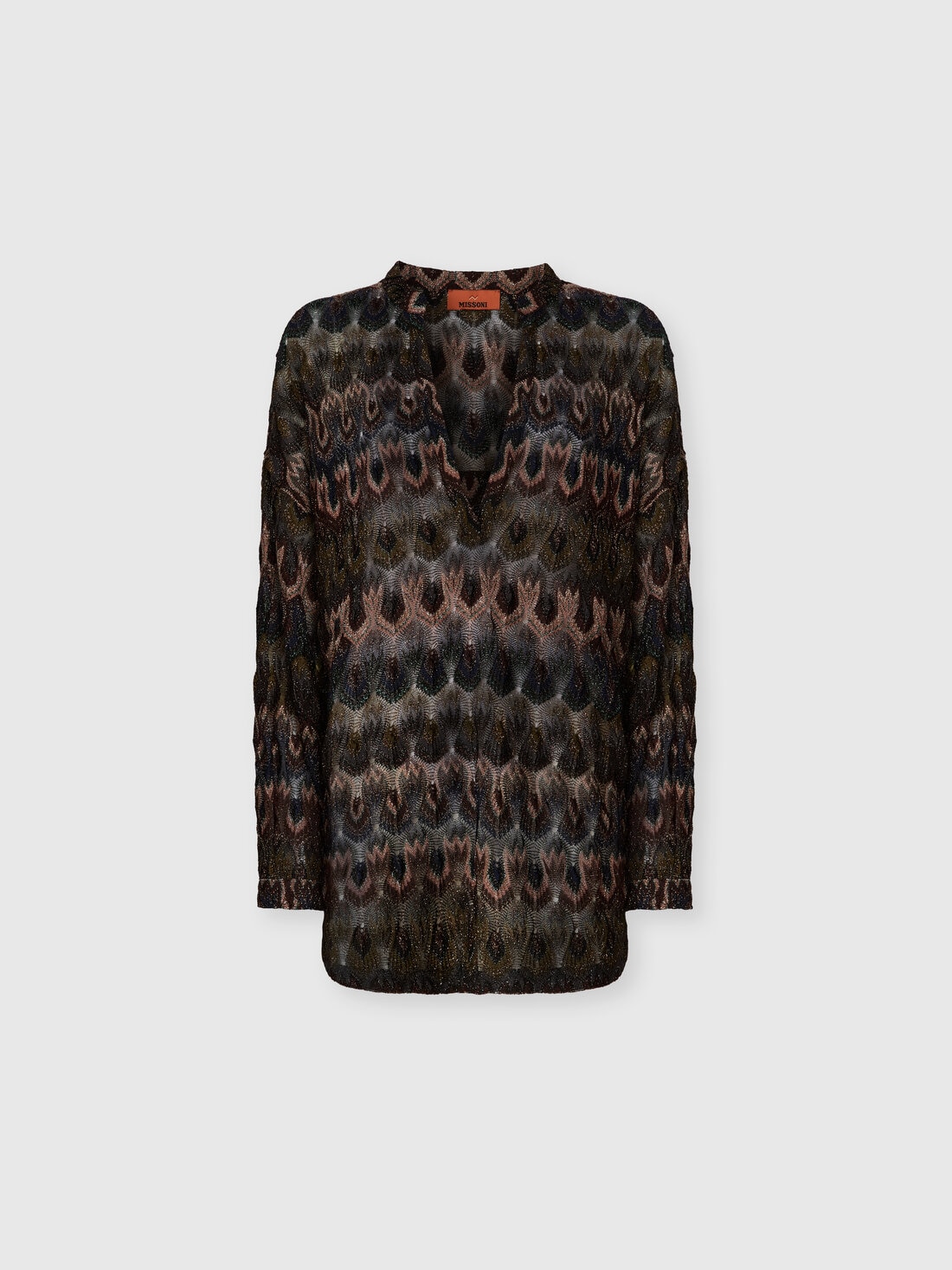 Un précieux travail raschel en dentelle au motif arabesque caractérise cette blouse oversize pour femme en viscose lamé, sublimée par de délicats reflets lumineux. Le col mao et les manches longues complètent une pièce qui allie savoir-faire artisanal et légèreté, dans le pur style Missoni.