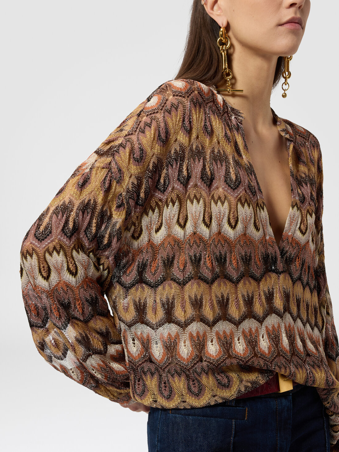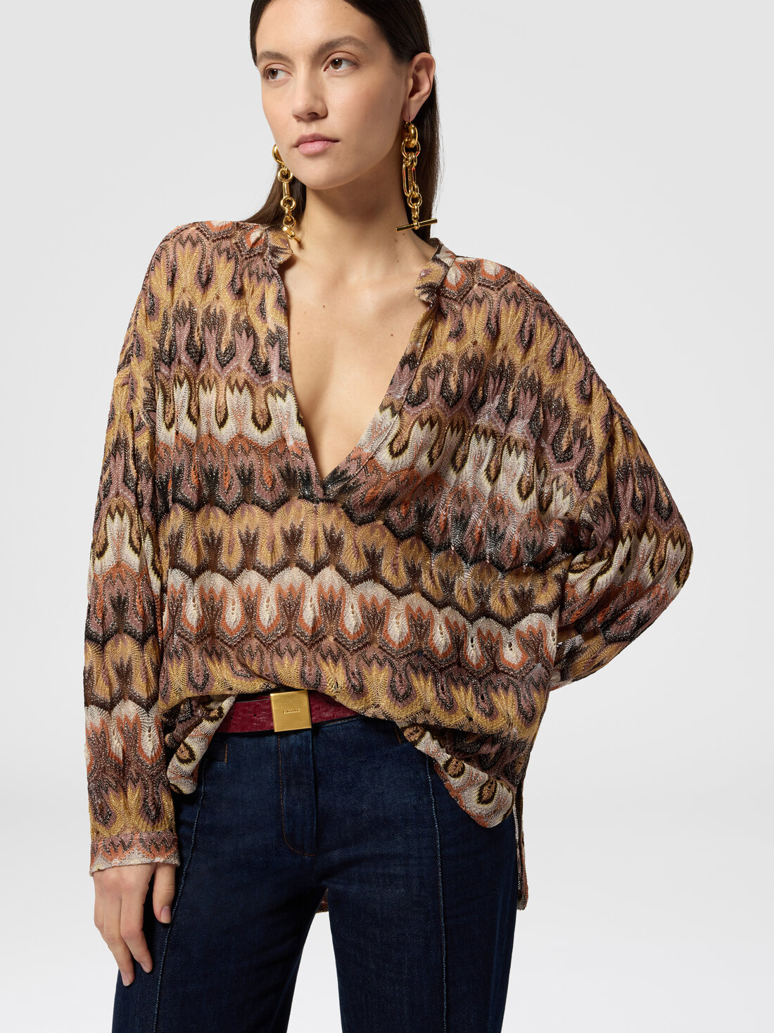 Un précieux travail raschel en dentelle au motif arabesque caractérise cette blouse oversize pour femme en viscose lamé, sublimée par de délicats reflets lumineux. Le col mao et les manches longues complètent une pièce qui allie savoir-faire artisanal et légèreté, dans le pur style Missoni.