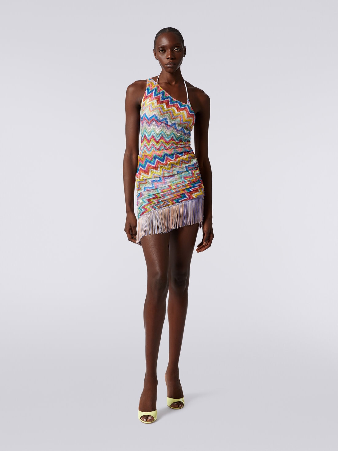 Ce caftan court à franges capture l’esprit de l’été avec une harmonie raffinée de détails. La silhouette à une épaule évoque une aura d’élégance contemporaine, tandis que les franges ajoutent une touche ludique et vivante au vêtement. Les fronces latérales avec cordon de serrage confèrent une allure féminine à ce vêtement, créant une pièce qui allie magistralement style et praticité.