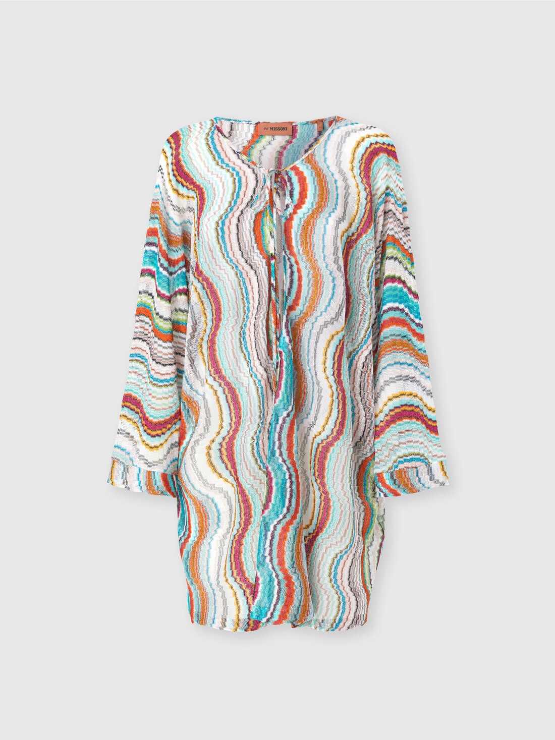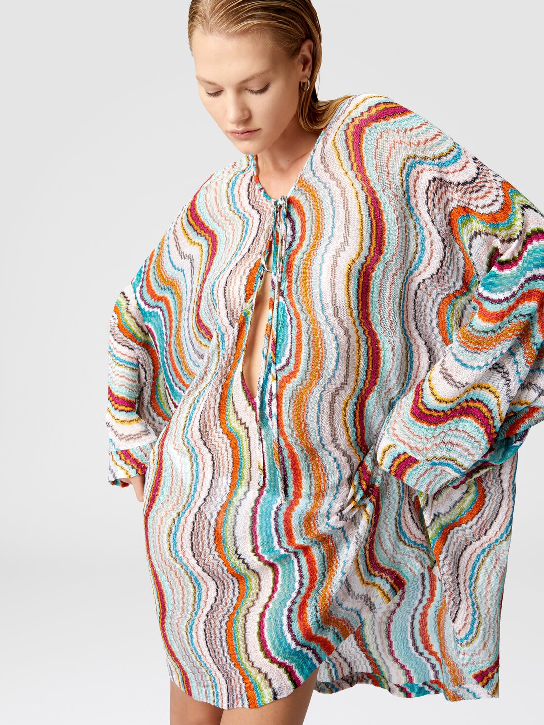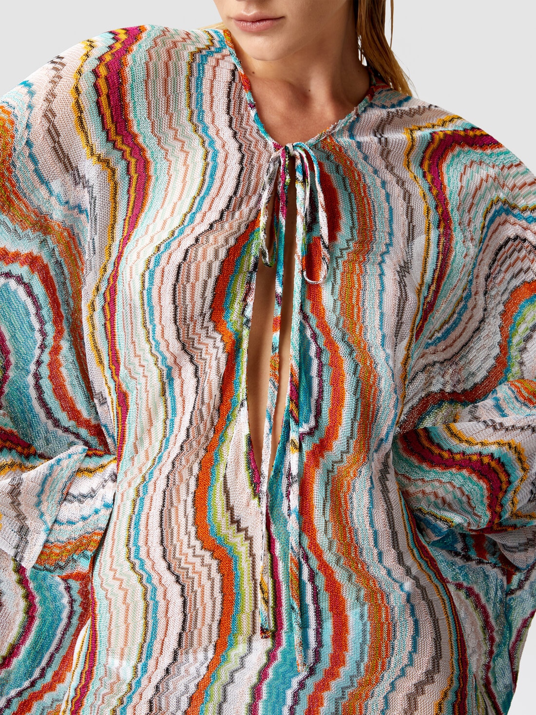 Enraciné dans l'héritage de Missoni, le caftan à motifs de vagues courtes évoque l'harmonie fluide des vagues de la mer. La finition sophistiquée en rafale enrichit le tissu, tandis que les reflets lumineux du lamé rehaussent le design d'une touche de luminosité raffinée. Les manches longues complètent l'ensemble avec élégance, créant un effet enveloppant et distinctif.