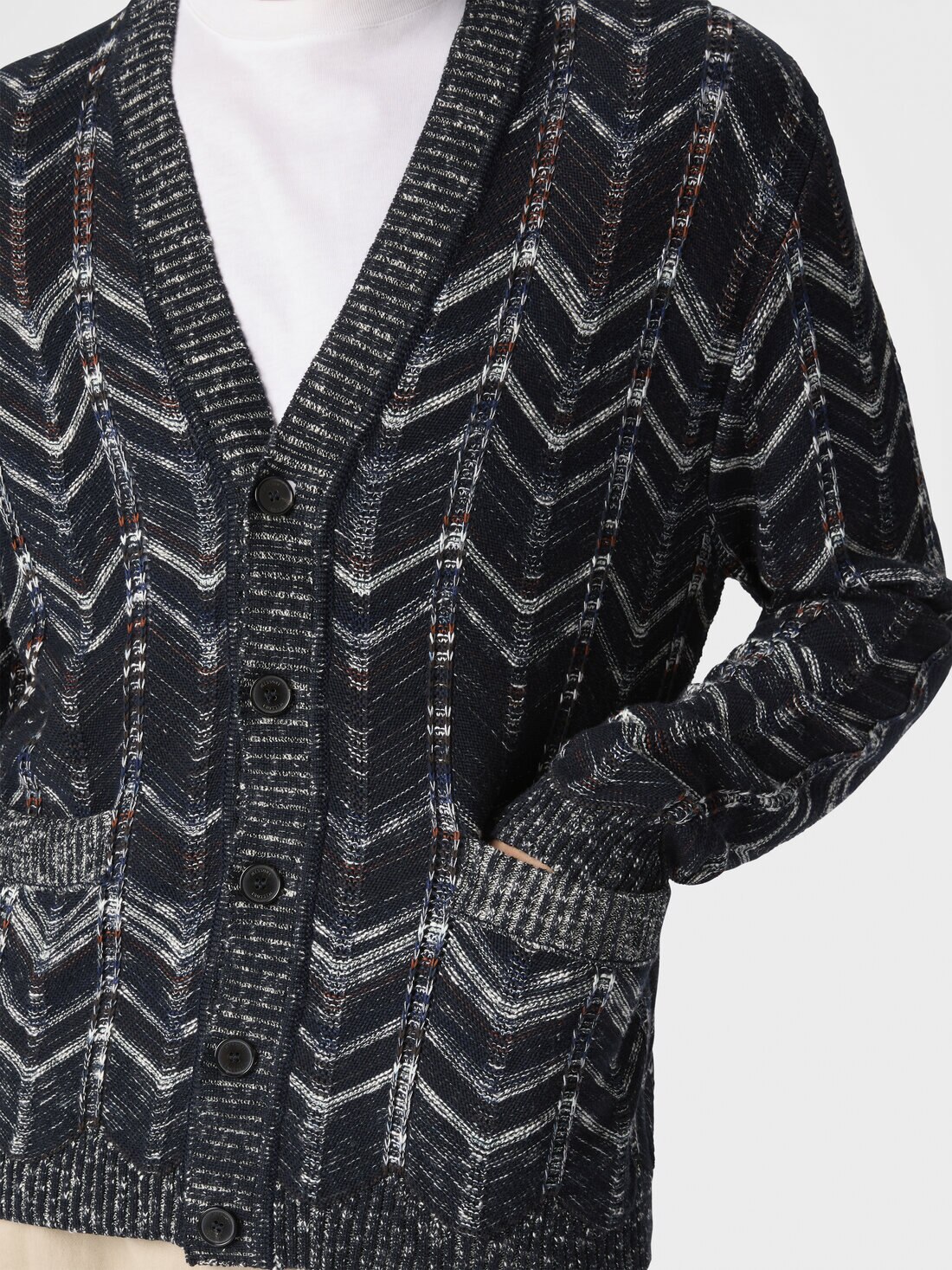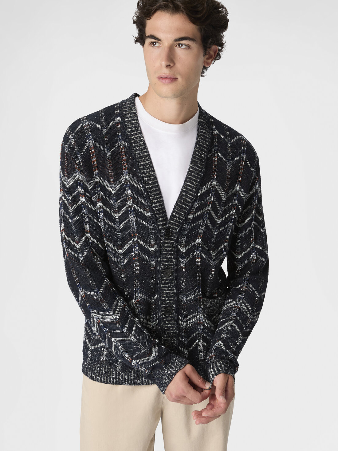 Confectionné en pur coton, ce cardigan pour homme présente un motif chevron qui en définit le caractère. Les bords côtelés et l’encolure en V complètent le design, exprimant le savoir-faire artisanal et l’élégance distinctive de la maison.