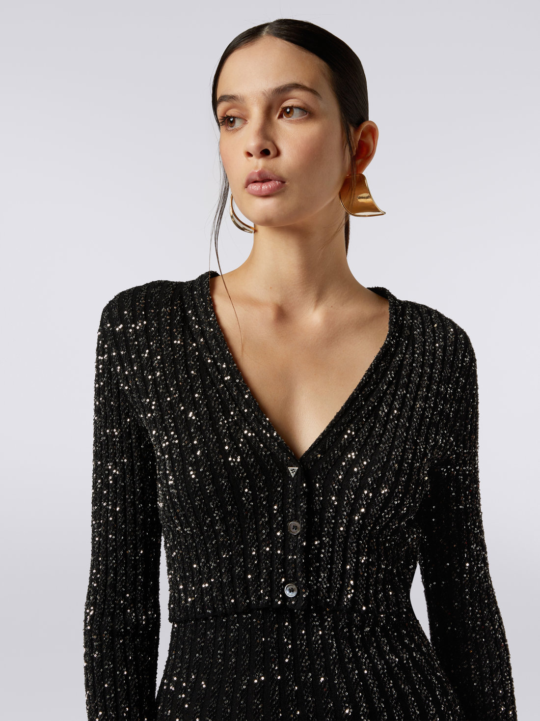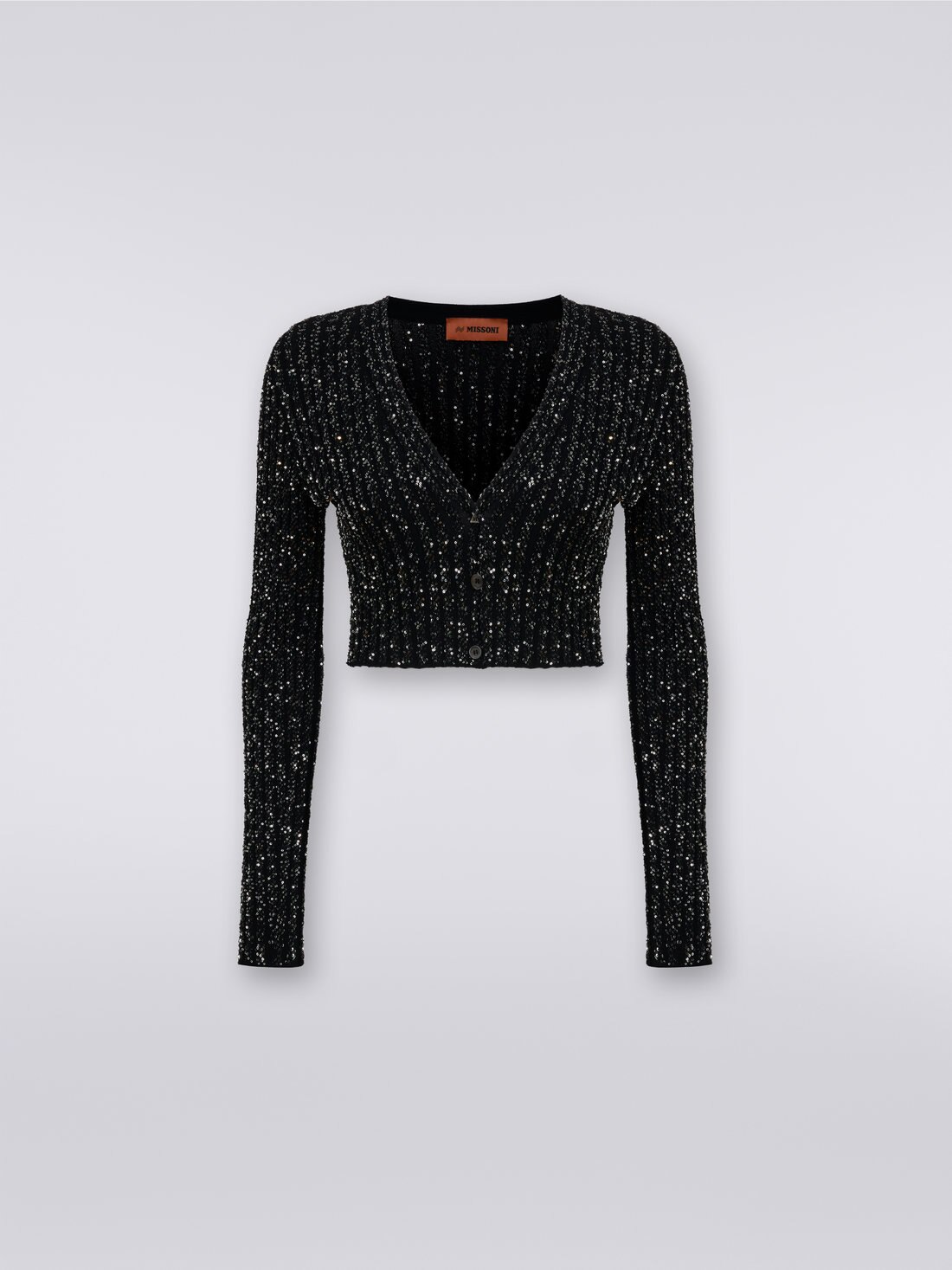 La touche Missoni est immédiatement reconnaissable dans ce cardigan court à manches longues pour femme. La maille côtelée extensible en viscose est ornée de paillettes irisées sur toute sa surface. Le vêtement se ferme à l’aide de boutons.