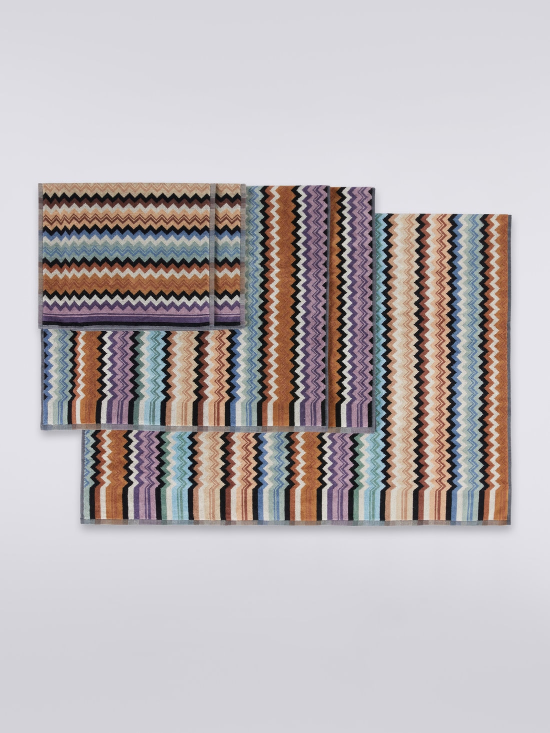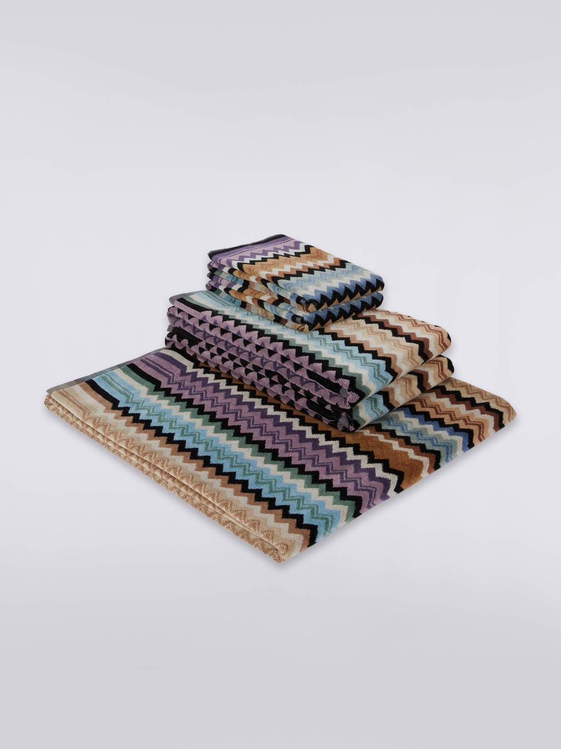 Le linge de maison fait peau neuve avec ce set de 5 serviettes de formats et de tailles différents. Le motif à chevrons multicolore qui enrichit le tissu éponge en velours de coton teint en fil est l’expression parfaite de l’ADN de Missoni décliné dans une version Home.