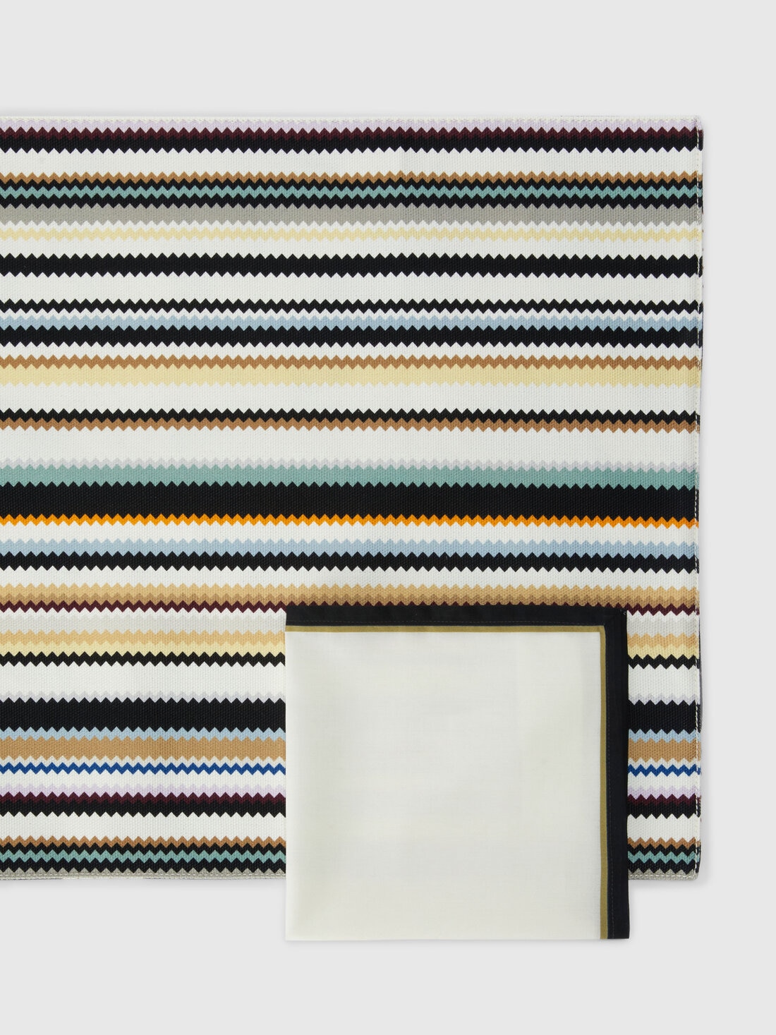 La dernière nouveauté de Missoni est le motif Nastri, qui caractérise un côté des sets de table de 52x38 cm, tandis que l’autre côté présente les élégants zigzags du motif Shangai. Les sets de table sont accompagnés de deux serviettes assorties. L’ensemble offre un raffinement exclusif, parfait pour dresser la table avec une touche personnelle et distinctive, embellissant chaque occasion et moment convivial.