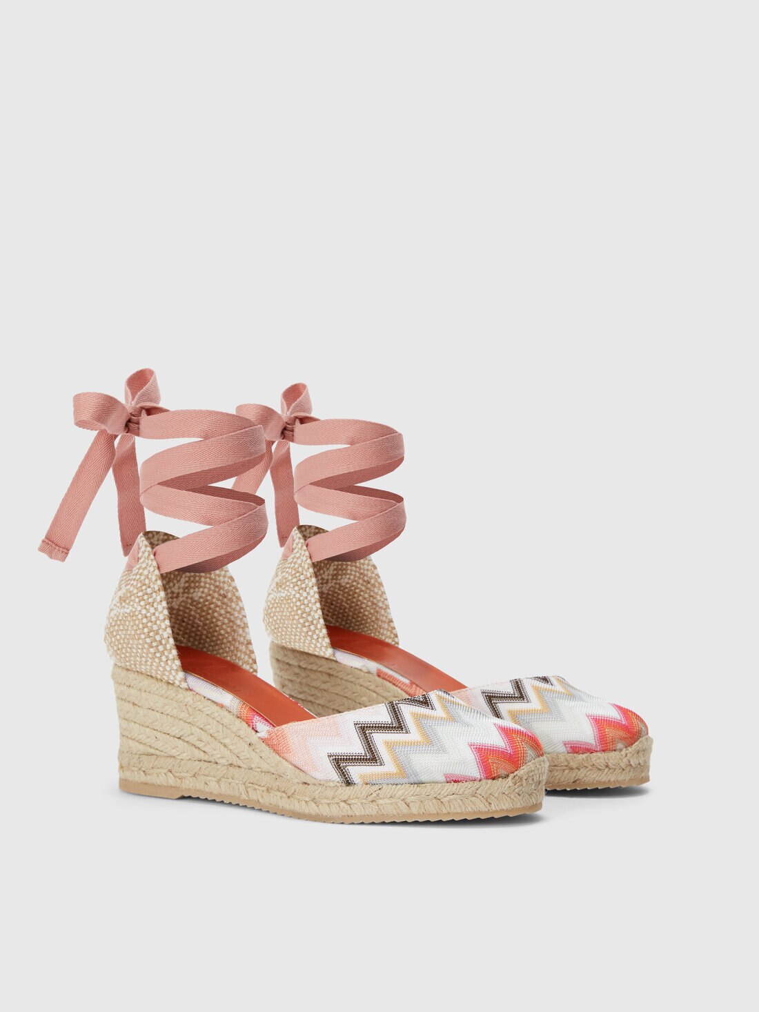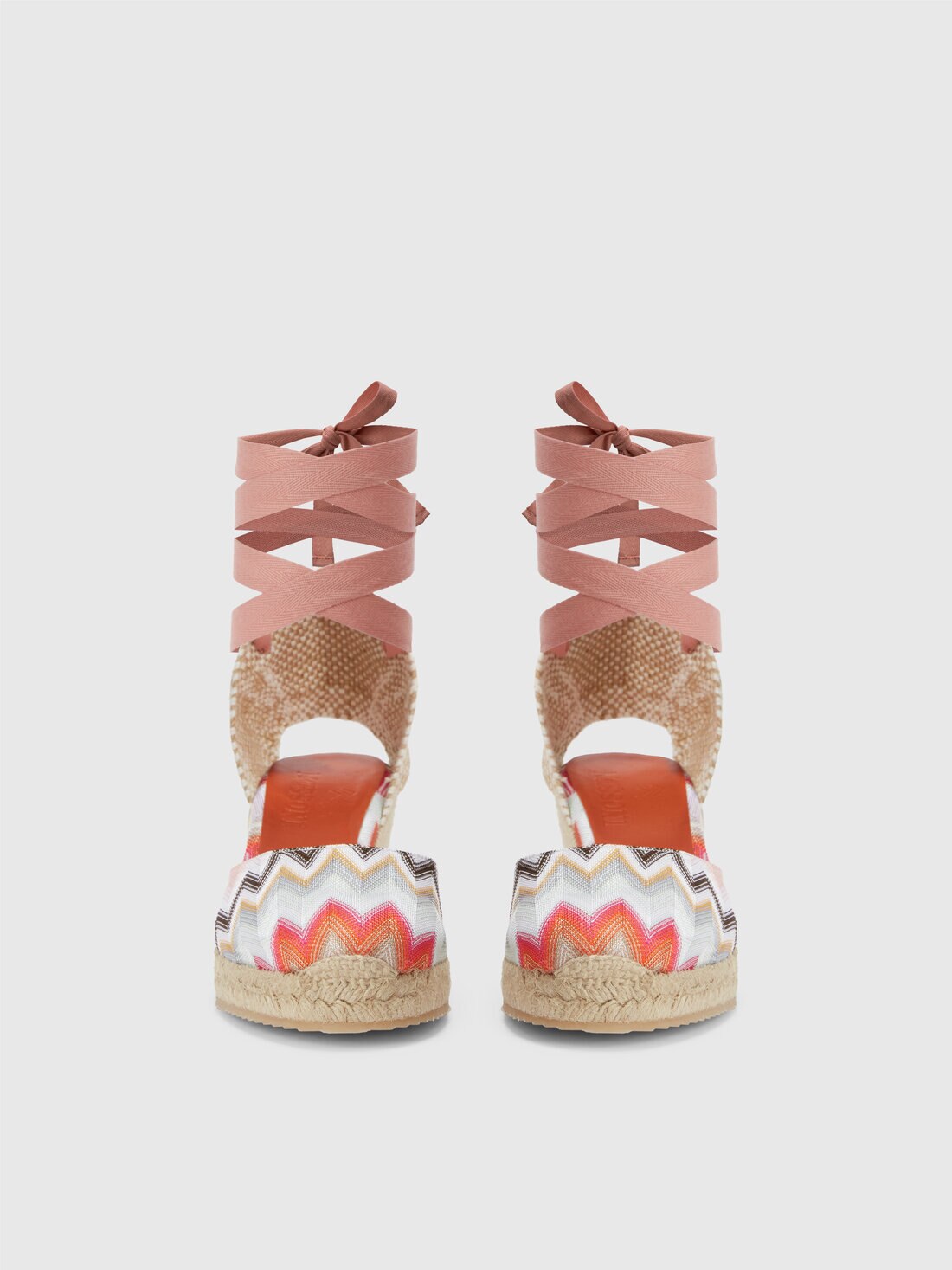 Ces espadrilles pour femme, chaussures d’été par excellence, sont pour Missoni le banc d’essai parfait pour expérimenter sa touche inimitable même sur de nouveaux territoires. Ce modèle compensé en corde tissée présente une tige en tissu avec un motif à chevrons et bande, à nouer à la cheville.