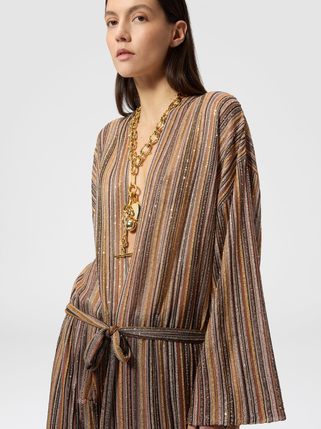 La luminosité du fil lamé confère à ce long cardigan pour femme en viscose côtelée une élégance raffinée qui illumine et complète chaque tenue. Le modèle est défini par une ceinture assortie qui souligne la silhouette avec harmonie.