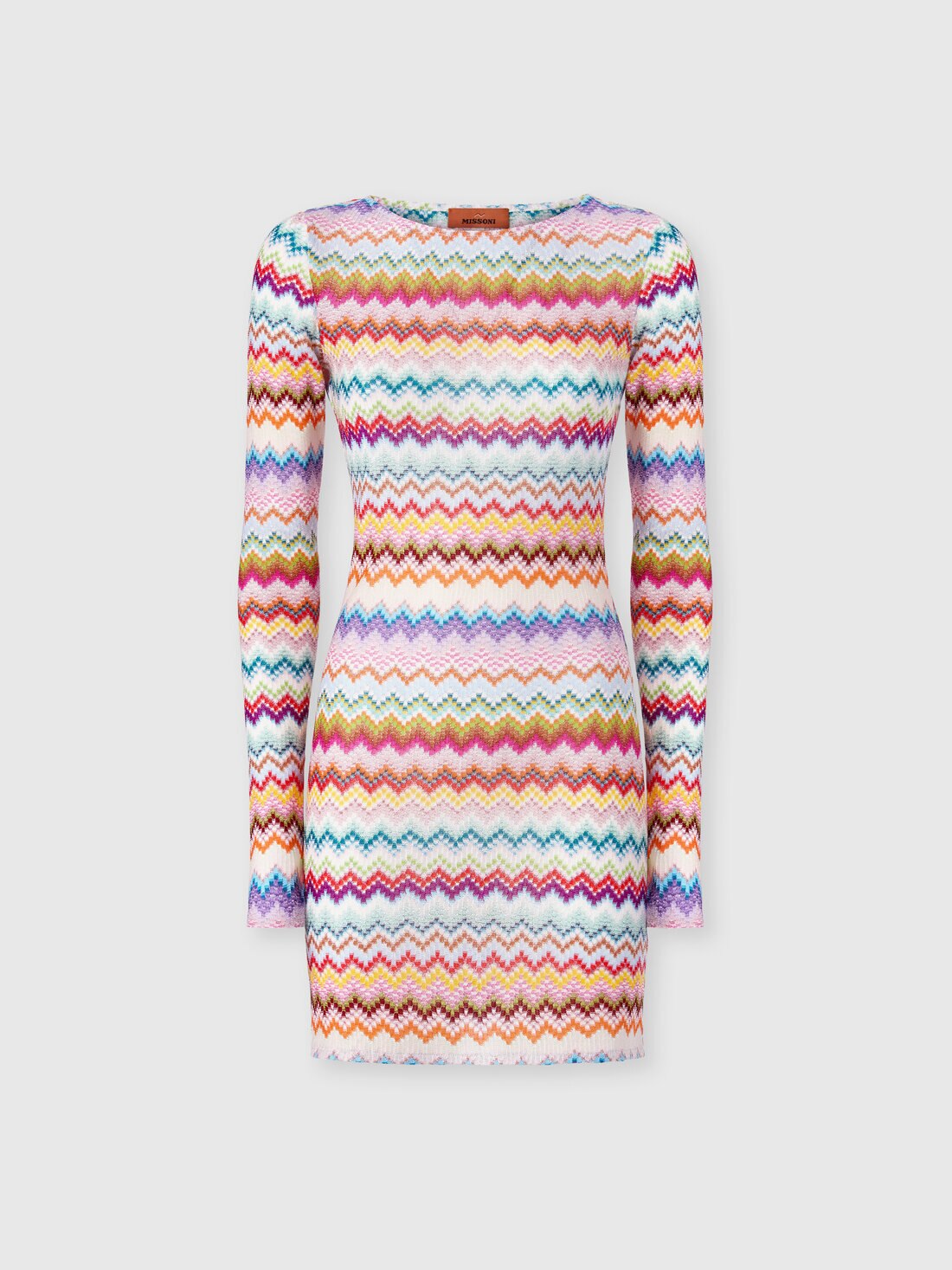 Dans cette robe courte pour femme en viscose lamé, le motif micro zigzag à effet pixel s’anime de reflets irisés. Le travail raschel en sublime la texture lumineuse, exprimant l’équilibre parfait entre innovation textile et identité Missoni.