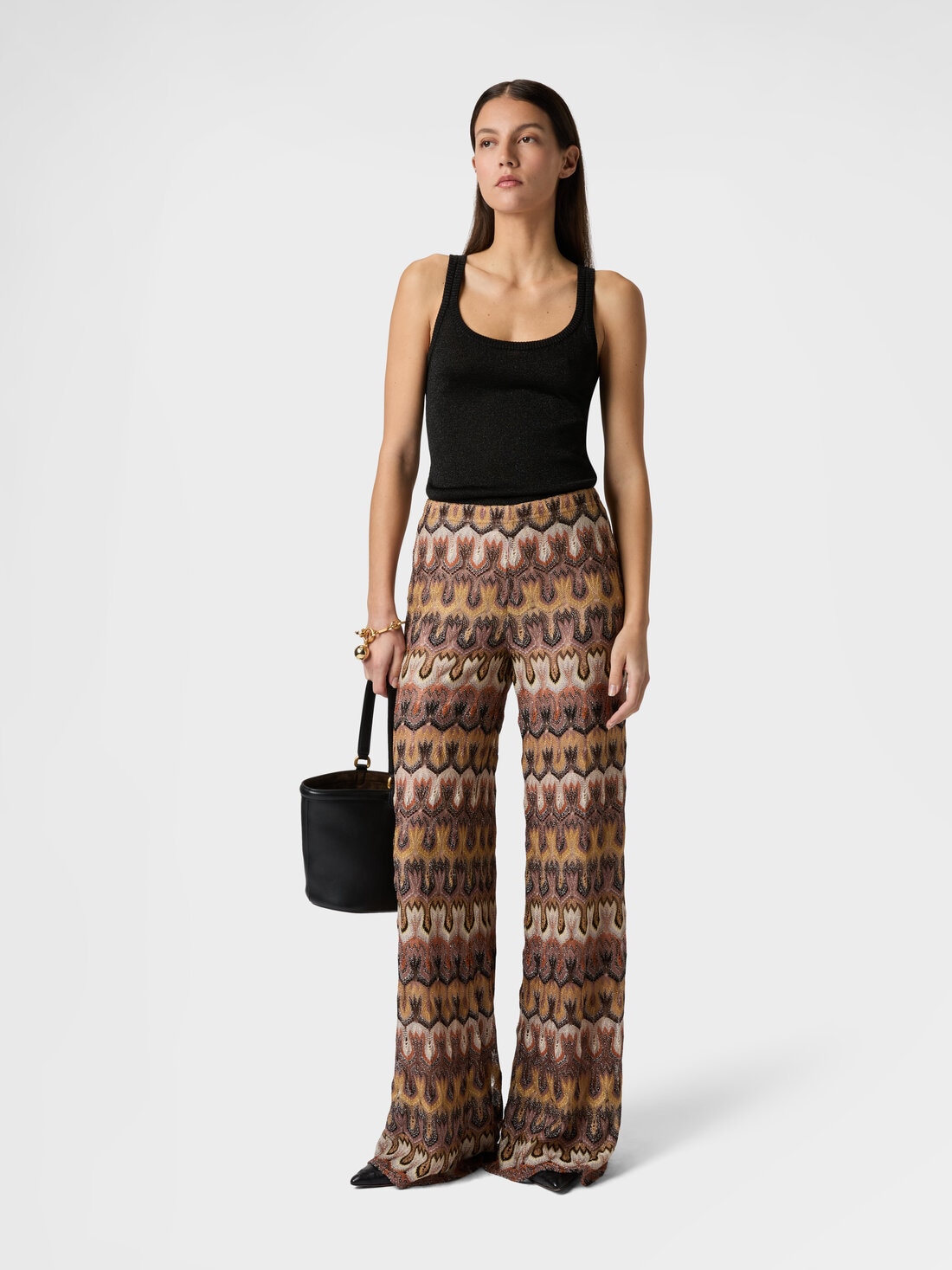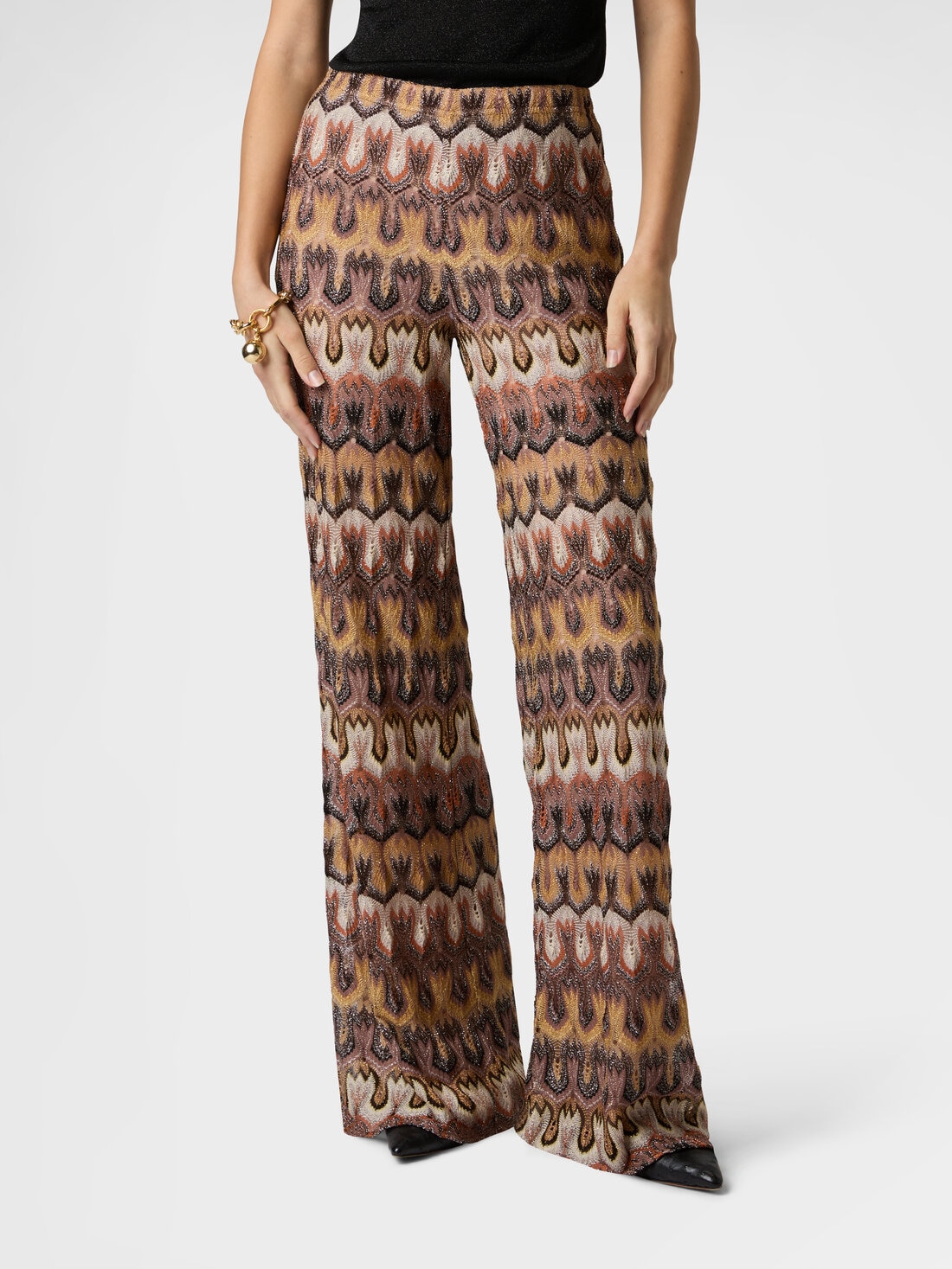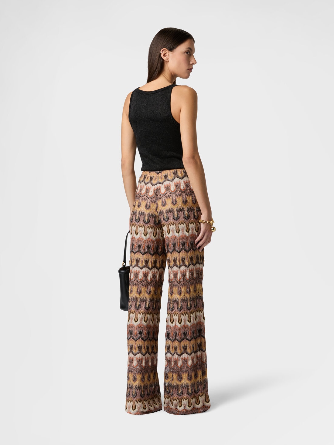 Une pièce à l’allure sophistiquée : ce pantalon palazzo pour femme en viscose lamé se distingue par un délicat travail raschel en dentelle arabesque.