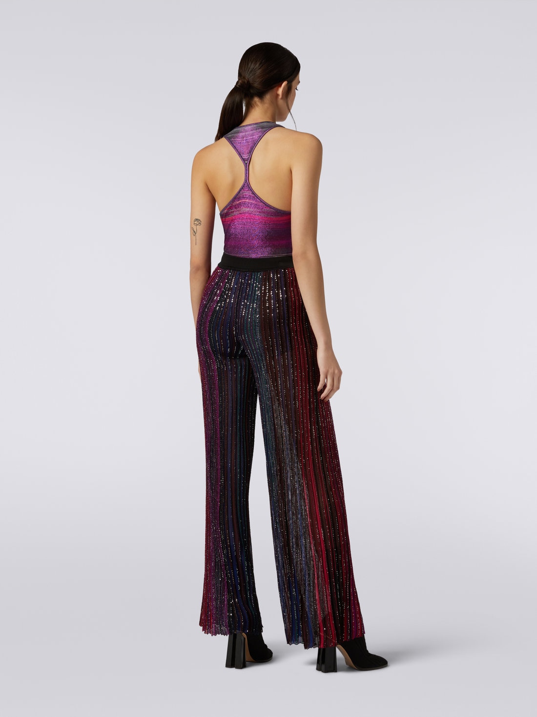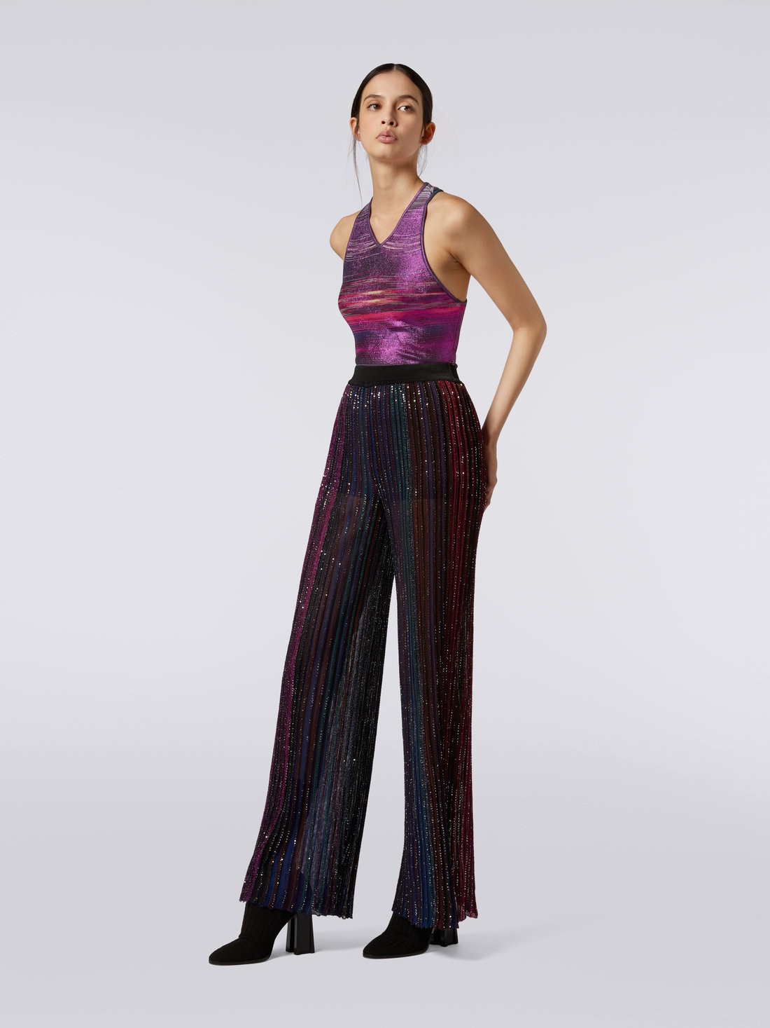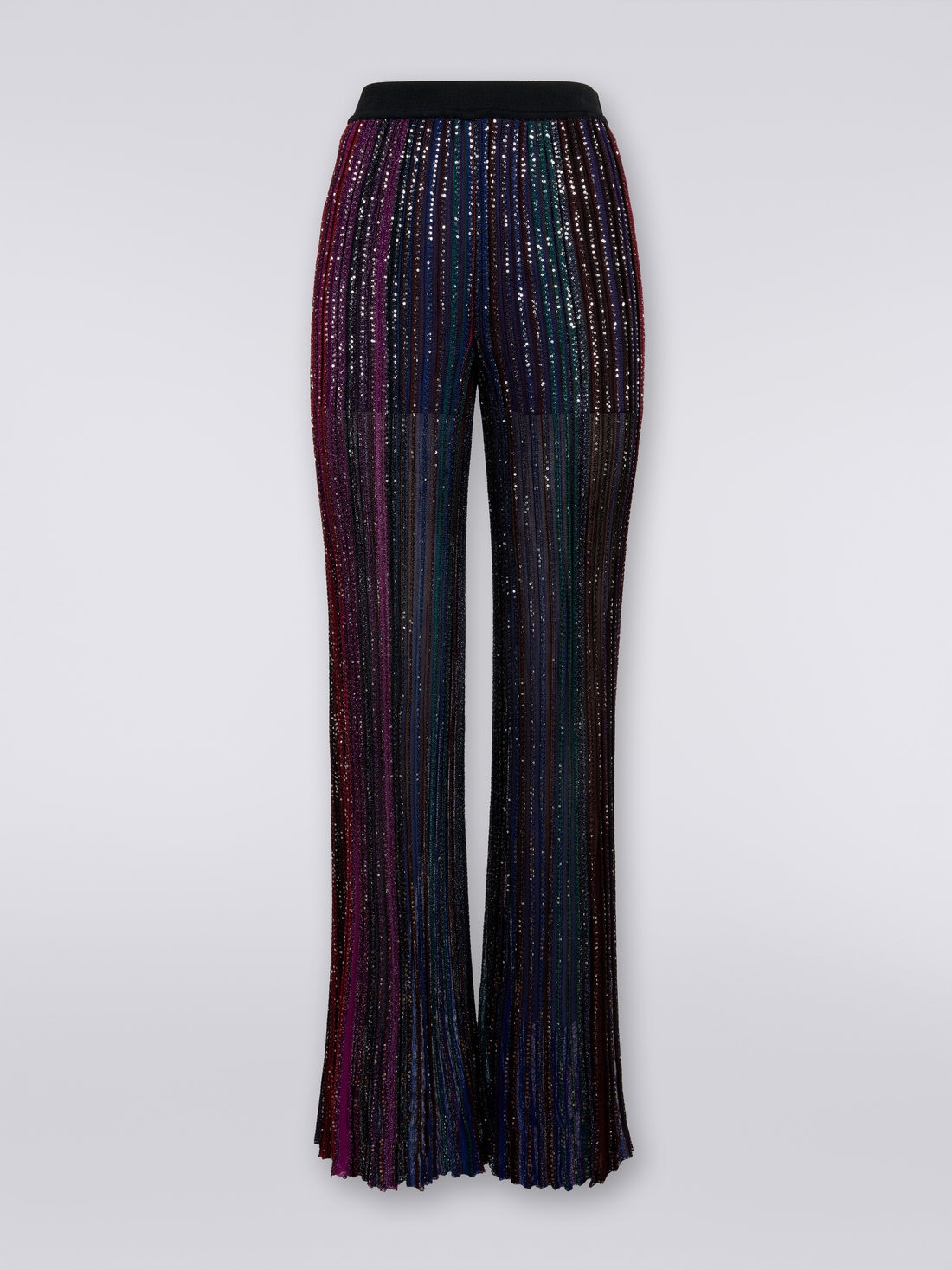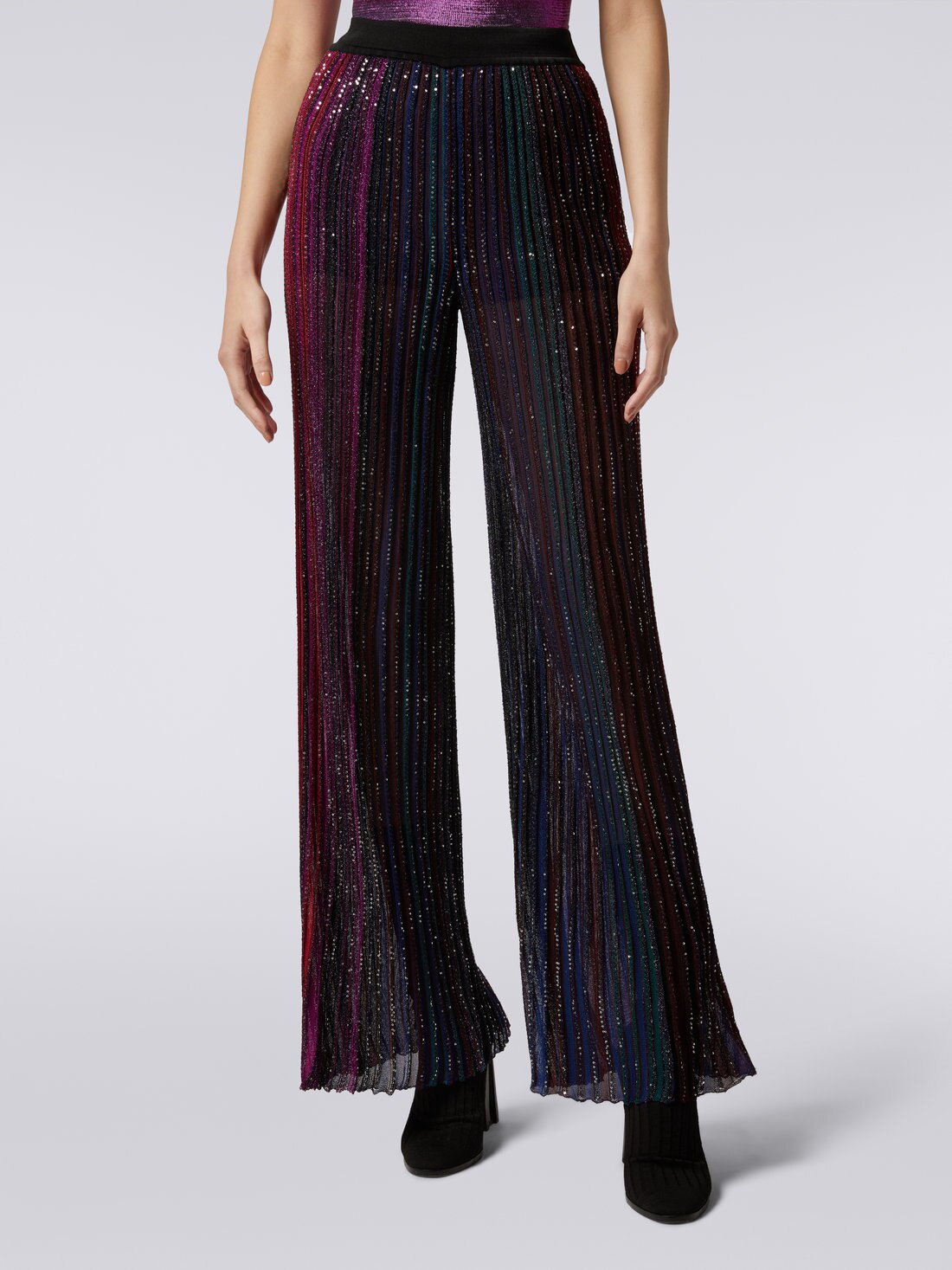 Les rayures verticales successives animent ce pantalon pour femme plissé entièrement recouvert de paillettes, d’une palette multicolore. Ce modèle évasé, doté d’une ceinture élastiquée de couleur unie, allie l’ADN Missoni à une touche nocturne chatoyante.