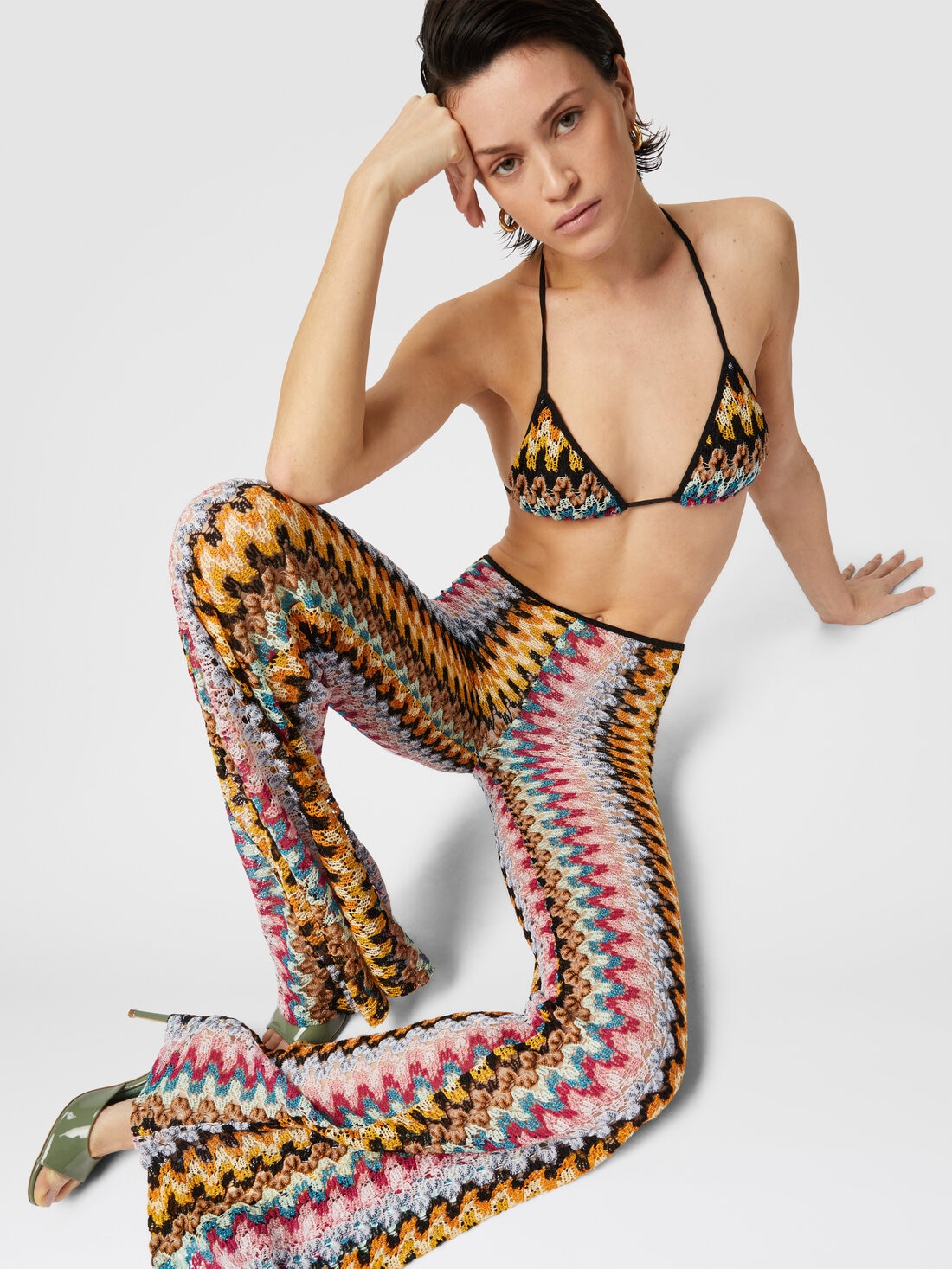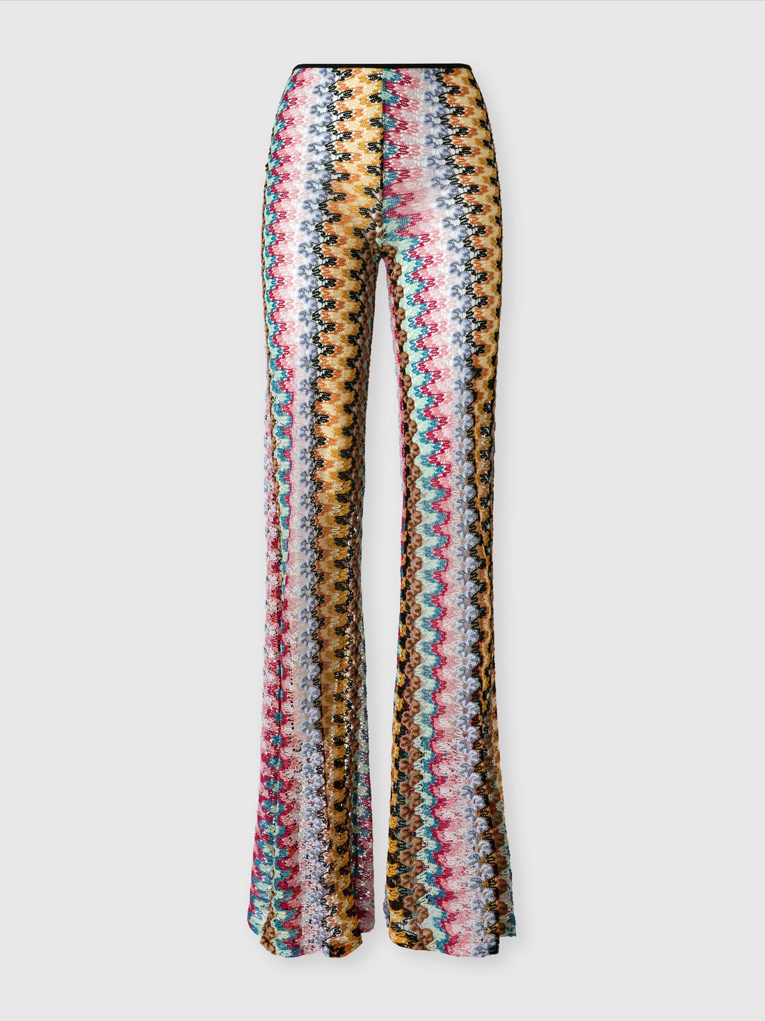 Des reflets chatoyants de lamé caractérisent ce pantalon évasé en dentelle de viscose signé Missoni. Le style élégant combine la délicatesse de la dentelle avec l'effet lumineux du lamé, offrant une interprétation sophistiquée de l'ADN de la marque. La taille basse qui se termine par un ourlet évasé donne au vêtement une silhouette élancée.