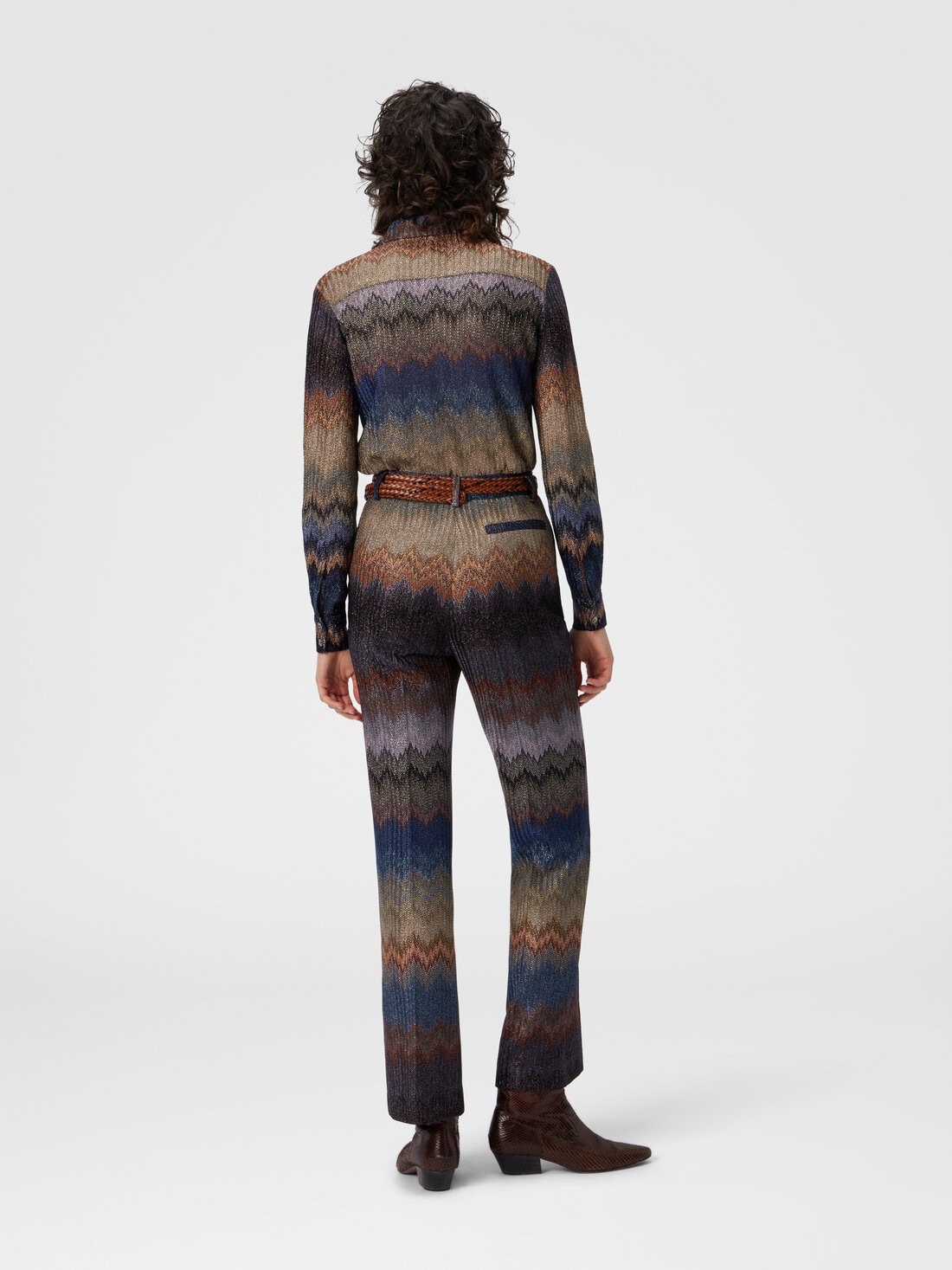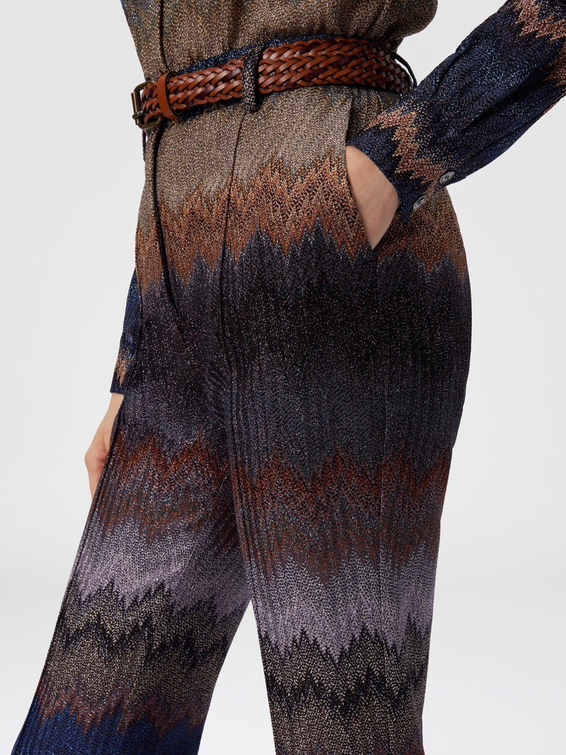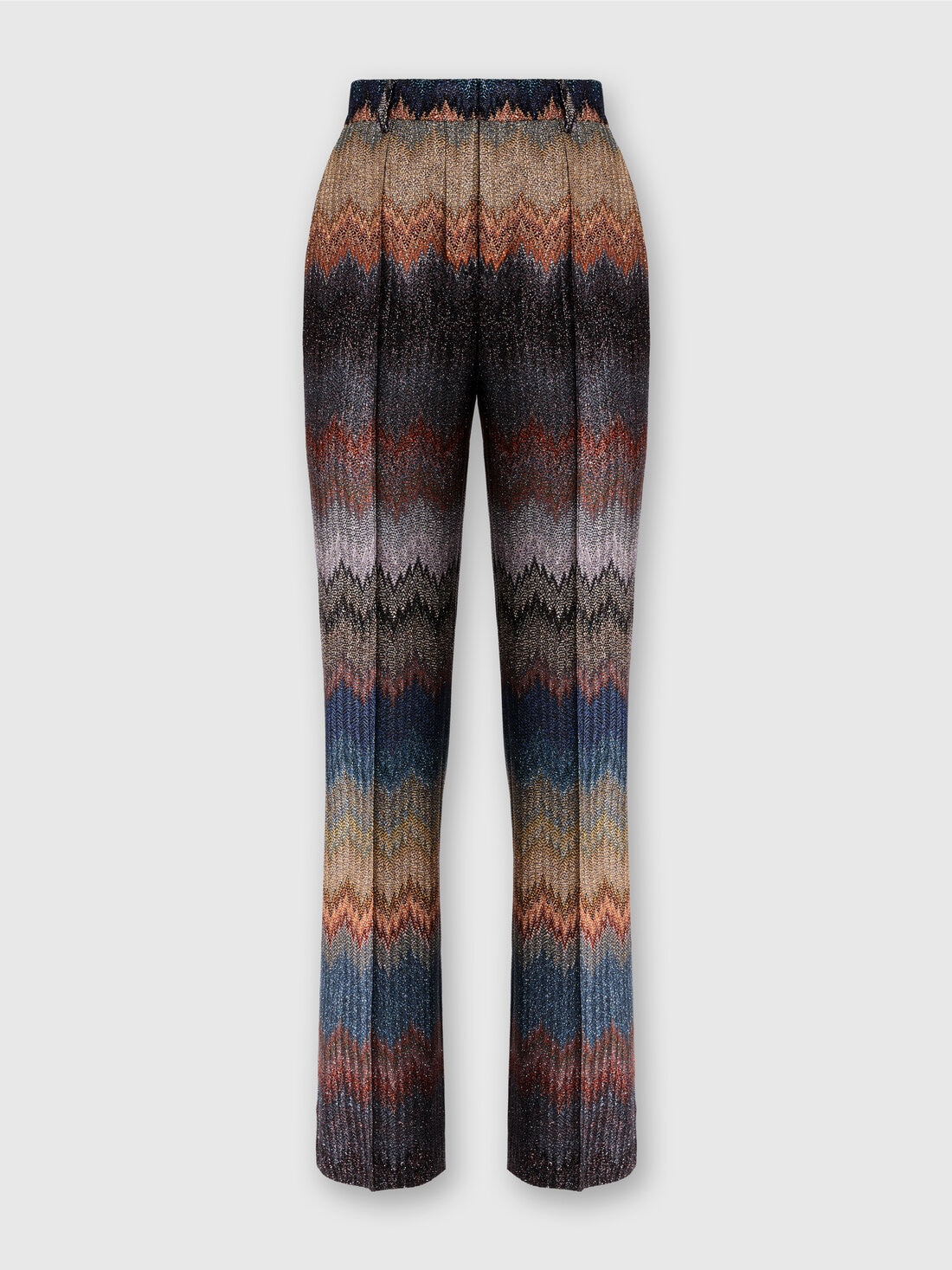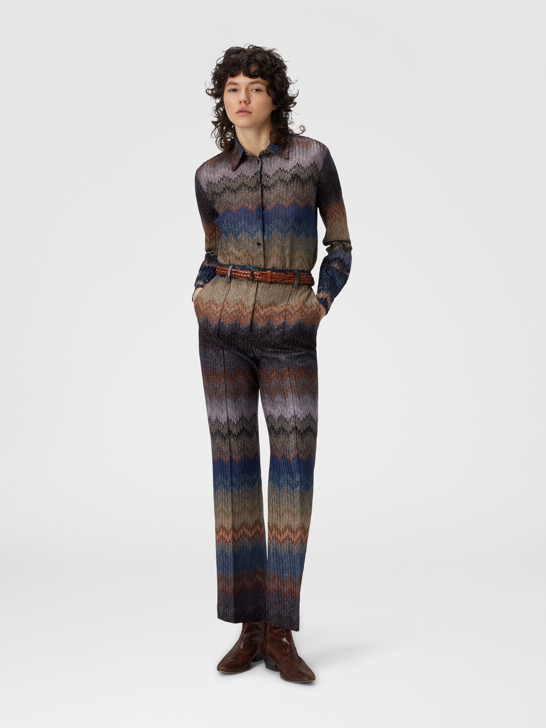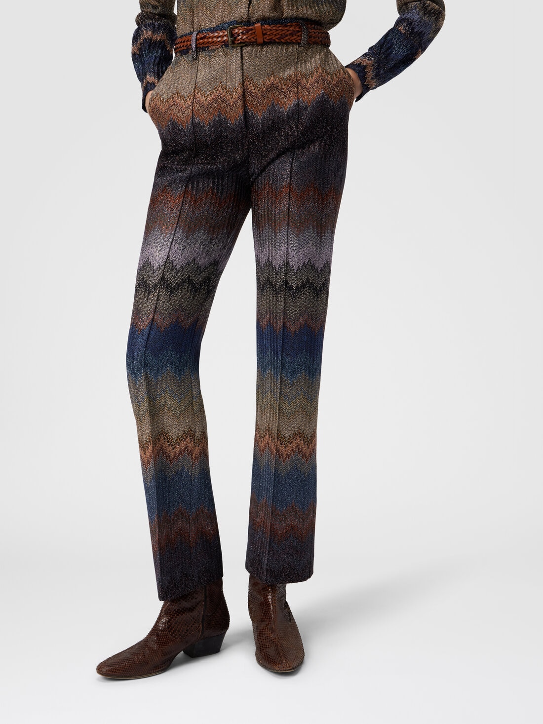 Un pantalon trompette pour femme à la silhouette audacieuse, caractérisé par une maille raschel qui crée une texture serpent unique. Réalisé en mélange de viscose avec des fils lamés, le vêtement capte la lumière avec des reflets métalliques pour un look sophistiqué et dynamique.